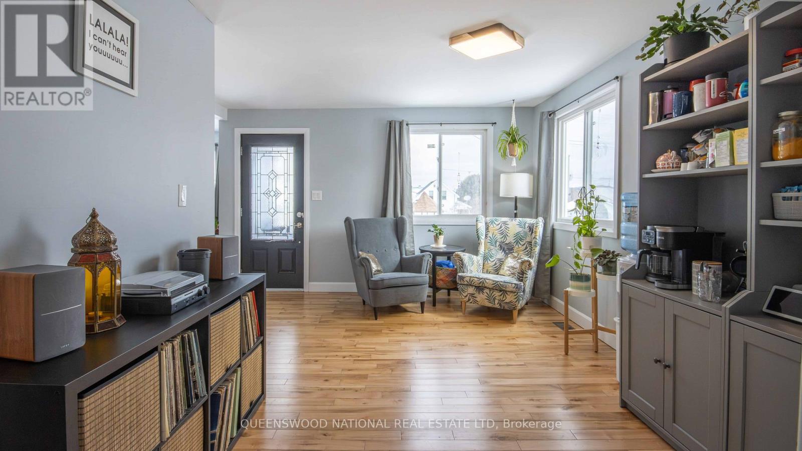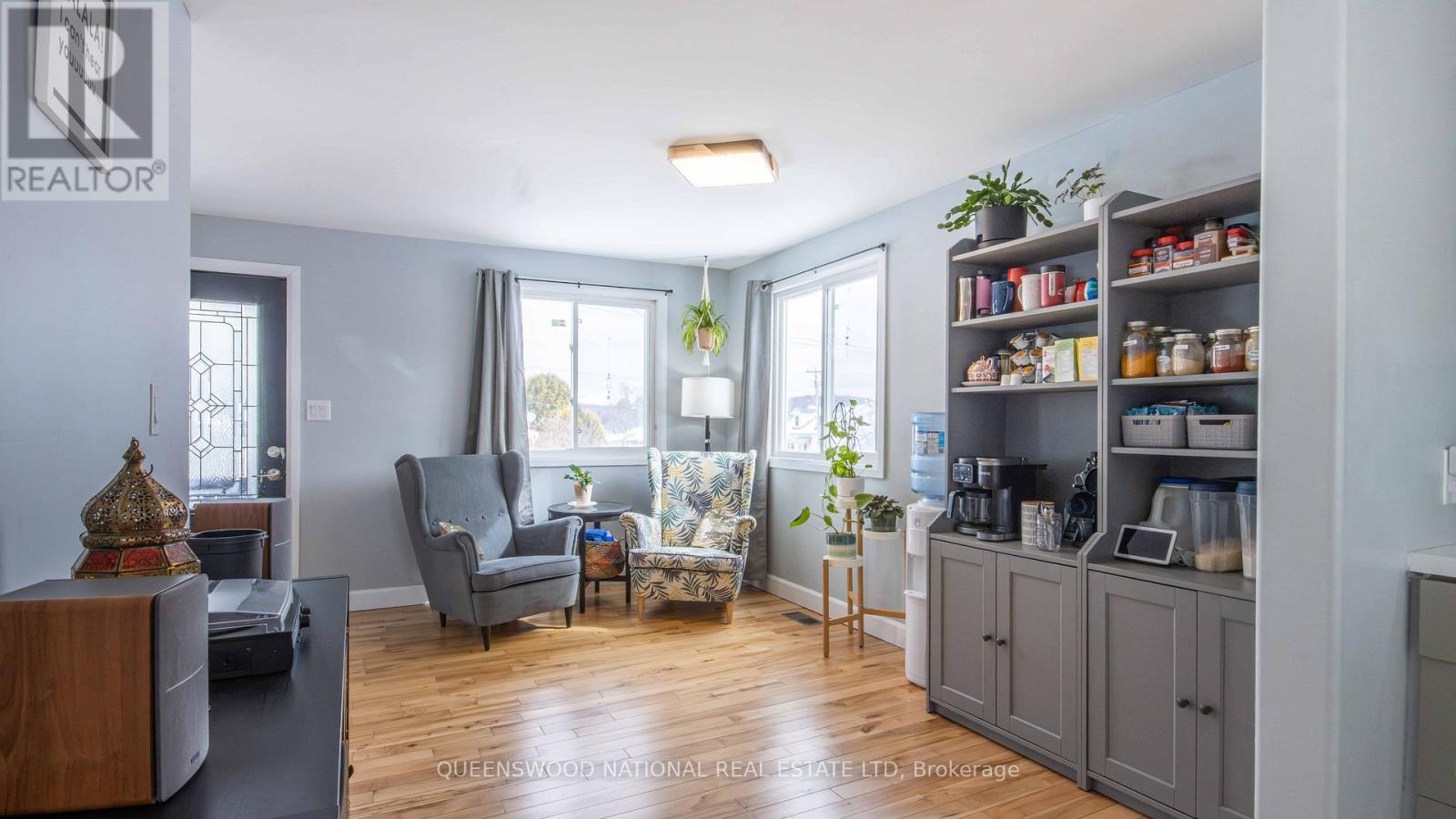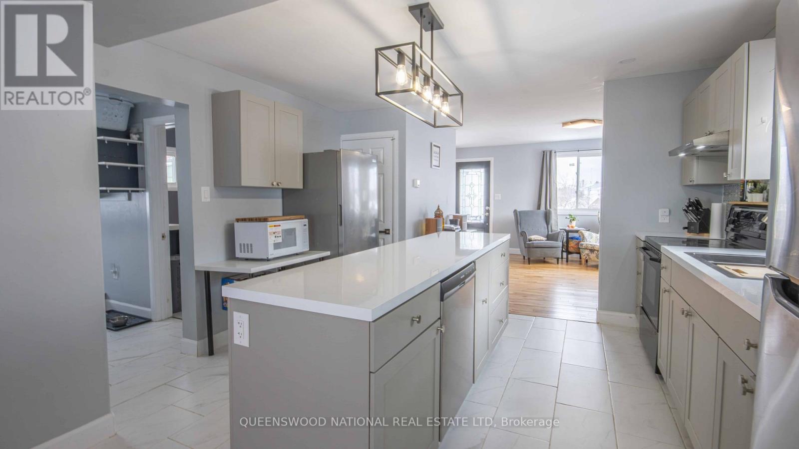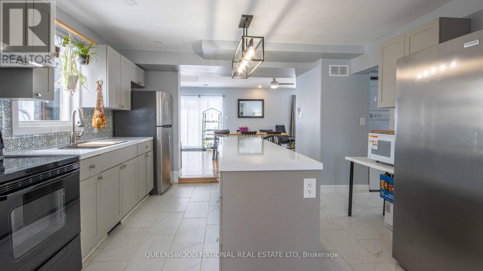 Welcome to your nearly-new sanctuary in the heart of Barry's Bay, where modern elegance meets the tranquility of nature. This meticulously fully renovated home offers the pristine feel of a new build, boasting two separate living spaces on the main floor separated by a chef-inspired kitchen-a layout ideal for large family gatherings. This culinary heart features a large kitchen island, expansive quartz countertops, and oversized ceramic tiles, while high-end hardwood and premium laminate flooring flow throughout the remainder of the home. Sliding doors lead from the main living area to a private retreat that backs onto a lush, tree-lined greenspace, all while being just steps away from the local hospital, library, boutique shopping, and dining. Designed for effortless living, the main floor also includes a convenient laundry room, a substantial walk-in storage closet, and a stunning oak staircase leading to the upper level.The upper level is thoughtfully designed for a growing family with four bedrooms in total, including three practical bedrooms and an expansive master suite that serves as a true showstopper. This primary retreat offers dramatic vaulted ceilings, a large walk-in closet, and a four-piece dream ensuite complete with double sinks. A versatile bonus nook on the upper level provides the perfect spot for a home office or quiet reading corner, adding to the home's functional layout. With three stylish bathrooms in total and the comfort of a high-efficiency forced-air propane furnace, every inch of this home has been optimized for quality and convenience. This is a rare opportunity to own a sophisticated, move-in-ready home that perfectly balances small-town charm with contemporary luxury. Furnace, roof, water heater, electrical and plumbing all newer 2022 (id:64974)