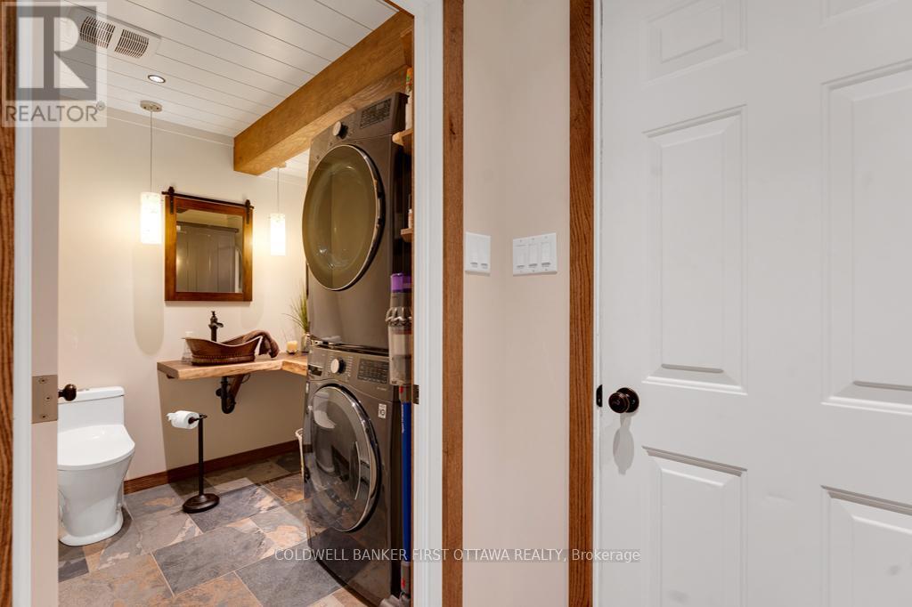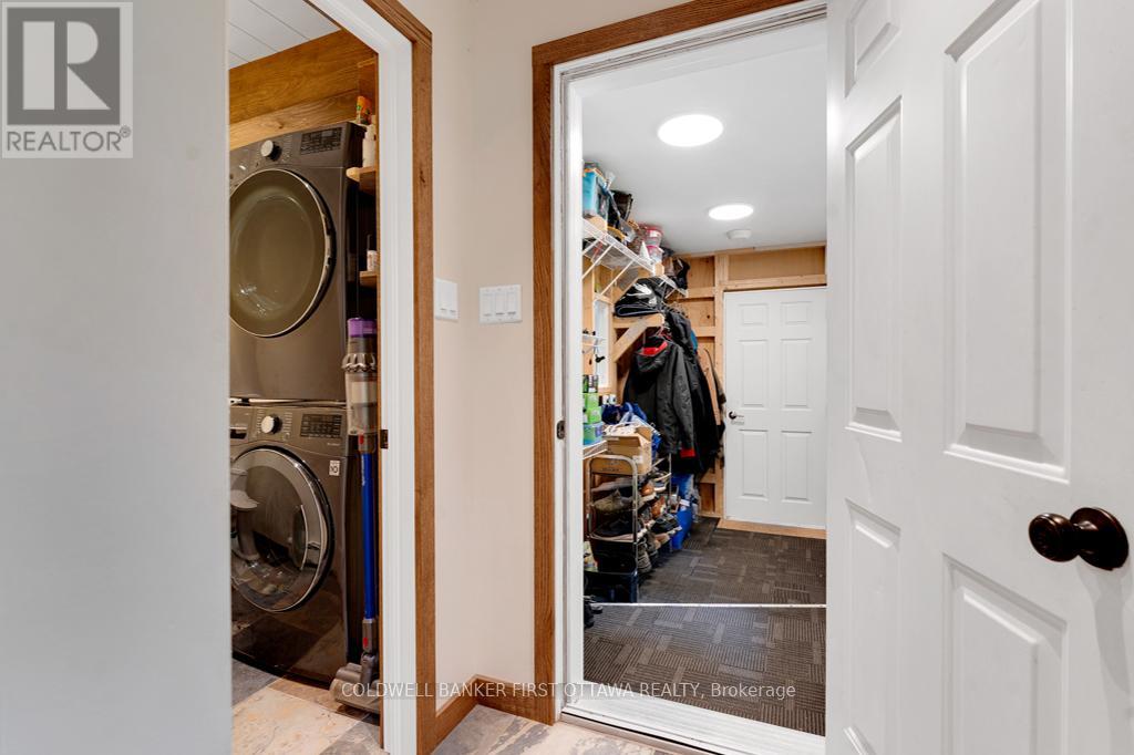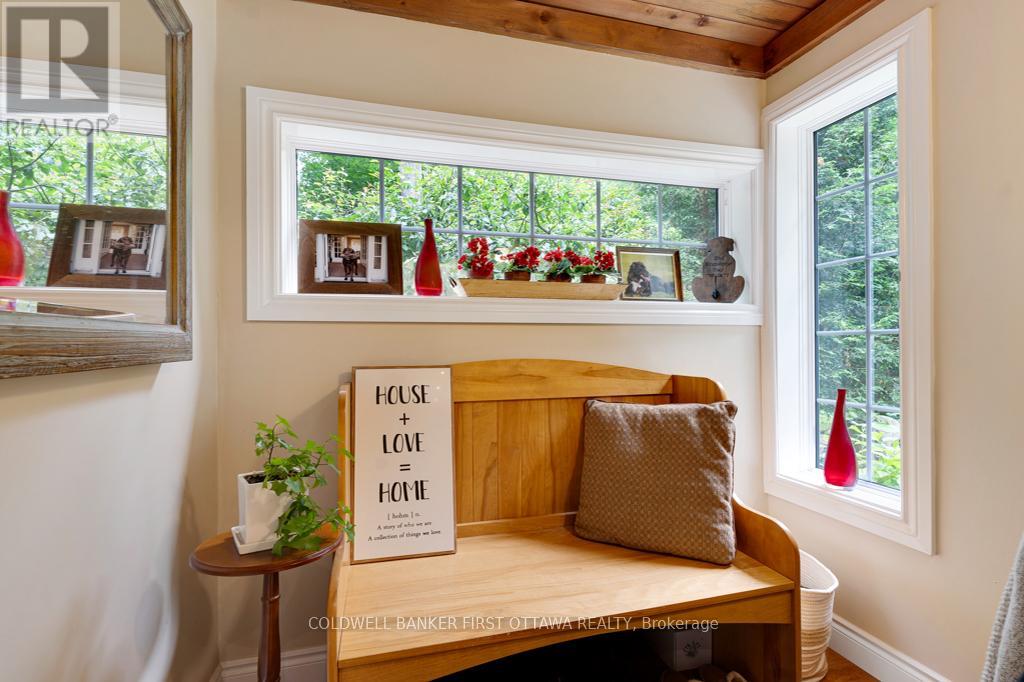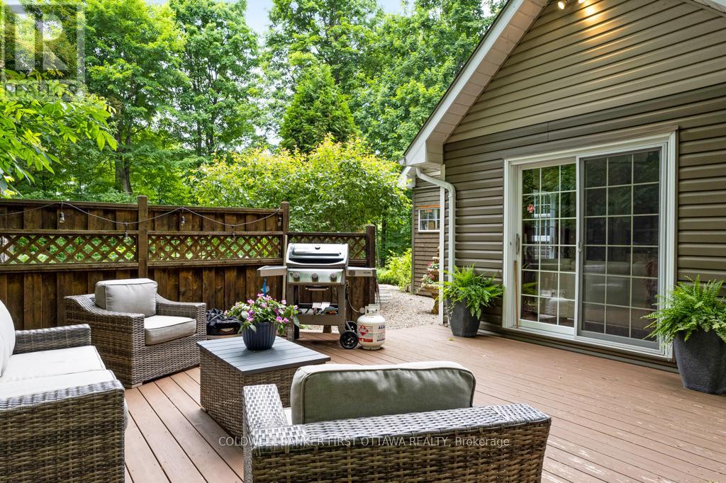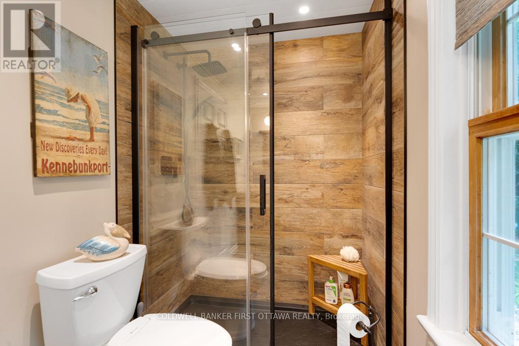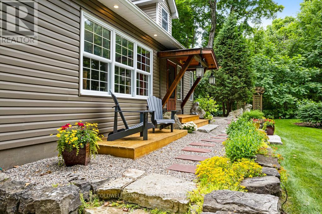 Easy to fall in love with this irresistible Cape Cod home and its landscaped gardens blending into the surrounding tranquility. On private acre that feels like a park, the three bedroom home has attached double garage plus detached double garage-workshop. The front walkway has deck perfectly designed for quiet times, watching spring perennials bloom and birds sing. Light-filled foyer adjacent to coat room with large windows. Open floor plan offers defined family spaces; never-ending walls of windows, maple floors and 8' ceilings with high-end recessed lights. Livingroom full of natural light flowing in from oversized windows and has stone fireplace with Jotul woodstove insert. Dining room wall of windows frame great outdoors. Contemporary 2022 kitchen with quartz counters, ceramic matte backsplash, island-breakfast bar, upscale appliances and Tiffany lights. Dinette has full-length windows giving you views of backyard oasis. Family room three sets of patio doors open to wrap-about deck with 2023 salt-water Artic Spa hot tub. Combined powder room & laundry station renovated 2024 with slate-like tile floor, decorative copper sink, custom wrap-about counter & shiplap ceiling. Mudroom door to garage and also door to yard. Upstairs, you have office/flex room. Sunny spacious primary bedroom deep window dormers with built-in bench and, walk-in closet with window. Two more large bedrooms, one with walk-in closet. Second floor bathroom a delight; all renovated 2023 with gorgeous custom vanity & luxury rain-head glass shower. Home has radiant hot water heating with wall radiators and 2025 propane boiler. Mini-split 2019 A/C. Hot water on demand 2025. Auto Generac can power whole home. Attached garage has epoxy floor & 240 V. Detached garage insulated, 250V, hoist, floor drains, windows & big loft. Hi-speed. Cell service. Located on paved township paved road with garbage pickup & school bus route. Just 4 mins to Lower Rideau Lake boat launch. 10 mins to Smiths Falls or Perth. (id:64974)