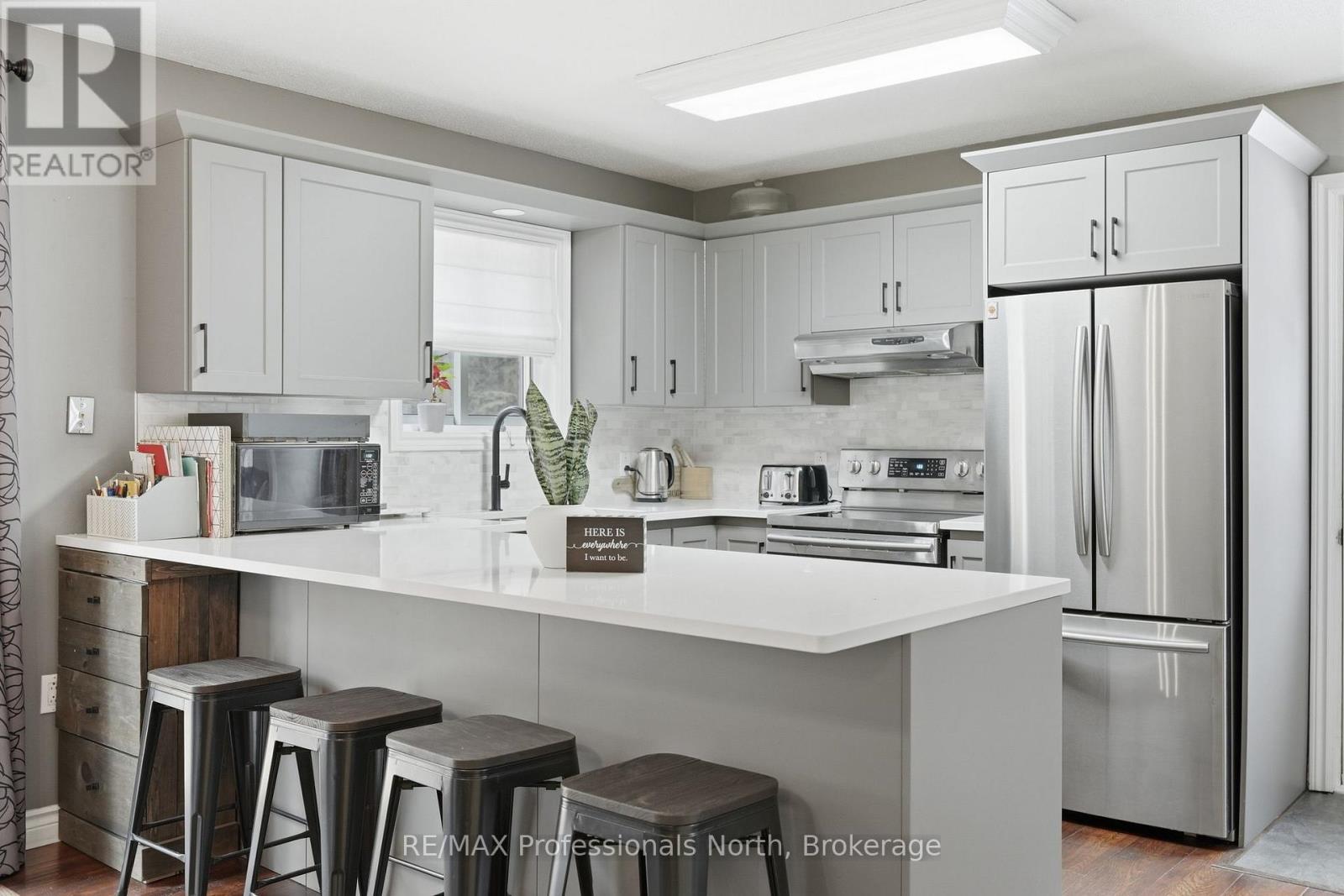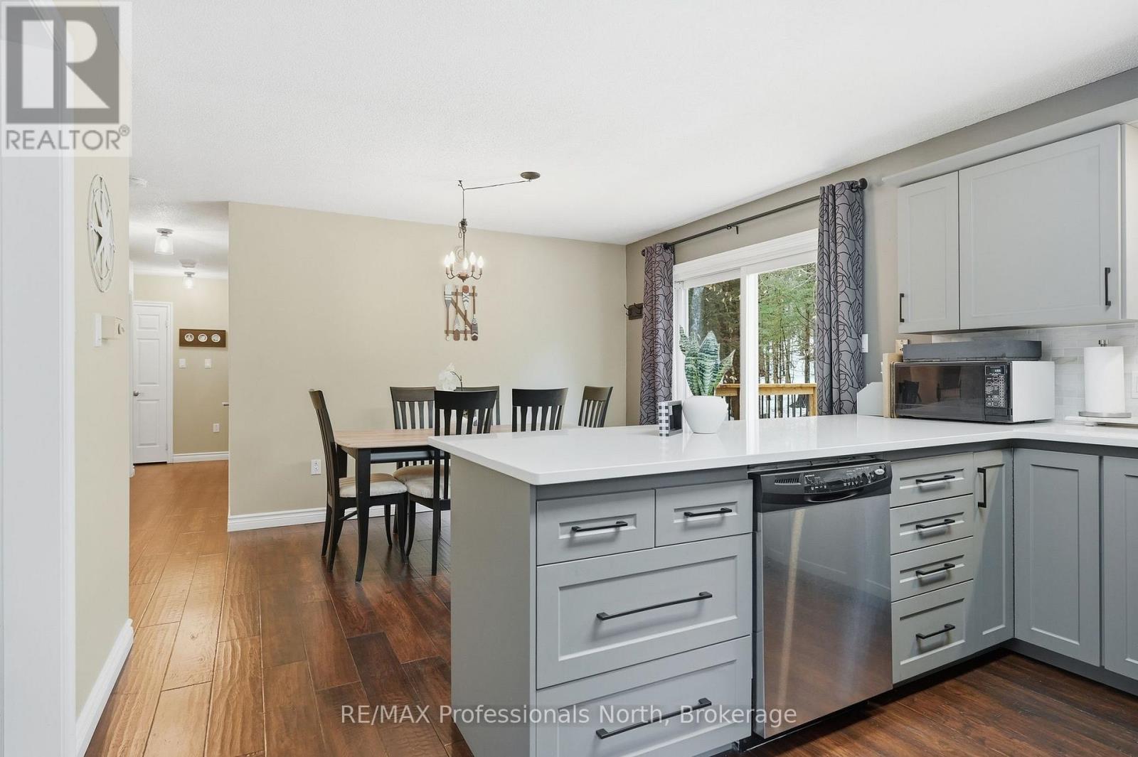 Tucked into the natural beauty of Muskoka, this impeccably kept country bungalow offers the perfect blend of everyday comfort and year-round adventure. Lovingly maintained and thoughtfully updated, the home features a refurbished kitchen with timeless yet on-trend cabinetry, quartz countertops, and a welcoming breakfast bar-perfect for slow mornings or casual entertaining. The dining area walks out to a newly installed, generously sized deck, ready for summer BBQs, evening gatherings, and peaceful morning coffee surrounded by nature.The light-filled living room creates a warm and inviting space to unwind, while engineered hardwood flooring flows seamlessly throughout the main level. Here you'll find three comfortable bedrooms and a well-appointed full bath ideal for families or those looking for easy one-level living. Downstairs, the fully finished lower level offers impressive extra high ceilings and large windows that bring in natural light making it feel anything but below grade. With two additional bedrooms, a full bath, and a spacious rec room anchored by a cozy corner wood stove, it's the perfect setup for guests, extended family, or a blended household. A brand new septic system adds peace of mind, while the location truly shines for those who love the outdoors. Just minutes to Lake Vernon access for a refreshing swim or a quiet cast of the line, and only two minutes to the marina where you can rent a boat slip and explore the sought after four-lake chain. Snowmobile trails are nearby, making winter just as exciting as summer. Whether you're looking for a full-time home or a Muskoka retreat, this property brings together comfort, style, and the lifestyle you've been waiting for. (id:64974)