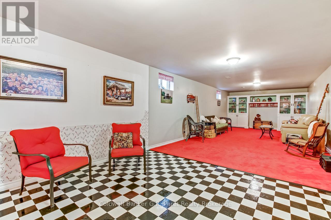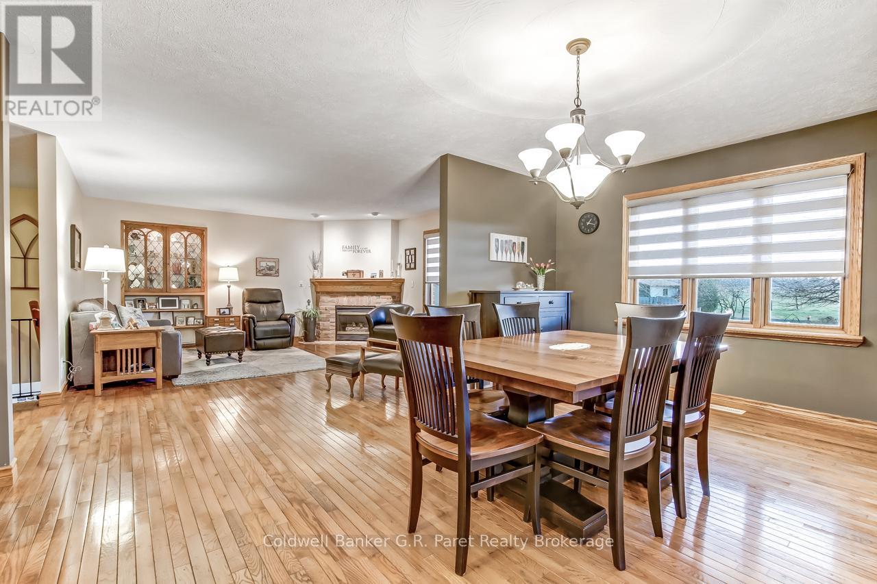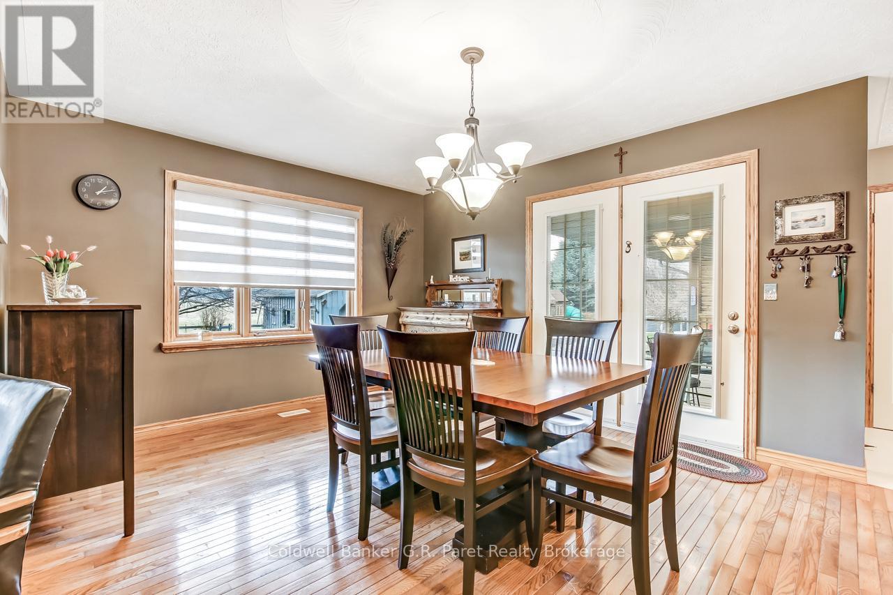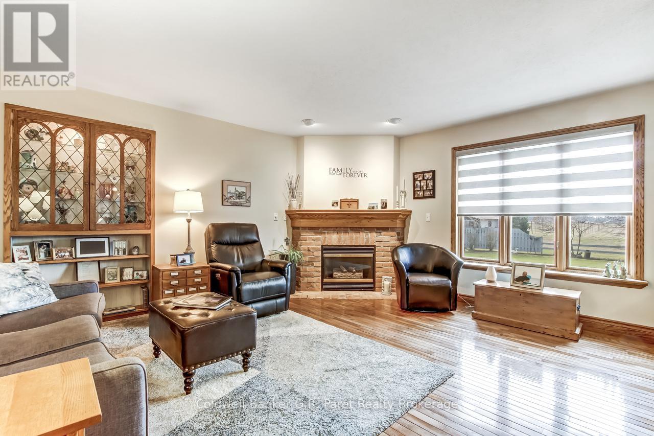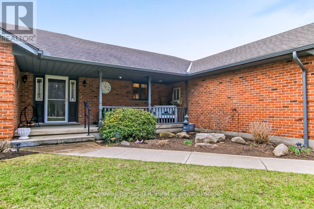 Welcome to the country! This custom-built bungalow offers 3+1 bdrms & 3 baths, providing plenty of space for a growing family. Designed and constructed by Dalm Construction, the home features rich hdwd flooring, cabinetry, and trim throughout. Step inside to a large main foyer highlighted by an open staircase. The spacious great room features a lovely gas fireplace and large picture windows overlooking the backyard. The attached dining room offers French doors that open to the covered patio. The oak kitchen is both functional & stylish, complete with a modern painted peninsula island with eating bar. A rear mud room and a combined 3pc bath/laundry room is also located on the main floor. Three well sized bedrooms, each featuring new, high quality laminate flooring and ample closet space. The main bath has been professionally renovated (2025) and showcases a glass walk-in shower, soaker tub, and a custom vanity. The lower level features a unique retro 1950's style rec room, complete with a classic wet bar & built-in chrome stools. An additional bedroom and 2pc. bath are located on this level. The expansive utility/storage room provides plenty of space and includes a secondary staircase leading to the oversized double car garage, which also features extra storage and a drop down attic access. The home's reclaimed brick exterior adds timeless charm and exceptional curb appeal. Outdoors, a large detached shop measuring 23.6' x 24' is perfect for hobbyists or car enthusiasts, complete with benches, hydro and upper attic access. A separate shed provides additional garden tool storage, while the expansive driveway accommodates 10+ vehicles with ease. Enjoy peaceful views of open farmland from the generous backyard, featuring lavish gardens, and a beautifully built covered deck ideal for relaxing or entertaining. A covered front porch completes the home's welcoming exterior. This first time offered home has been meticulously maintained by the original owners for 30 years! (id:64974)