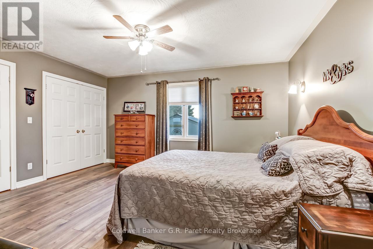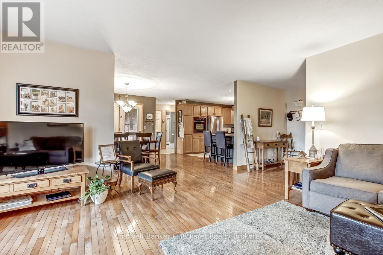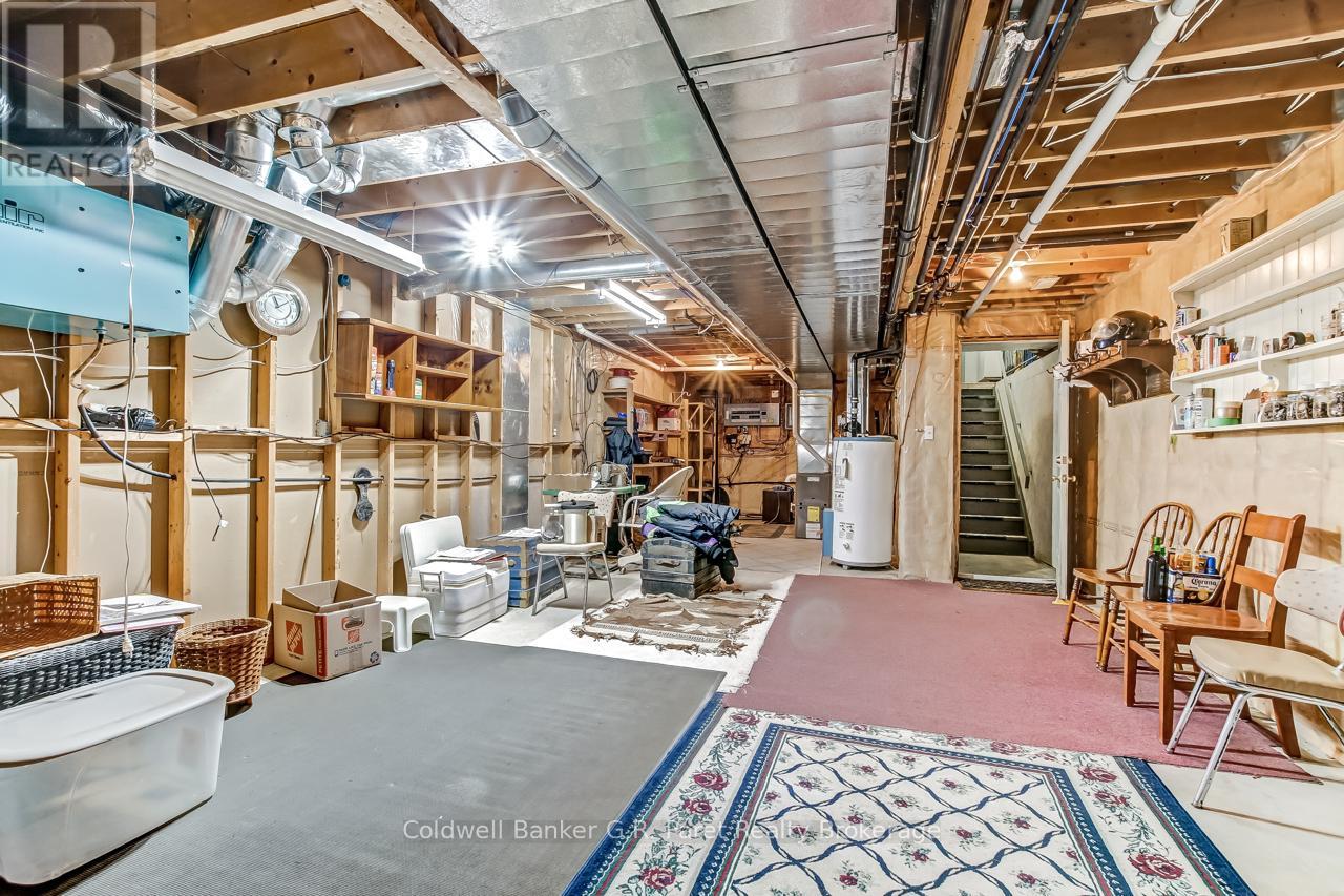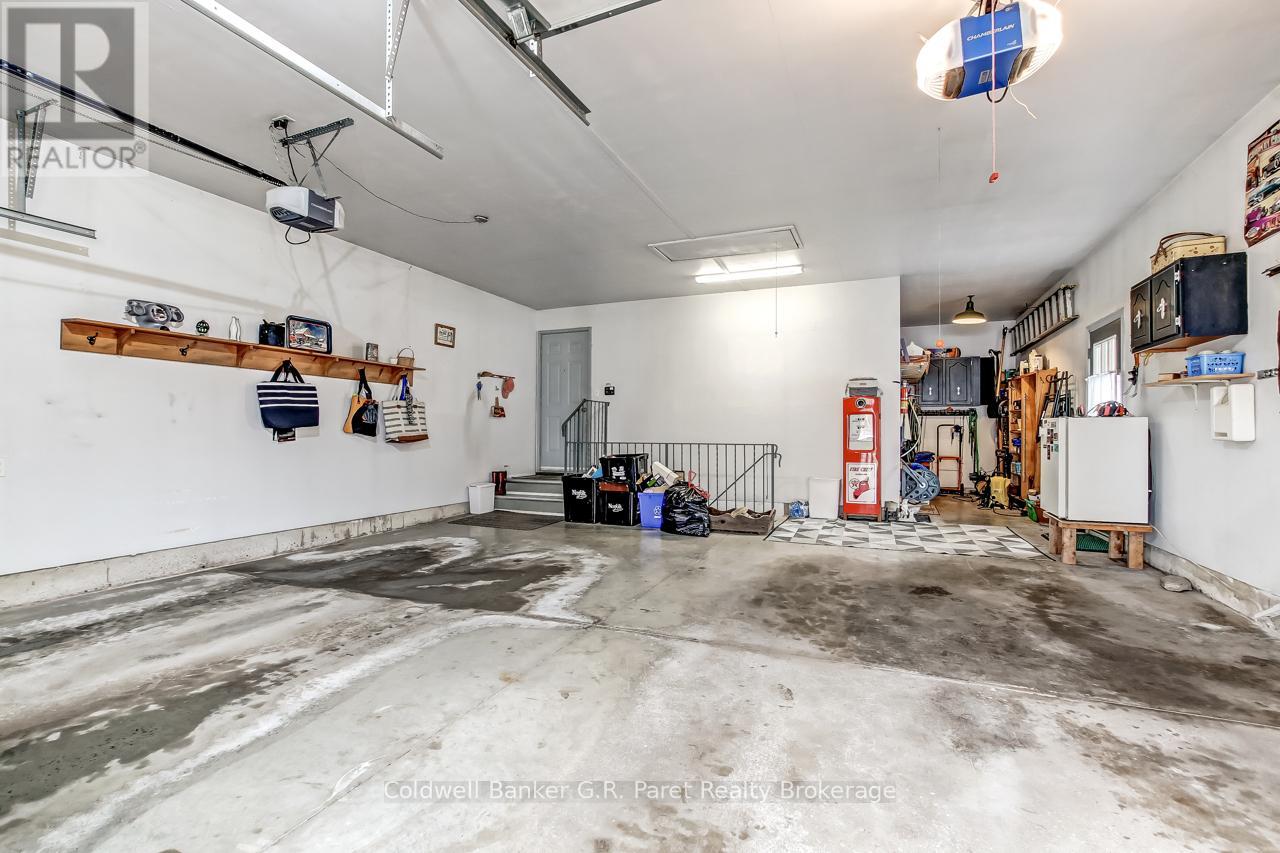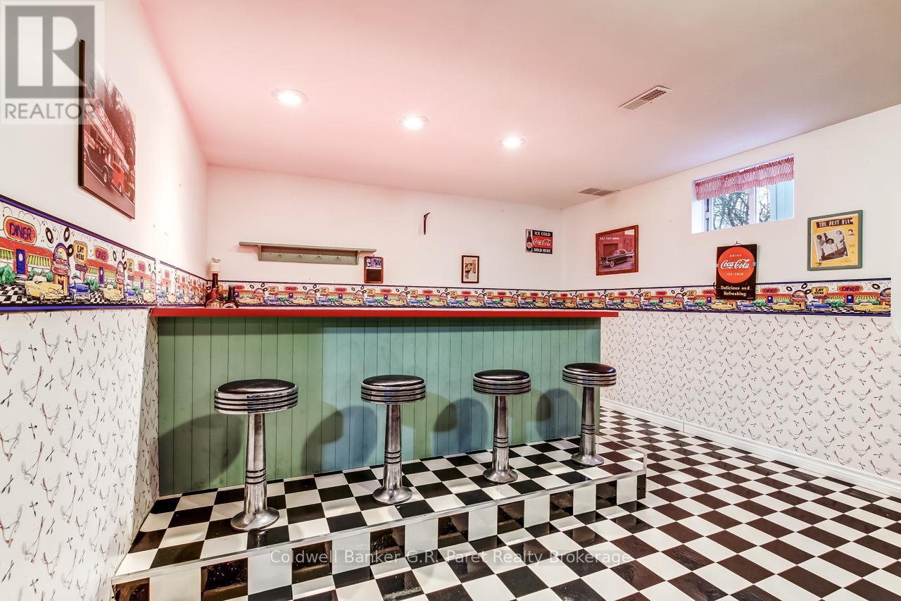 Welcome to the country! This custom-built bungalow offers 3+1 bdrms & 3 baths, providing plenty of space for a growing family. Designed and constructed by Dalm Construction, the home features rich hdwd flooring, cabinetry, and trim throughout. Step inside to a large main foyer highlighted by an open staircase. The spacious great room features a lovely gas fireplace and large picture windows overlooking the backyard. The attached dining room offers French doors that open to the covered patio. The oak kitchen is both functional & stylish, complete with a modern painted peninsula island with eating bar. A rear mud room and a combined 3pc bath/laundry room is also located on the main floor. Three well sized bedrooms, each featuring new, high quality laminate flooring and ample closet space. The main bath has been professionally renovated (2025) and showcases a glass walk-in shower, soaker tub, and a custom vanity. The lower level features a unique retro 1950's style rec room, complete with a classic wet bar & built-in chrome stools. An additional bedroom and 2pc. bath are located on this level. The expansive utility/storage room provides plenty of space and includes a secondary staircase leading to the oversized double car garage, which also features extra storage and a drop down attic access. The home's reclaimed brick exterior adds timeless charm and exceptional curb appeal. Outdoors, a large detached shop measuring 23.6' x 24' is perfect for hobbyists or car enthusiasts, complete with benches, hydro and upper attic access. A separate shed provides additional garden tool storage, while the expansive driveway accommodates 10+ vehicles with ease. Enjoy peaceful views of open farmland from the generous backyard, featuring lavish gardens, and a beautifully built covered deck ideal for relaxing or entertaining. A covered front porch completes the home's welcoming exterior. This first time offered home has been meticulously maintained by the original owners for 30 years! (id:64974)