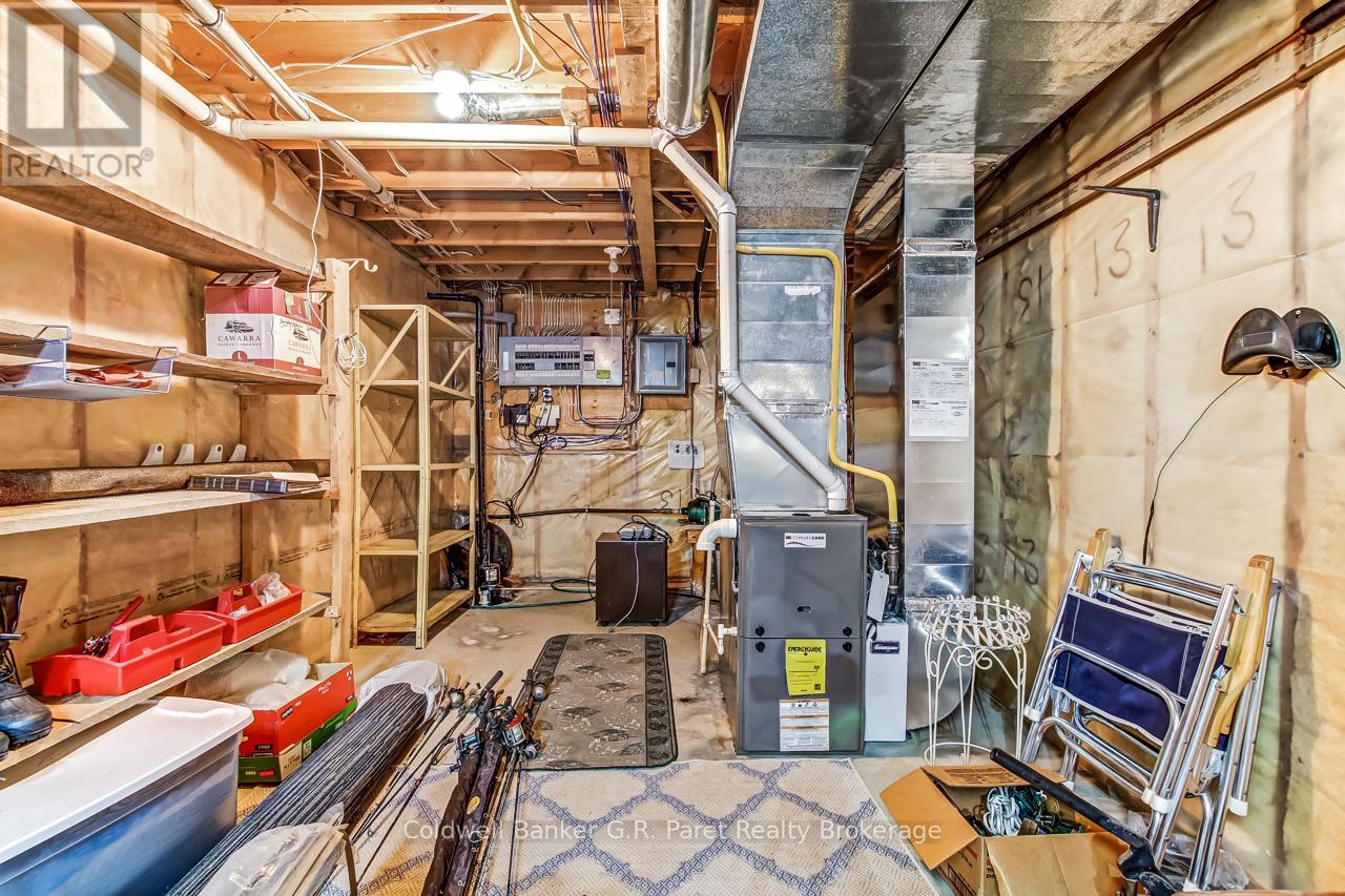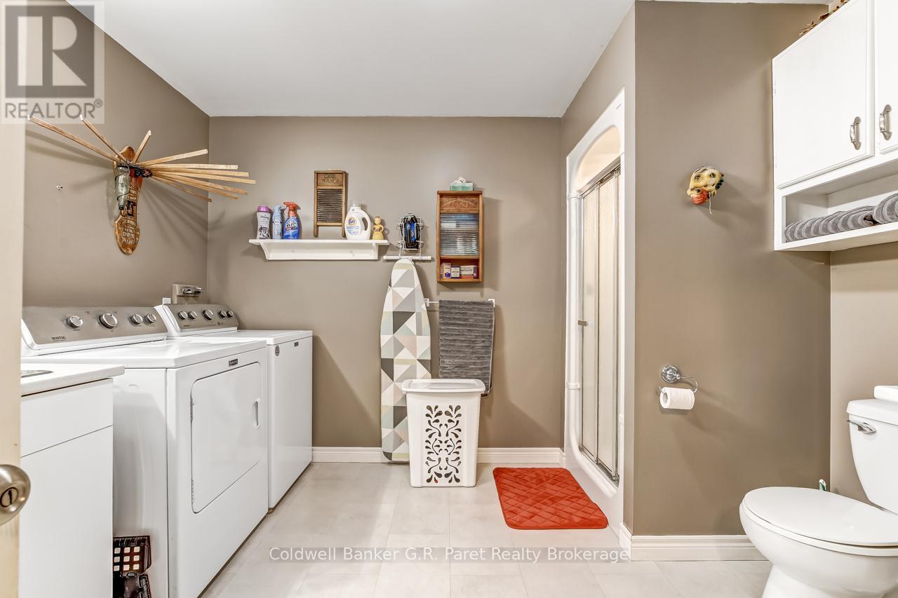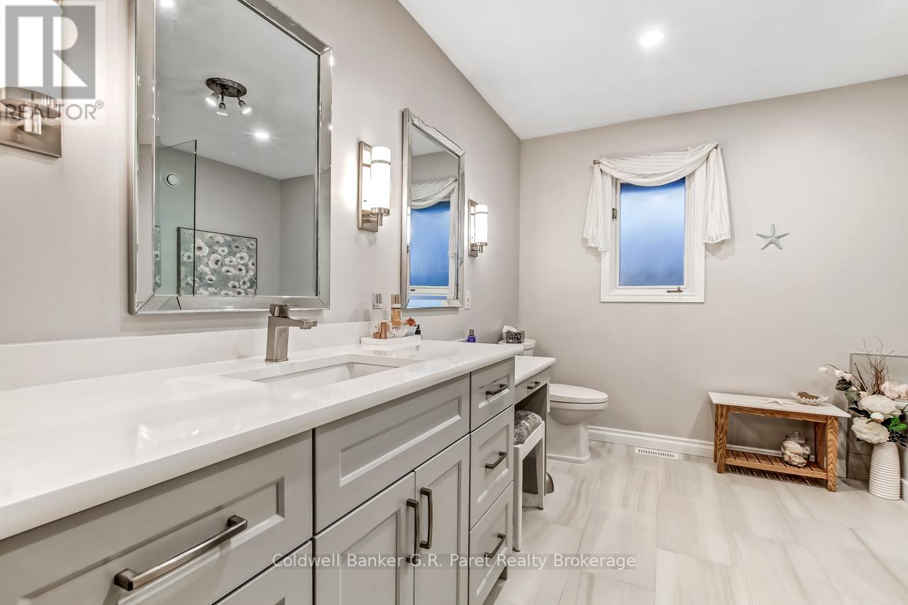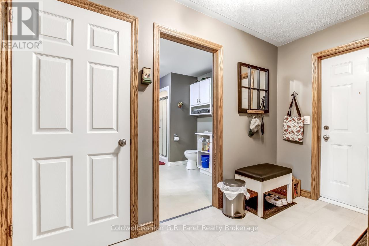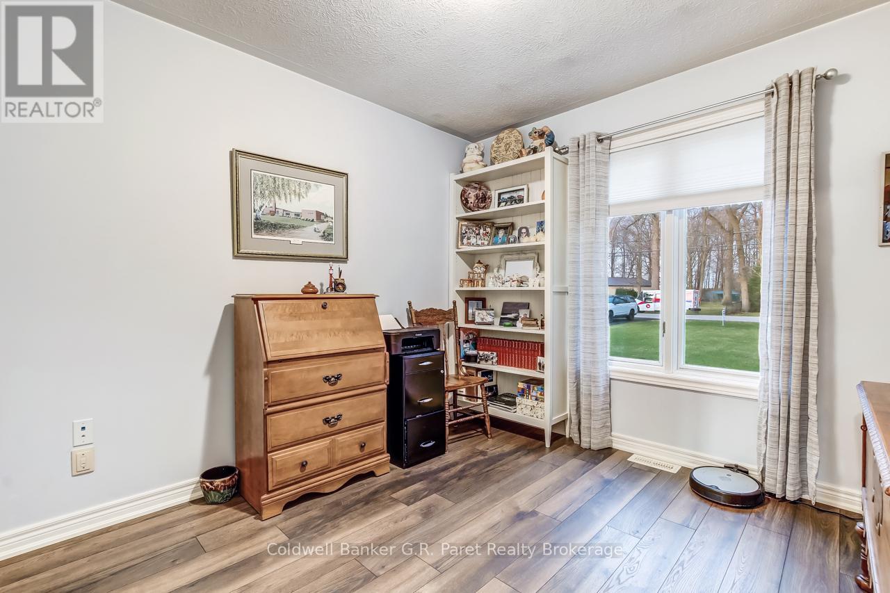 Welcome to the country! This custom-built bungalow offers 3+1 bdrms & 3 baths, providing plenty of space for a growing family. Designed and constructed by Dalm Construction, the home features rich hdwd flooring, cabinetry, and trim throughout. Step inside to a large main foyer highlighted by an open staircase. The spacious great room features a lovely gas fireplace and large picture windows overlooking the backyard. The attached dining room offers French doors that open to the covered patio. The oak kitchen is both functional & stylish, complete with a modern painted peninsula island with eating bar. A rear mud room and a combined 3pc bath/laundry room is also located on the main floor. Three well sized bedrooms, each featuring new, high quality laminate flooring and ample closet space. The main bath has been professionally renovated (2025) and showcases a glass walk-in shower, soaker tub, and a custom vanity. The lower level features a unique retro 1950's style rec room, complete with a classic wet bar & built-in chrome stools. An additional bedroom and 2pc. bath are located on this level. The expansive utility/storage room provides plenty of space and includes a secondary staircase leading to the oversized double car garage, which also features extra storage and a drop down attic access. The home's reclaimed brick exterior adds timeless charm and exceptional curb appeal. Outdoors, a large detached shop measuring 23.6' x 24' is perfect for hobbyists or car enthusiasts, complete with benches, hydro and upper attic access. A separate shed provides additional garden tool storage, while the expansive driveway accommodates 10+ vehicles with ease. Enjoy peaceful views of open farmland from the generous backyard, featuring lavish gardens, and a beautifully built covered deck ideal for relaxing or entertaining. A covered front porch completes the home's welcoming exterior. This first time offered home has been meticulously maintained by the original owners for 30 years! (id:64974)