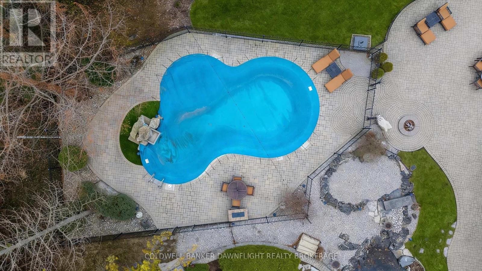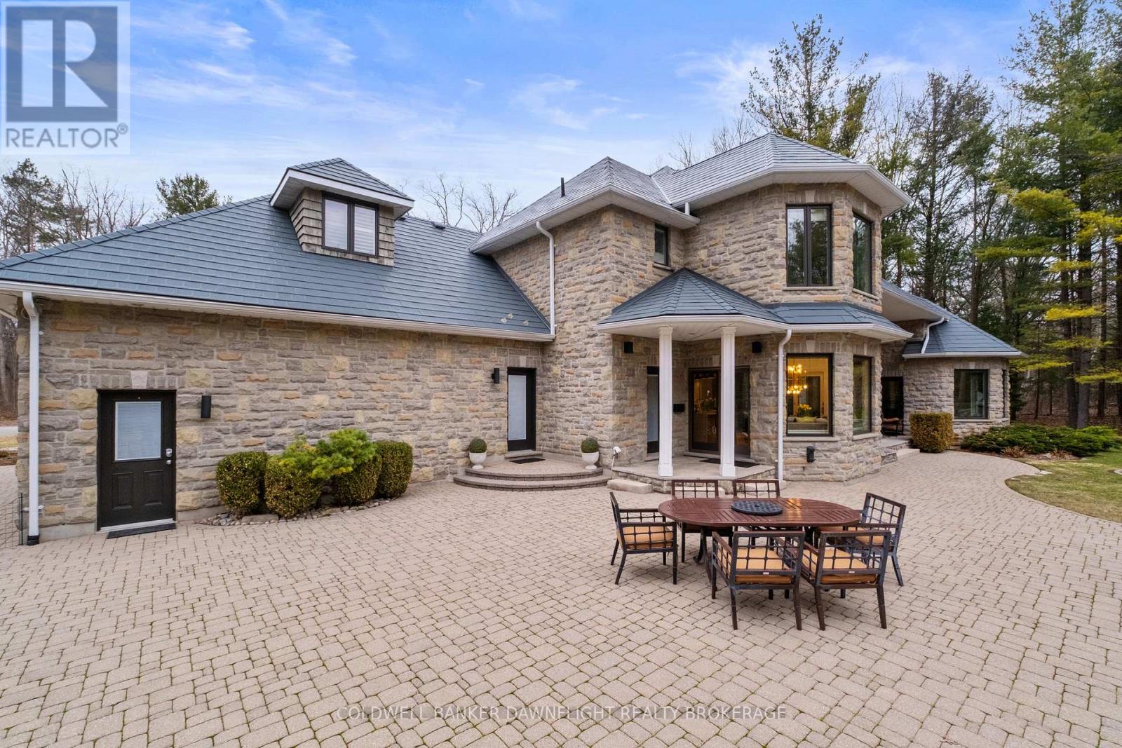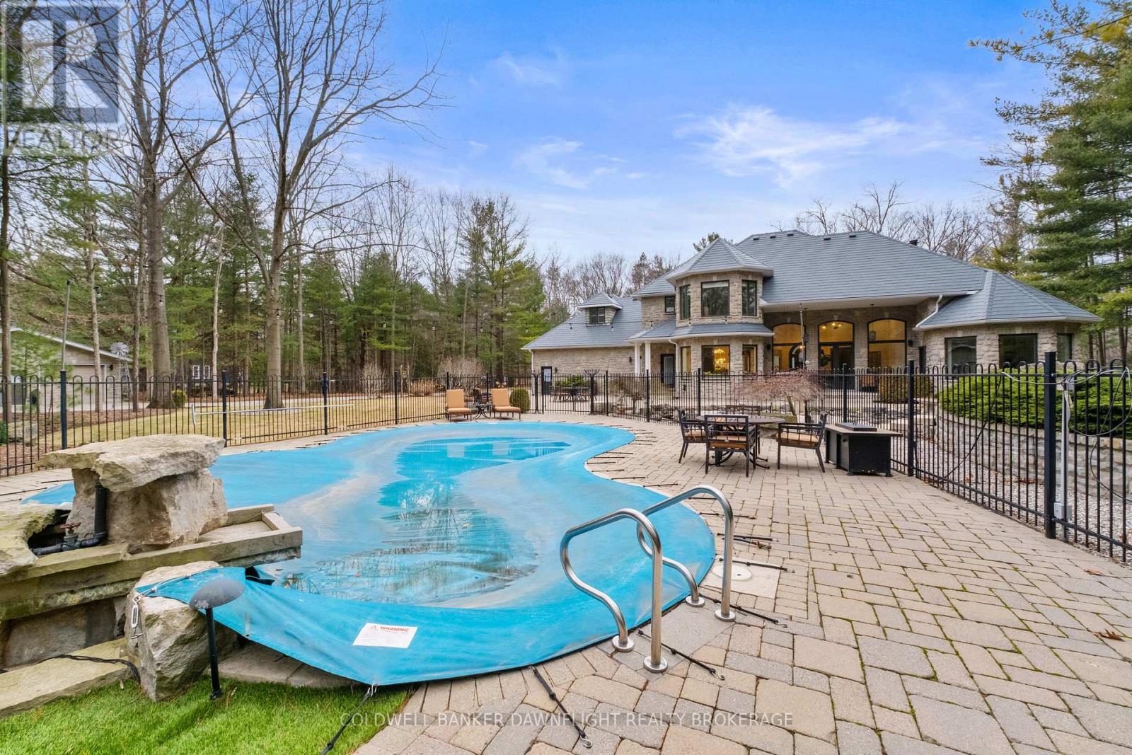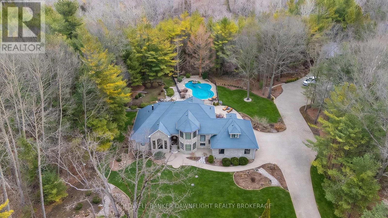 A custom-built home showcasing exceptional craftsmanship, this one-of-a-kind property features a striking Mennonite-crafted stone exterior and durable metal roof. A spacious driveway offers ample parking, ideal for hosting family and friends. Tucked into a private, tree-lined setting just minutes south of Grand Bend, the home provides a peaceful retreat. Inside, the layout blends comfort, space, and versatility. The well-appointed kitchen features a peninsula overlooking a built-in banquette, with beautiful views of the heated pool and resort-style outdoor space. The surrounding patio is perfect for relaxing or entertaining, while a pool shed provides convenient storage. A main-floor bathroom with direct backyard access enhances poolside living. Beyond the main outdoor area, two large heated steel-clad outbuildings offer exceptional flexibility for hobbies, workshops, or recreational vehicle storage. The formal dining room is filled with natural light, creating a warm atmosphere, while a stunning library off the front foyer showcases custom cabinetry and a rolling ladder. The primary suite enjoys a private wing and offers a serene escape, complete with a spa-like ensuite featuring double vanities, a freestanding tub, a walk-in shower with dual shower heads, and a separate water closet. A hallway of his-and-hers closets leads to the spacious bedroom with expansive windows and custom built-ins. Main-floor laundry and a locker room connect to the oversized two-car garage. Upstairs, three generously sized bedrooms and a four-piece bathroom accommodate family or guests. The fully finished lower level adds a wet bar with seating, multiple media areas, a bathroom with steam shower, a fifth bedroom, seasonal storage, and a dedicated gym. Set along a cleared path, a charming cabin overlooks a private pond-ideal for quiet mornings or evenings by the fire. This remarkable property blends privacy, luxury, and functionality for both everyday living and unforgettable gatherings. (id:64974)