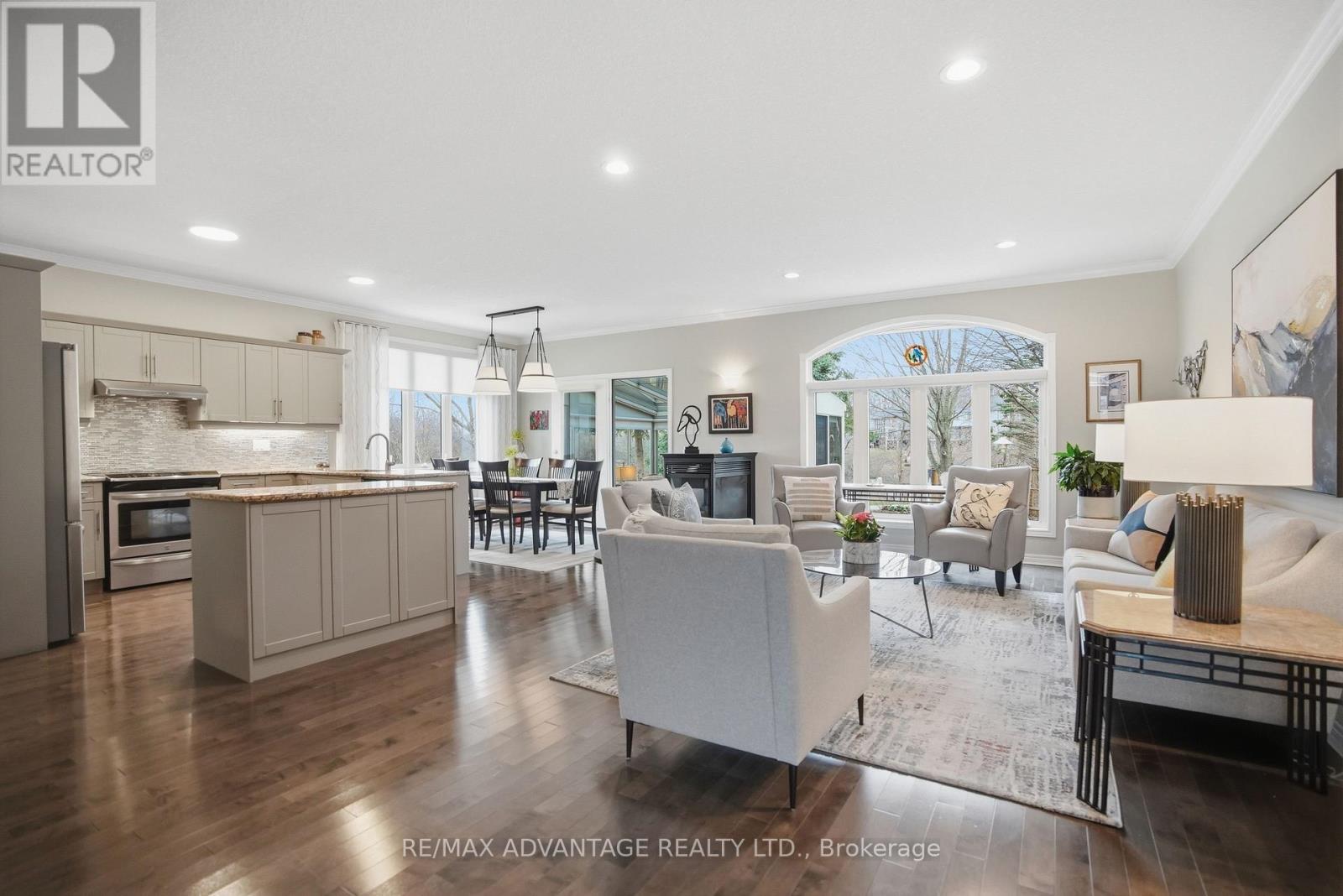 Welcome to this rare 2+2 bedroom open-concept bungalow - a true unicorn offering the best of city and cottage living. Offered for the first time ever on the market, this beautifully maintained home showcases a bright, airy main floor with a seamless flow between the kitchen, dining, and living areas. The space is enhanced by a stylish kitchen that features an island, modern cabinetry and granite countertops. The spacious living room features stunning three-sided fireplace that adds warmth and elegance. The primary bedroom features a private ensuite bathroom and walk-in closet. Rounding out the main floor is a second bedroom, a full 4-piece bathroom, and convenient main floor laundry adds to the ease of everyday living. Many upgrades over the years have brought a fresh, modern touch throughout. The finished lower level offers two additional bedrooms, a spacious family room with a cozy gas fireplace, and a 3-piece bathroom. Escape to the four season sunroom addition and enjoy picturesque views of the beautifully landscaped backyard and the tranquil pond next door-your own private retreat in the heart of the city. Frequent visitors include cranes, blue herons, king fishers, geese, ducks and much more. Additional updates include a new concrete driveway and walkway (2025), a grand front door entranceway (approx. 2018), and garage man door (2026). Complete with a spacious double car garage, this exceptional home blends comfort, charm, and convenience in one truly special package. (id:64974)