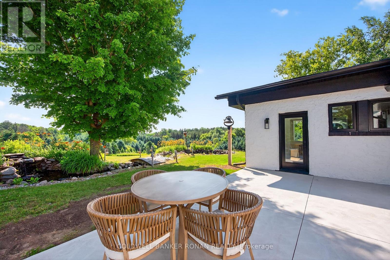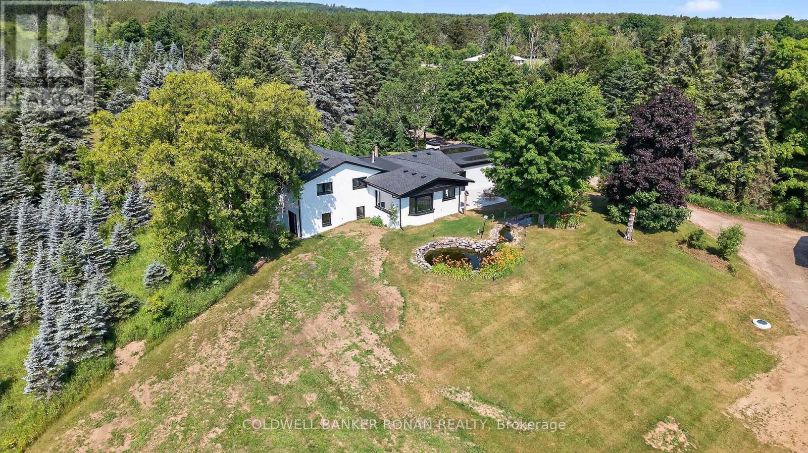 Located just above Highway 9, minutes from Hwy 9 and Airport Road this 25 acre retreat like setting features rolling treed landscapes, ponds and a 3 bedrooms, 4 bathrooms 4 level side split taken back to the studs and fully remodelled. This designer finished home offers bright and spacious living, multiple walkouts, stunning finishings and fixtures all brand new and never lived in! Upper level with 2 bedrooms with ensuites. Main level features an open concept living room and kitchen with breakfast bar and sunken eating area, mud room, laundry and half bath. Walkout lower level with wood burning fireplace, 3rd bedroom and four-piece bath. From the private tree lined drive to the koi pond overlooking the spring feed pond and enchanting panoramic views of mostly blue spruce creates picturesque scenery all year round. The 25 ft x 45 ft barn could be used for animals, storage for recreational vehicles or both. (id:64974)