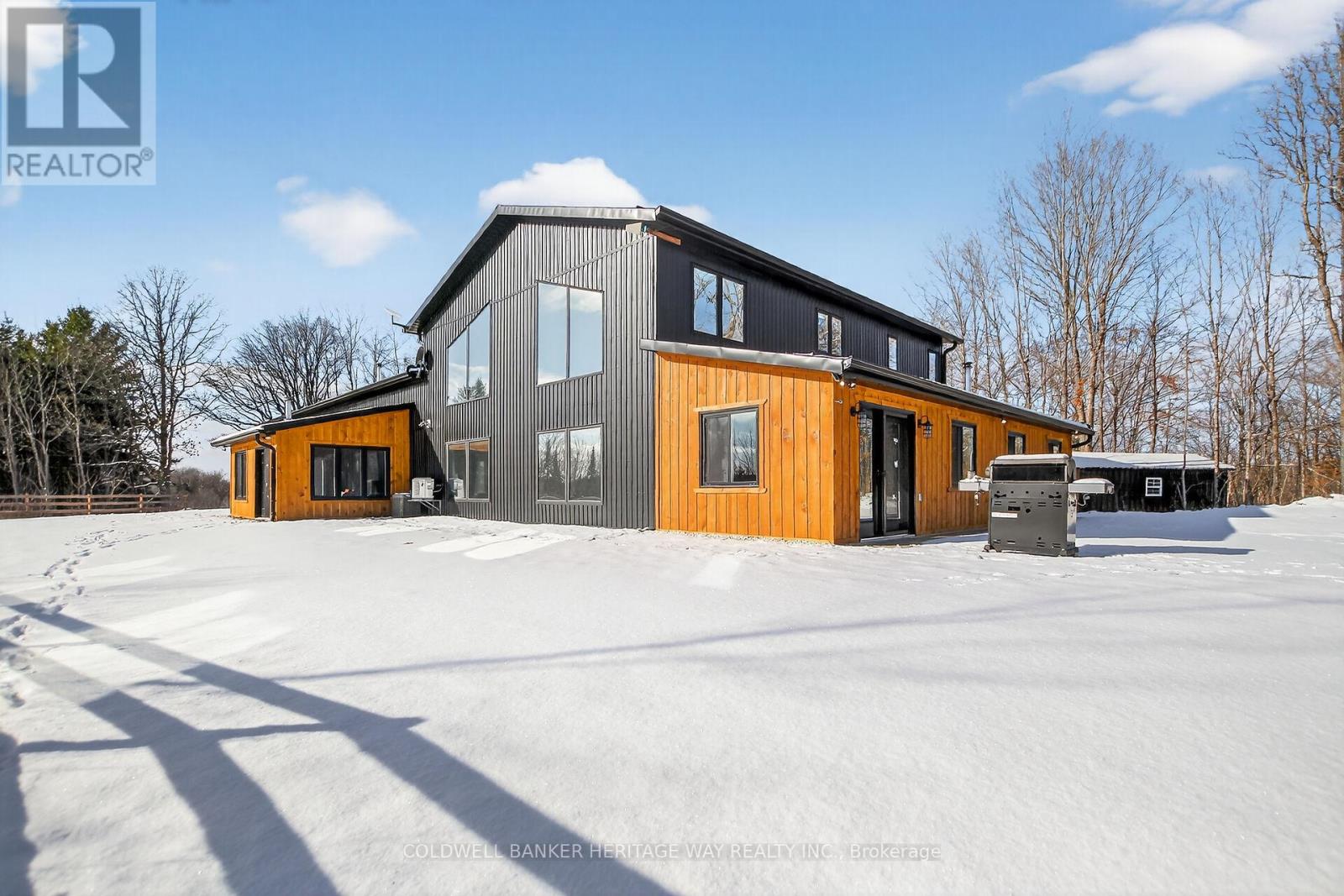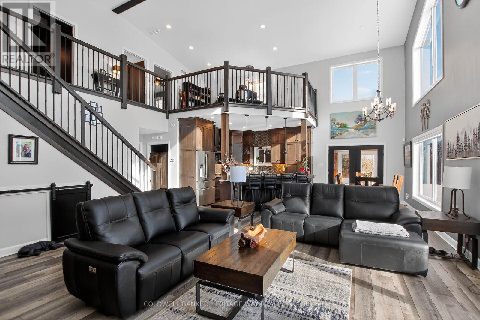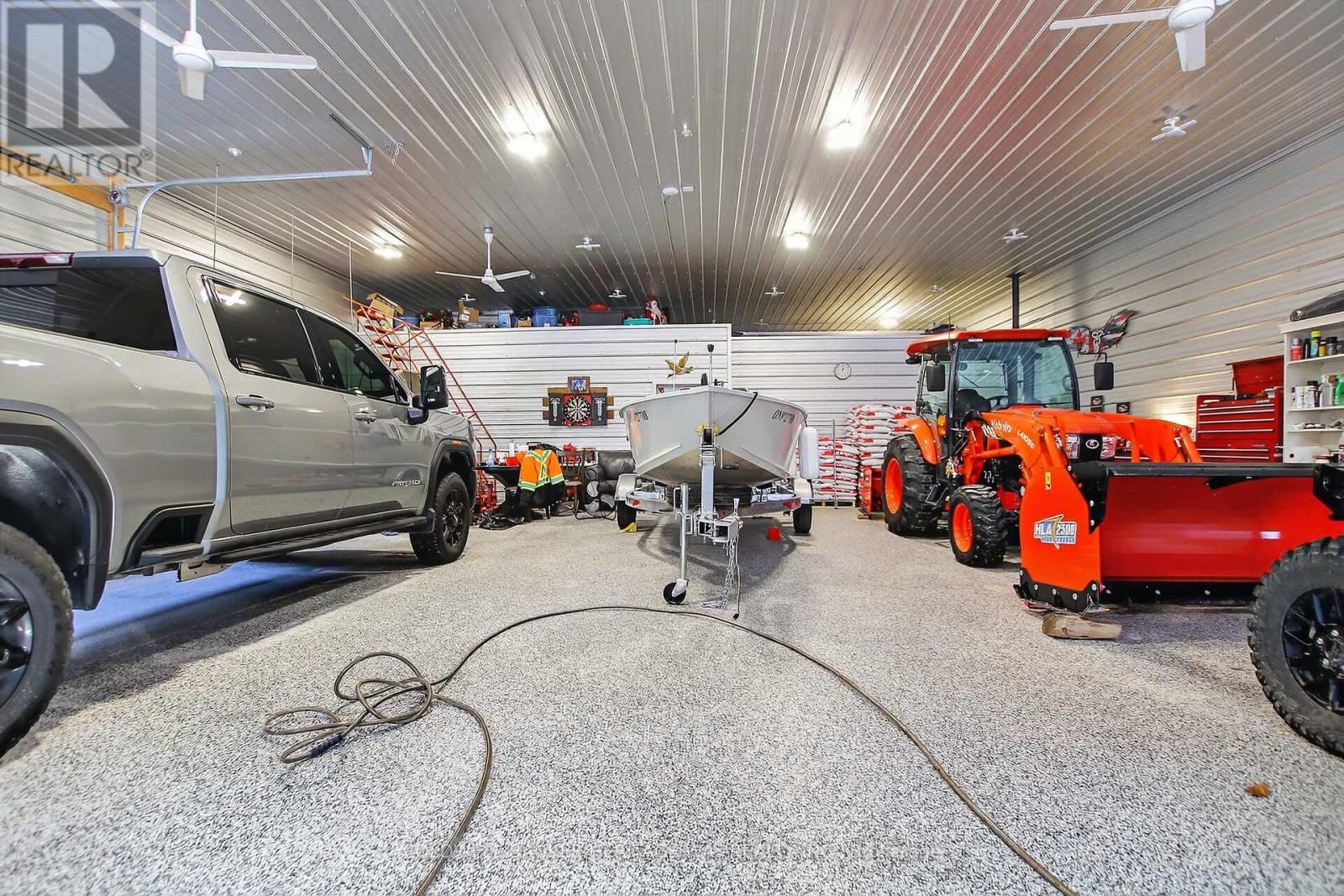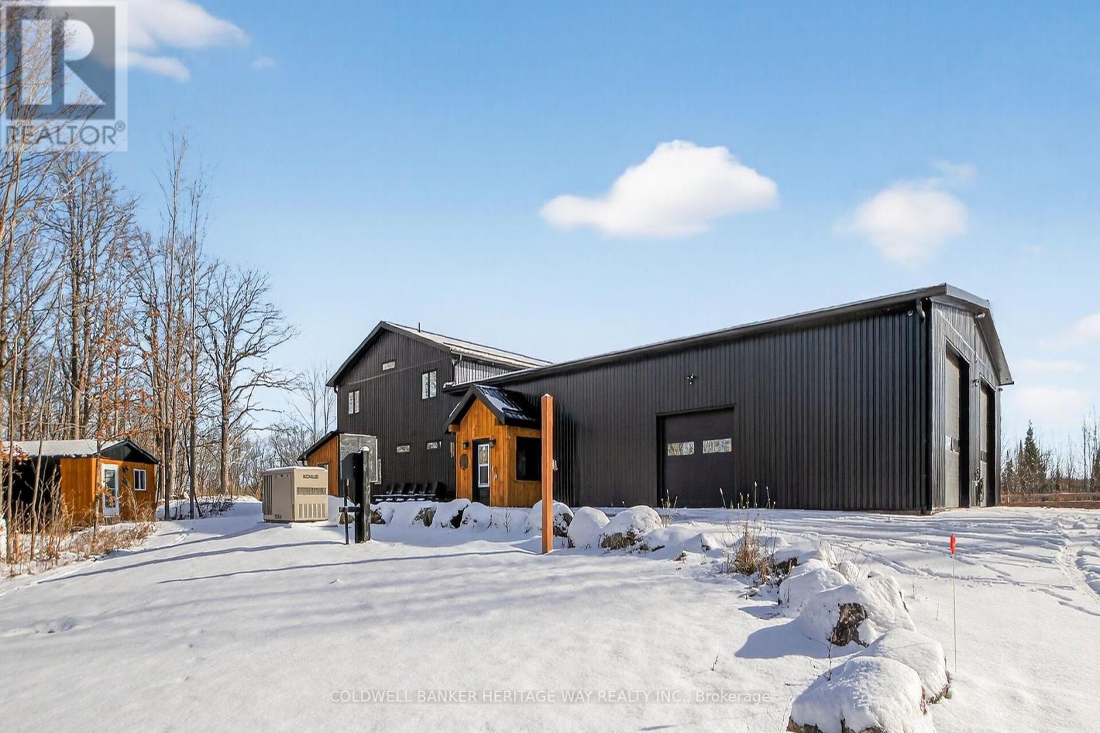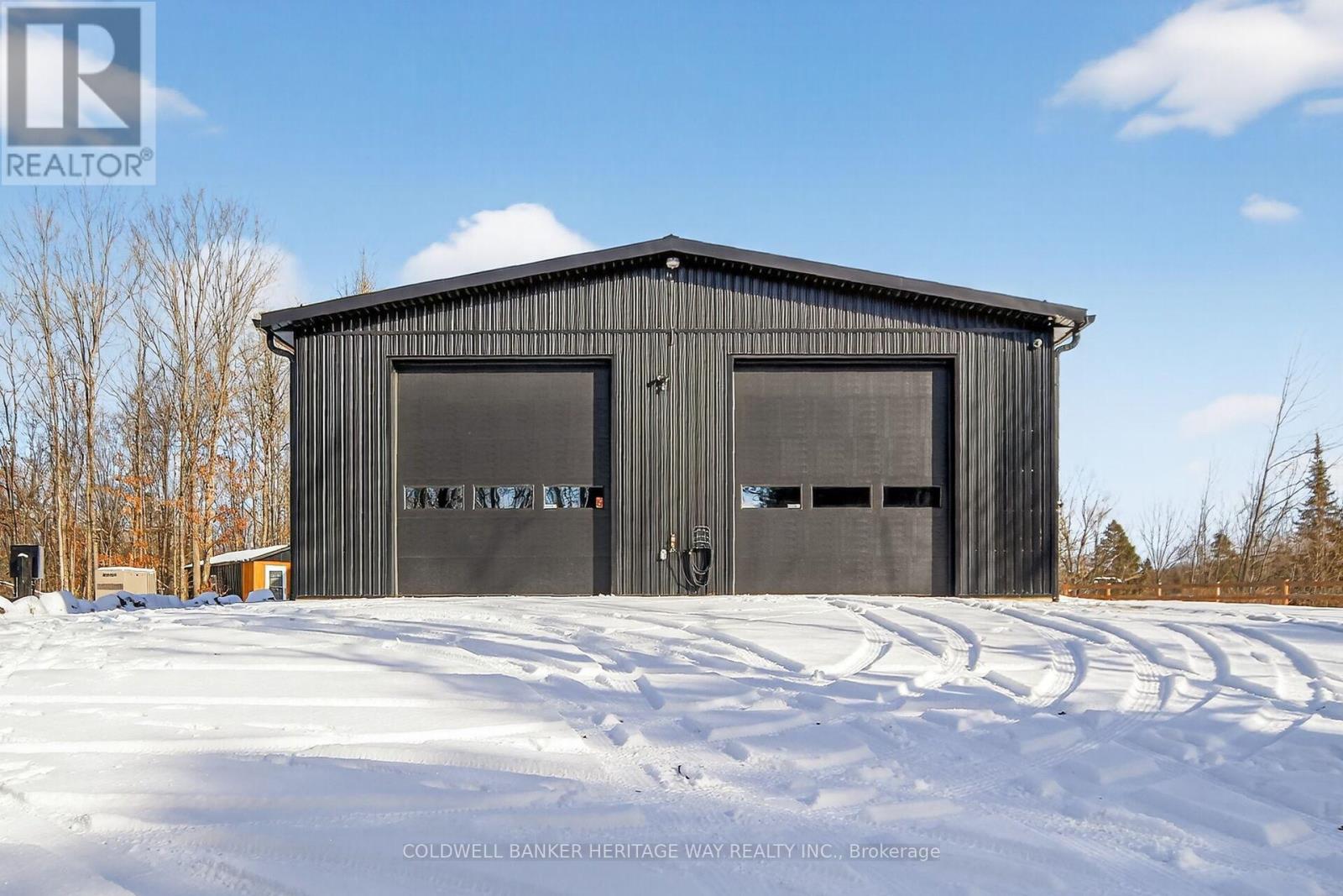 Perched atop a hill on 40 acres with Bennett Lake just across the road, this 4-year-old custom-built 3 bedroom 3.5 bathroom "BARNDOMINIUM" is truly one of a kind. No expense was spared in the construction of this exceptional executive-style residence, showcasing outstanding craftsmanship and high-end finishes throughout. The home features an oversized attached 1750 sq ft heated garage with 2- 12X12 and1- 9 x8 doors with remote openers, perfect for vehicles, recreational toys, or a workshop. The main-level primary bedroom is a private retreat, patio door to hot tub area, complete with a walk-in closet with built-in wardrobes and a stunning ensuite featuring heated floors and an oversized walk-in shower with dual rain heads.The heart of the home offers an open-concept design with vaulted ceilings, a gourmet kitchen with granite countertops, and an oversized island ideal for entertaining. The family room is filled with natural light from expansive windows with tinting and automated shades, creating a warm and inviting atmosphere. The newly created tv room with a bar area and door to 3 season enclosed sitting room with a pellett stove. The second level includes two spacious bedrooms, a four-piece bathroom, and a loft-style office overlooking the family room below. The entire home is heated with in-floor radiant heat (propane fired) with a forced air furnace with Central AC. 2nd entrance with gates, shed and tons or room for storage. Set in an elevated location, this property delivers exceptional privacy, panoramic views, and a tranquil connection to nature with trails throughout the treed acreage, all while offering modern comfort and luxury. If you're searching for a one-of-a-kind property that perfectly blends space, style, and functionality, this extraordinary home is a must-see. (id:64974)