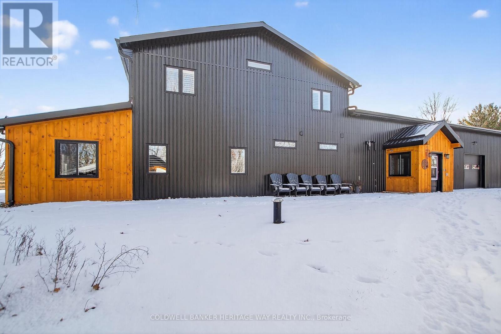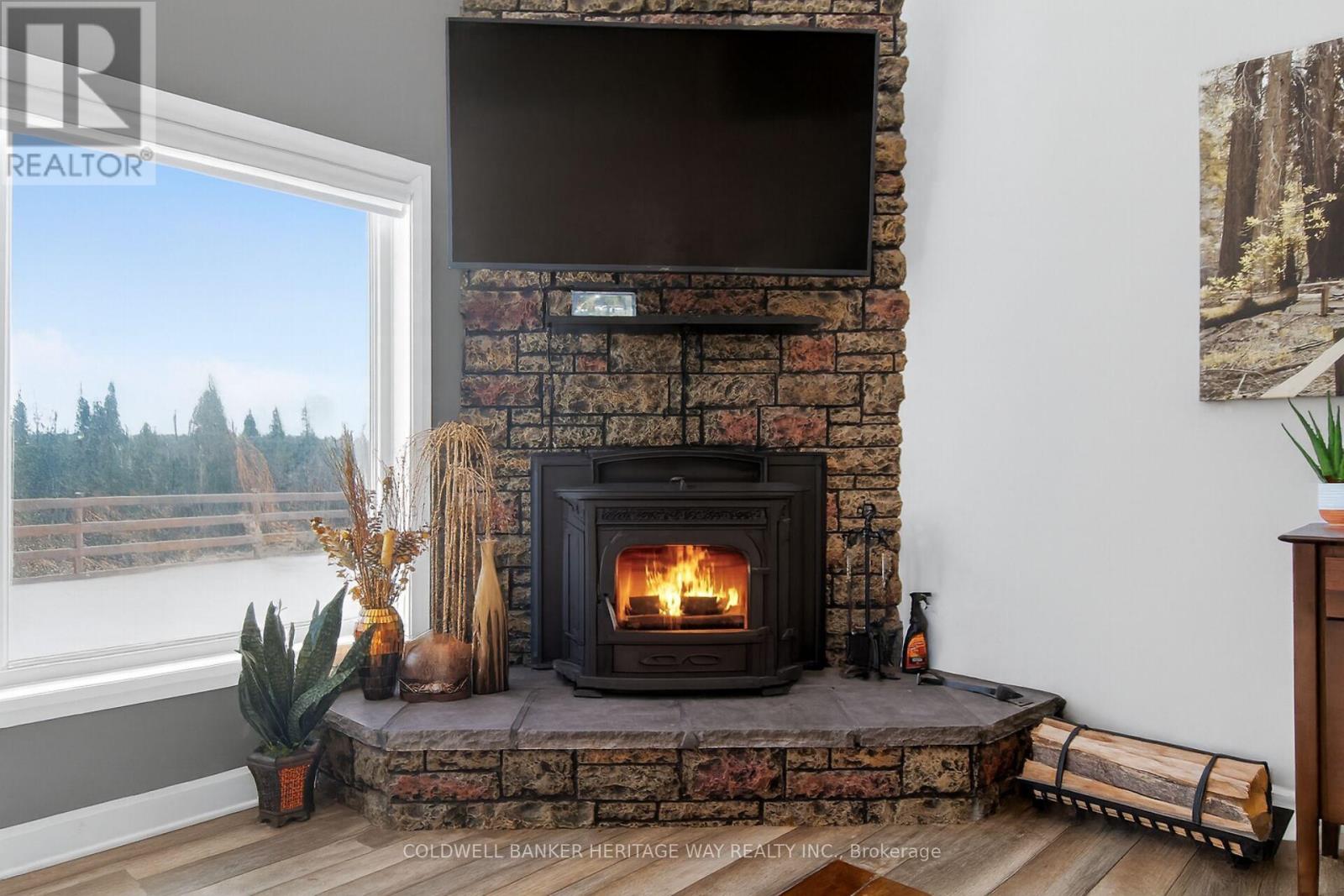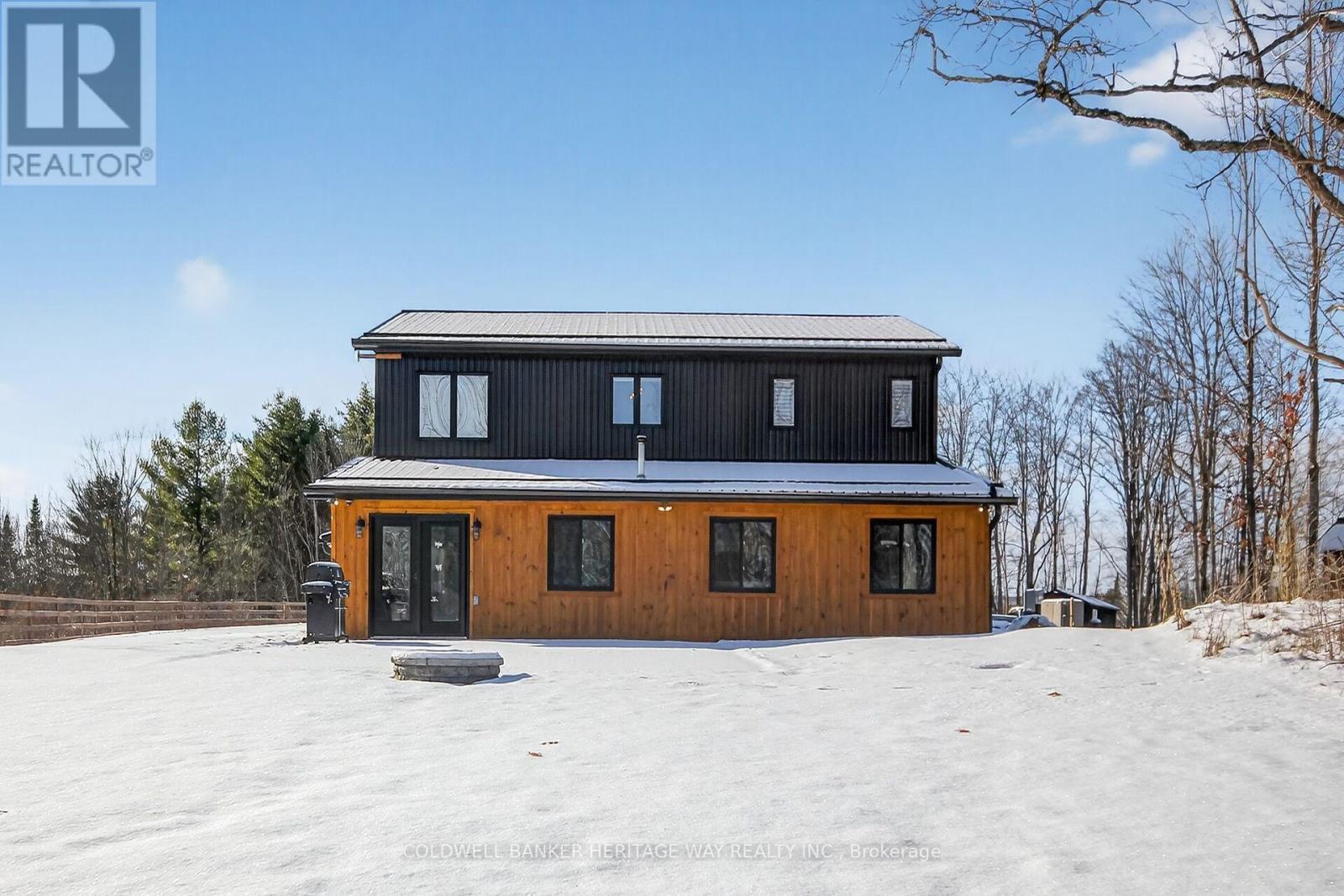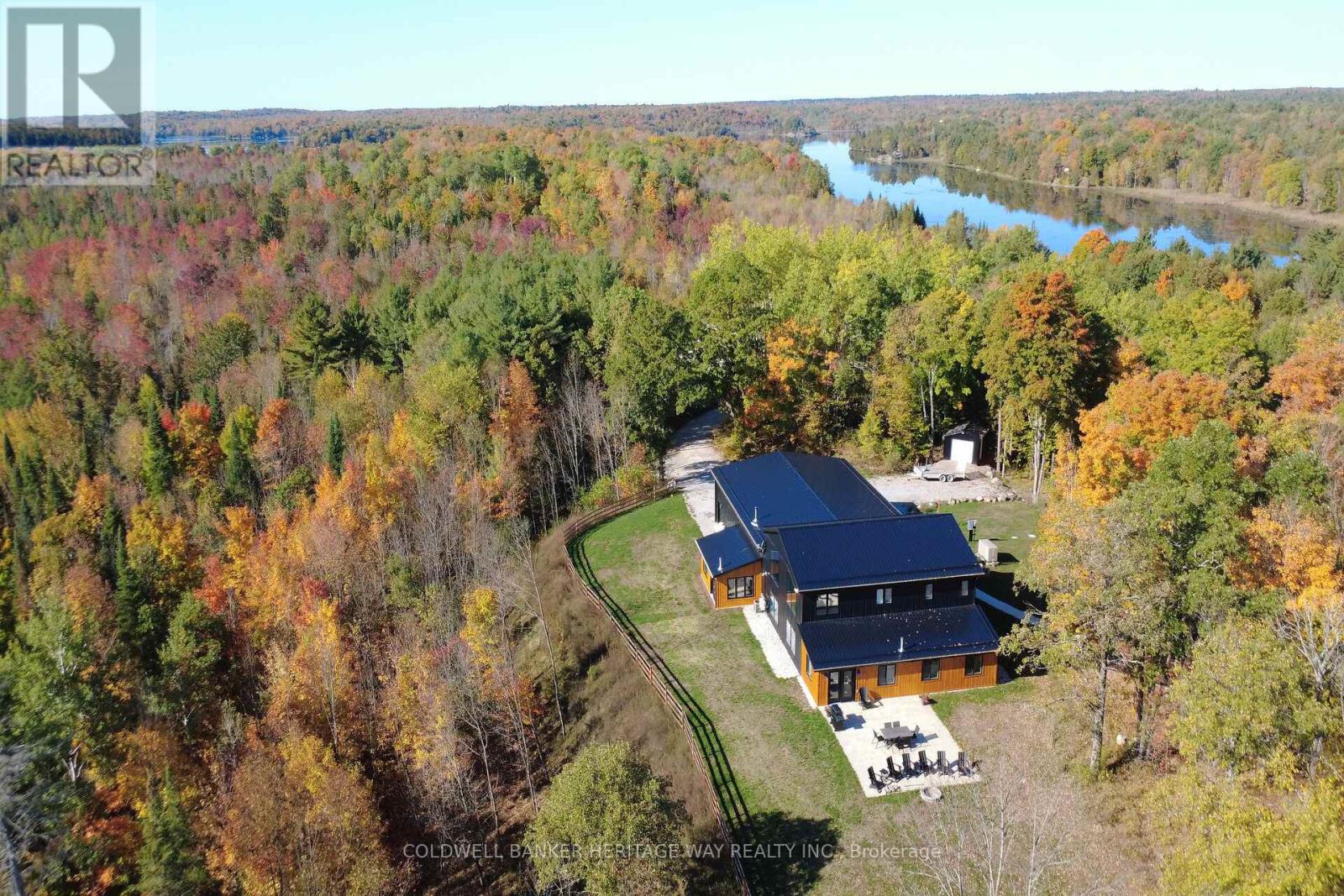 Perched atop a hill on 40 acres with Bennett Lake just across the road, this 4-year-old custom-built 3 bedroom 3.5 bathroom "BARNDOMINIUM" is truly one of a kind. No expense was spared in the construction of this exceptional executive-style residence, showcasing outstanding craftsmanship and high-end finishes throughout. The home features an oversized attached 1750 sq ft heated garage with 2- 12X12 and1- 9 x8 doors with remote openers, perfect for vehicles, recreational toys, or a workshop. The main-level primary bedroom is a private retreat, patio door to hot tub area, complete with a walk-in closet with built-in wardrobes and a stunning ensuite featuring heated floors and an oversized walk-in shower with dual rain heads.The heart of the home offers an open-concept design with vaulted ceilings, a gourmet kitchen with granite countertops, and an oversized island ideal for entertaining. The family room is filled with natural light from expansive windows with tinting and automated shades, creating a warm and inviting atmosphere. The newly created tv room with a bar area and door to 3 season enclosed sitting room with a pellett stove. The second level includes two spacious bedrooms, a four-piece bathroom, and a loft-style office overlooking the family room below. The entire home is heated with in-floor radiant heat (propane fired) with a forced air furnace with Central AC. 2nd entrance with gates, shed and tons or room for storage. Set in an elevated location, this property delivers exceptional privacy, panoramic views, and a tranquil connection to nature with trails throughout the treed acreage, all while offering modern comfort and luxury. If you're searching for a one-of-a-kind property that perfectly blends space, style, and functionality, this extraordinary home is a must-see. (id:64974)