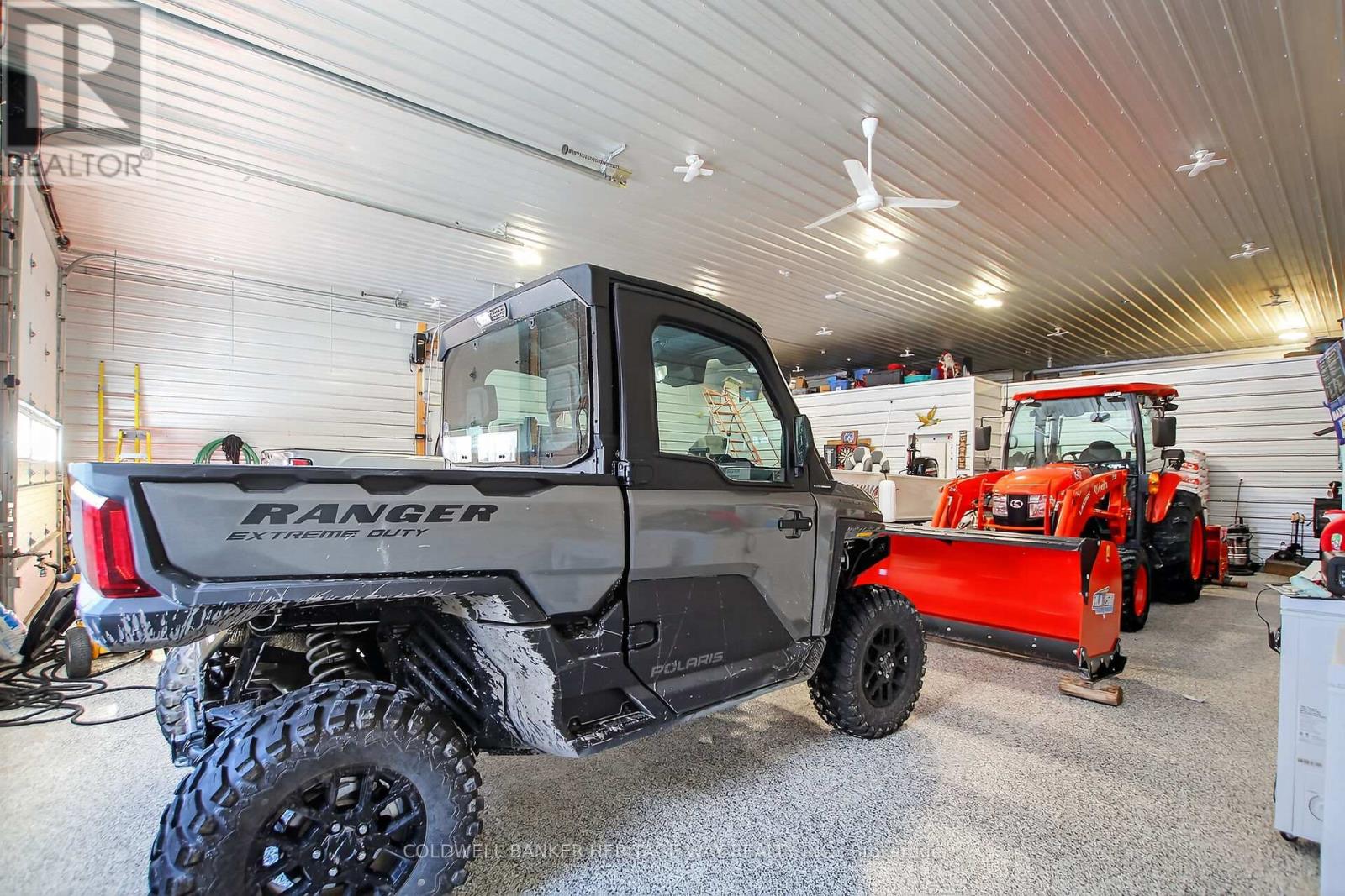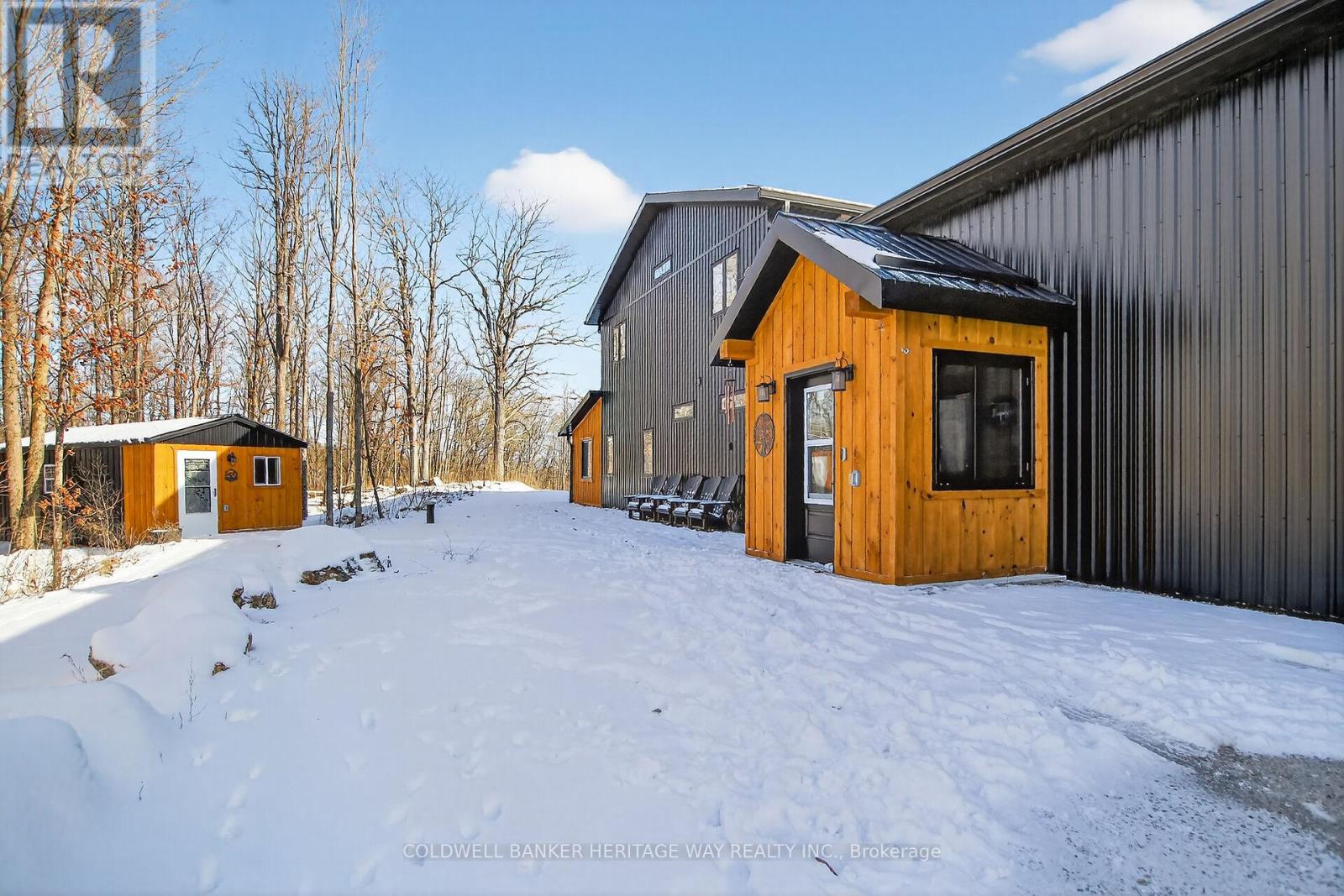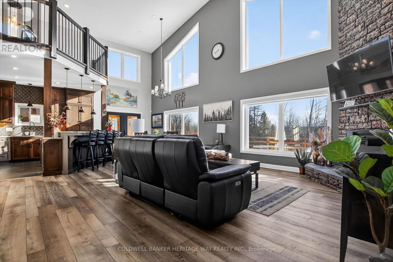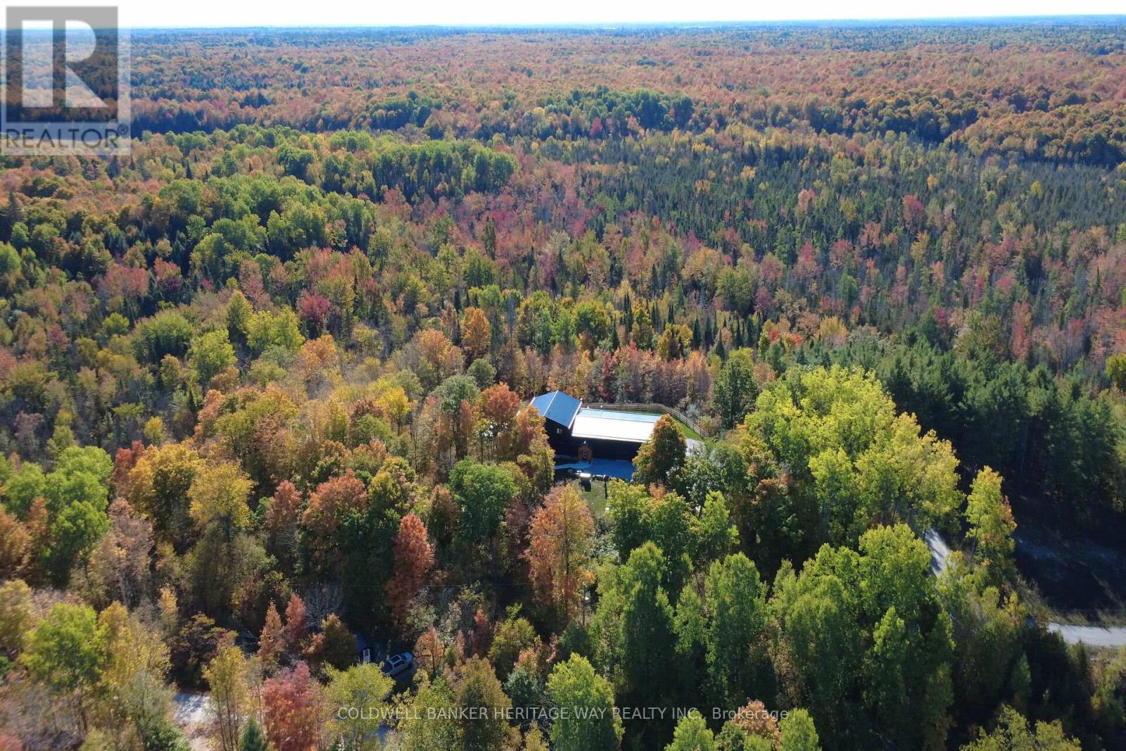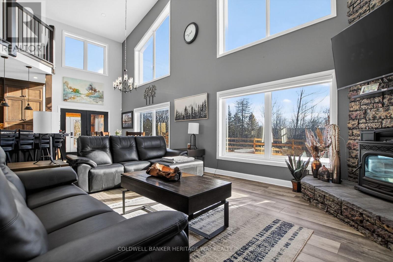 Perched atop a hill on 40 acres with Bennett Lake just across the road, this 4-year-old custom-built 3 bedroom 3.5 bathroom "BARNDOMINIUM" is truly one of a kind. No expense was spared in the construction of this exceptional executive-style residence, showcasing outstanding craftsmanship and high-end finishes throughout. The home features an oversized attached 1750 sq ft heated garage with 2- 12X12 and1- 9 x8 doors with remote openers, perfect for vehicles, recreational toys, or a workshop. The main-level primary bedroom is a private retreat, patio door to hot tub area, complete with a walk-in closet with built-in wardrobes and a stunning ensuite featuring heated floors and an oversized walk-in shower with dual rain heads.The heart of the home offers an open-concept design with vaulted ceilings, a gourmet kitchen with granite countertops, and an oversized island ideal for entertaining. The family room is filled with natural light from expansive windows with tinting and automated shades, creating a warm and inviting atmosphere. The newly created tv room with a bar area and door to 3 season enclosed sitting room with a pellett stove. The second level includes two spacious bedrooms, a four-piece bathroom, and a loft-style office overlooking the family room below. The entire home is heated with in-floor radiant heat (propane fired) with a forced air furnace with Central AC. 2nd entrance with gates, shed and tons or room for storage. Set in an elevated location, this property delivers exceptional privacy, panoramic views, and a tranquil connection to nature with trails throughout the treed acreage, all while offering modern comfort and luxury. If you're searching for a one-of-a-kind property that perfectly blends space, style, and functionality, this extraordinary home is a must-see. (id:64974)