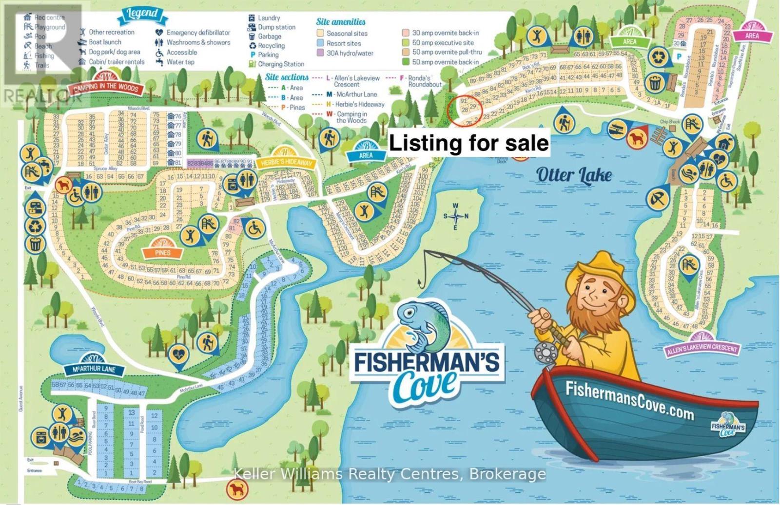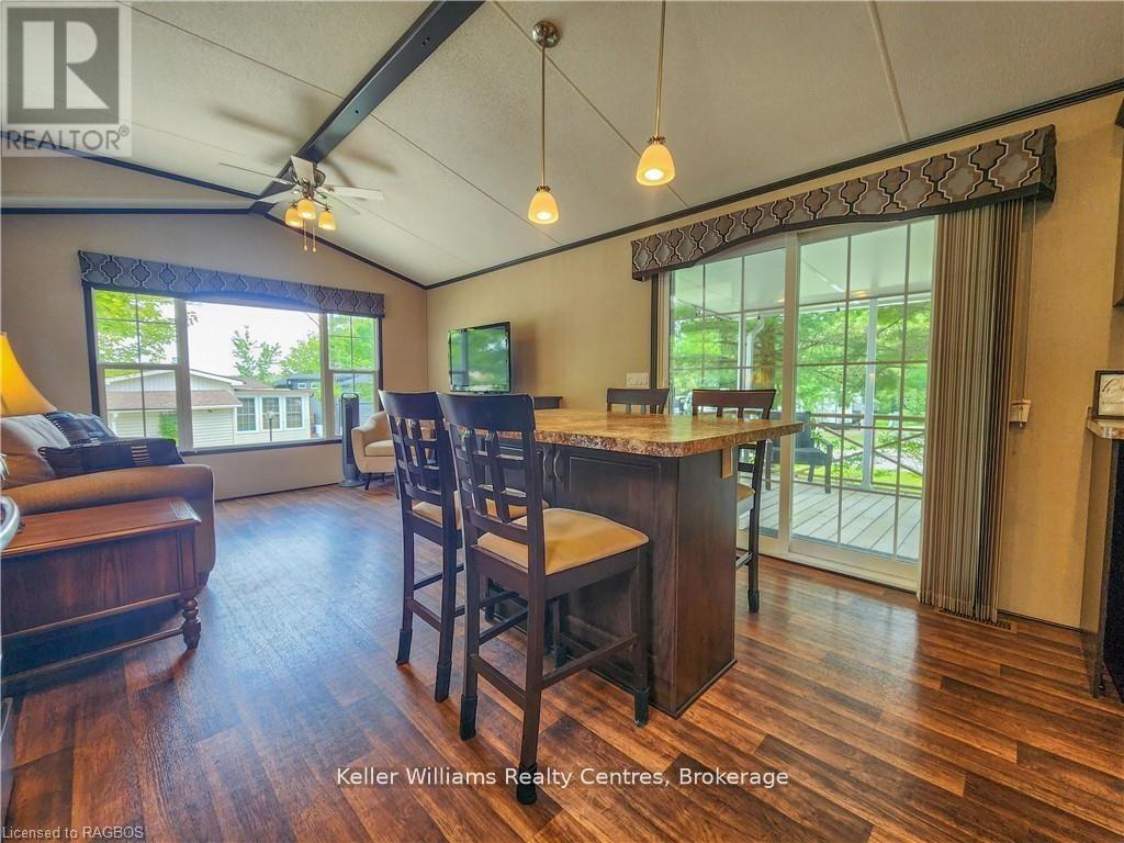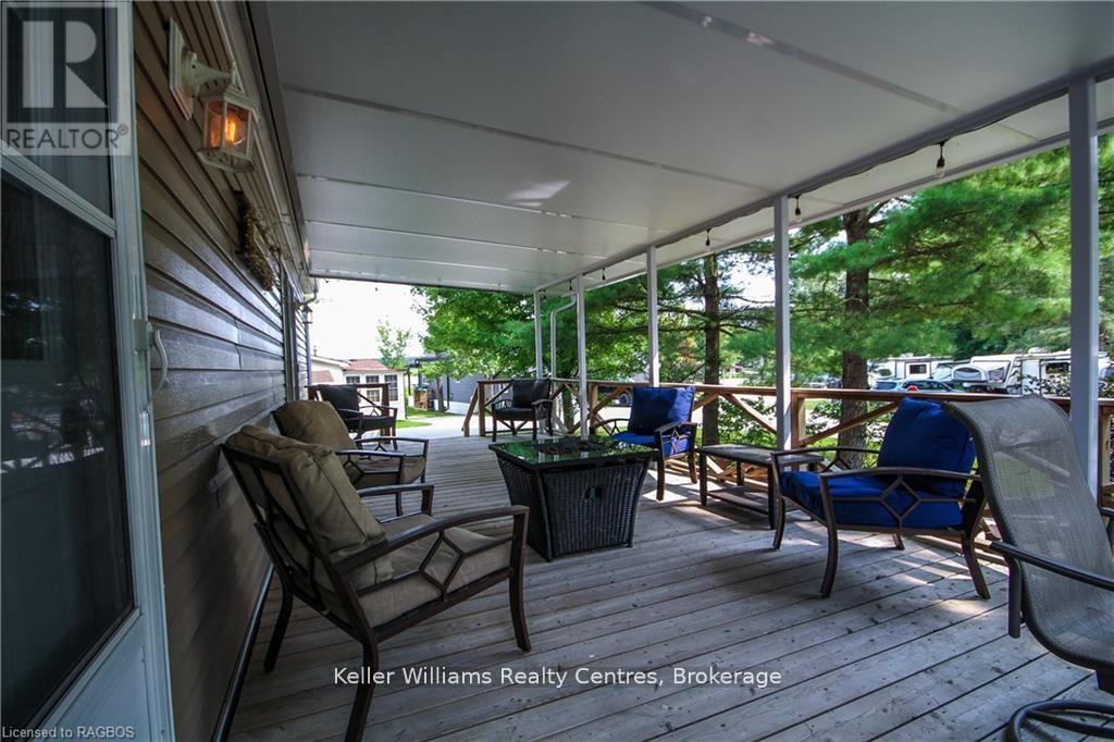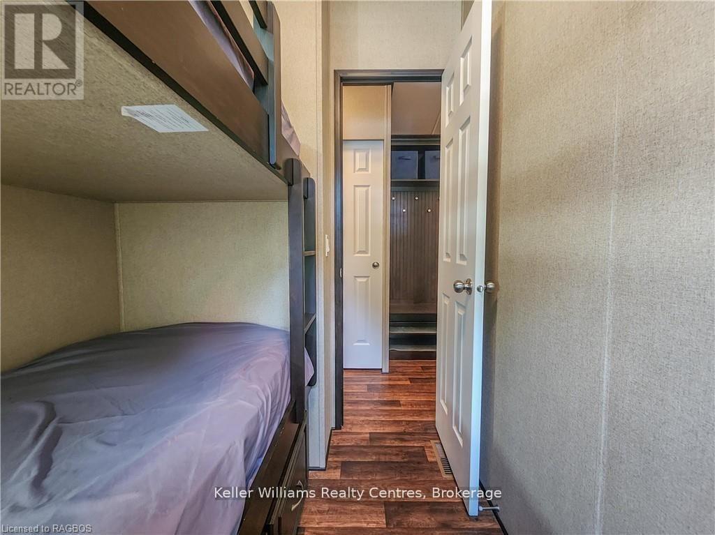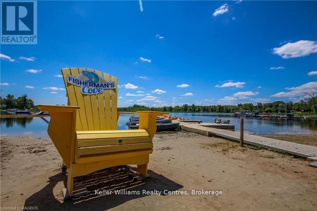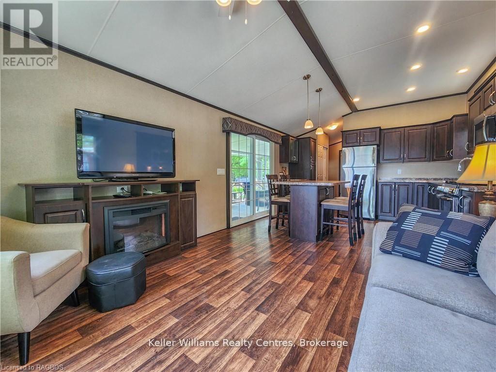 This fully furnished, turn key 2016 Northlander Cottager Escape stuns with vaulted ceilings, hardwood floors, and big windows framing lush views. Cozy up by the electric fireplace or host movie nights in the living room. The sleek kitchen, with stainless steel appliances and a spacious island, makes family meals or game nights a breeze. Sleep easy in the plush queen primary bedroom, while kids and guests crash in the bunk room. The modern bathroom boasts a glass shower and ample storage. Outside, a covered deck with comfy seating, a fire table, BBQ, and dining area sets the stage for epic gatherings, rain or shine. Roast marshmallows at the fire pit, surrounded by a lush, tree lined yard with a storage shed for all your gear. Dive into lake fun; boating, fishing, swimming or stroll scenic trails. Fishermans Cove delivers big with a marina, playgrounds, indoor pools, and community. Your wallet friendly family vacation or retirement retreat awaits, don't miss out! (*Seasonal park, not a primary residence. Lease fees pre-paid until July. Park open April 1-October 31, $4,160 + tax/year(based on 5 year lease $20,800)) (id:64974)