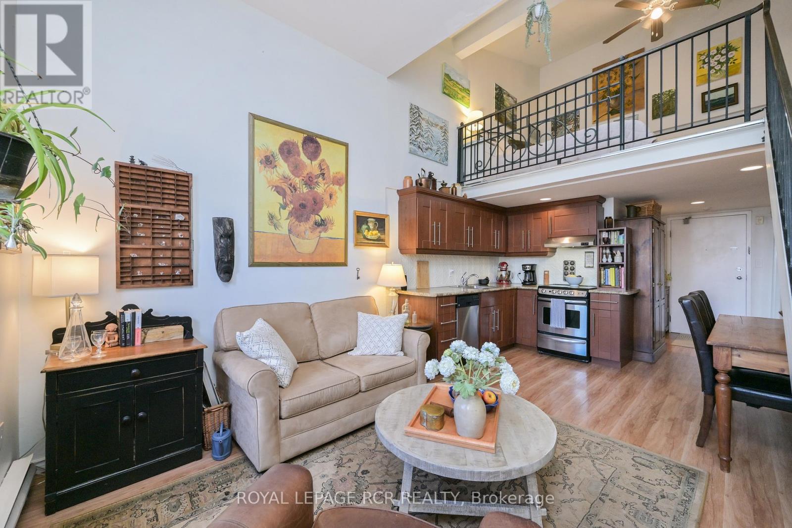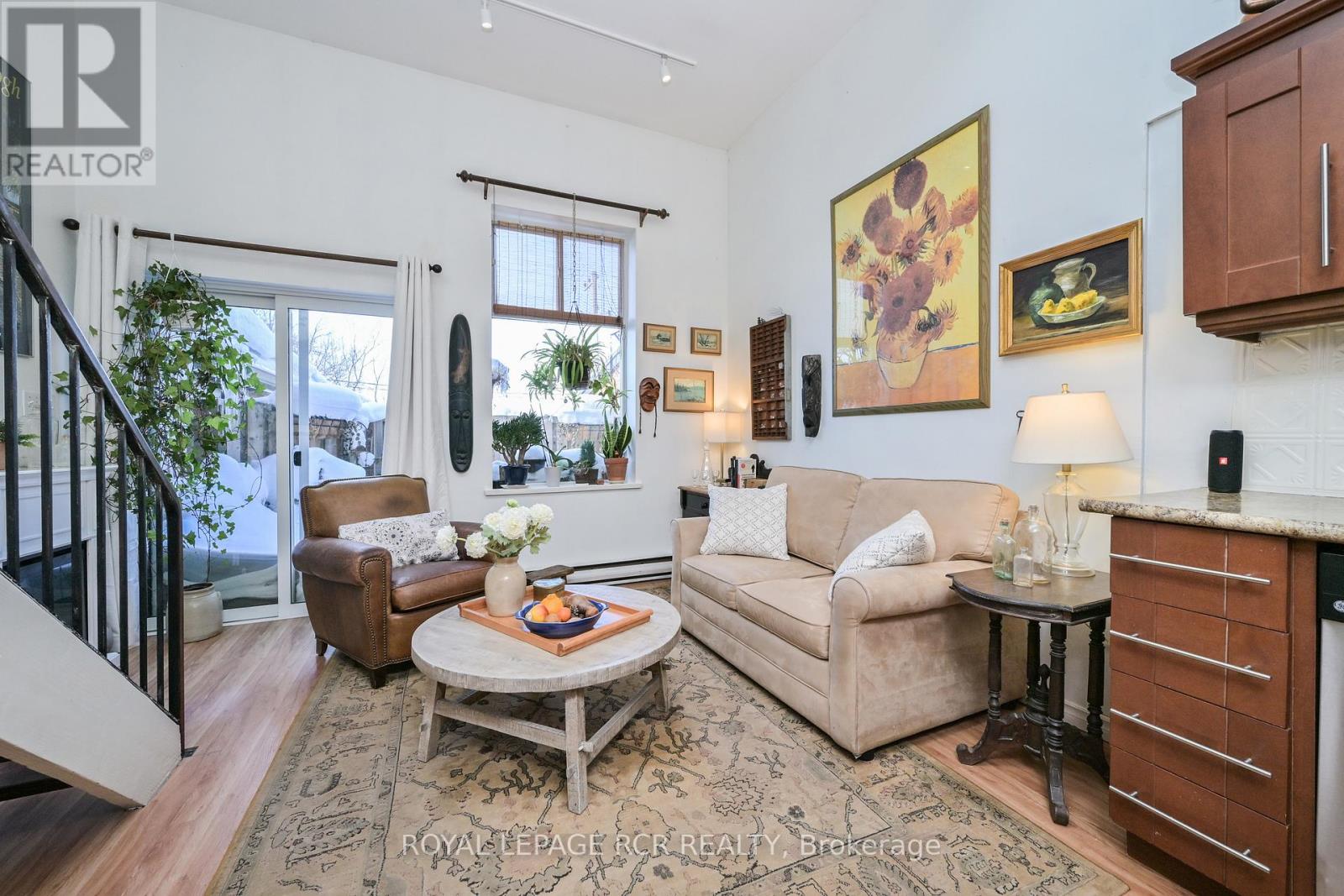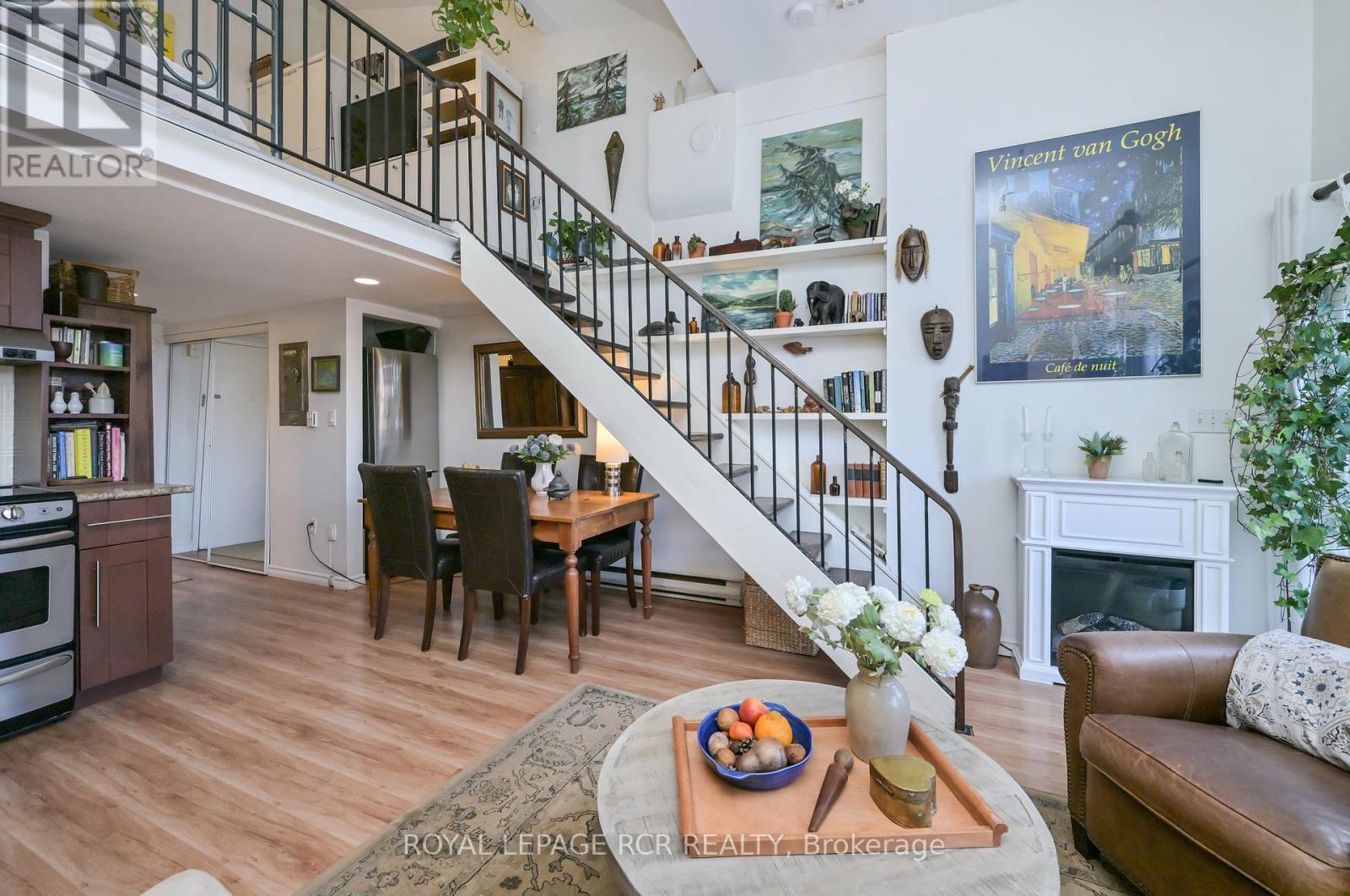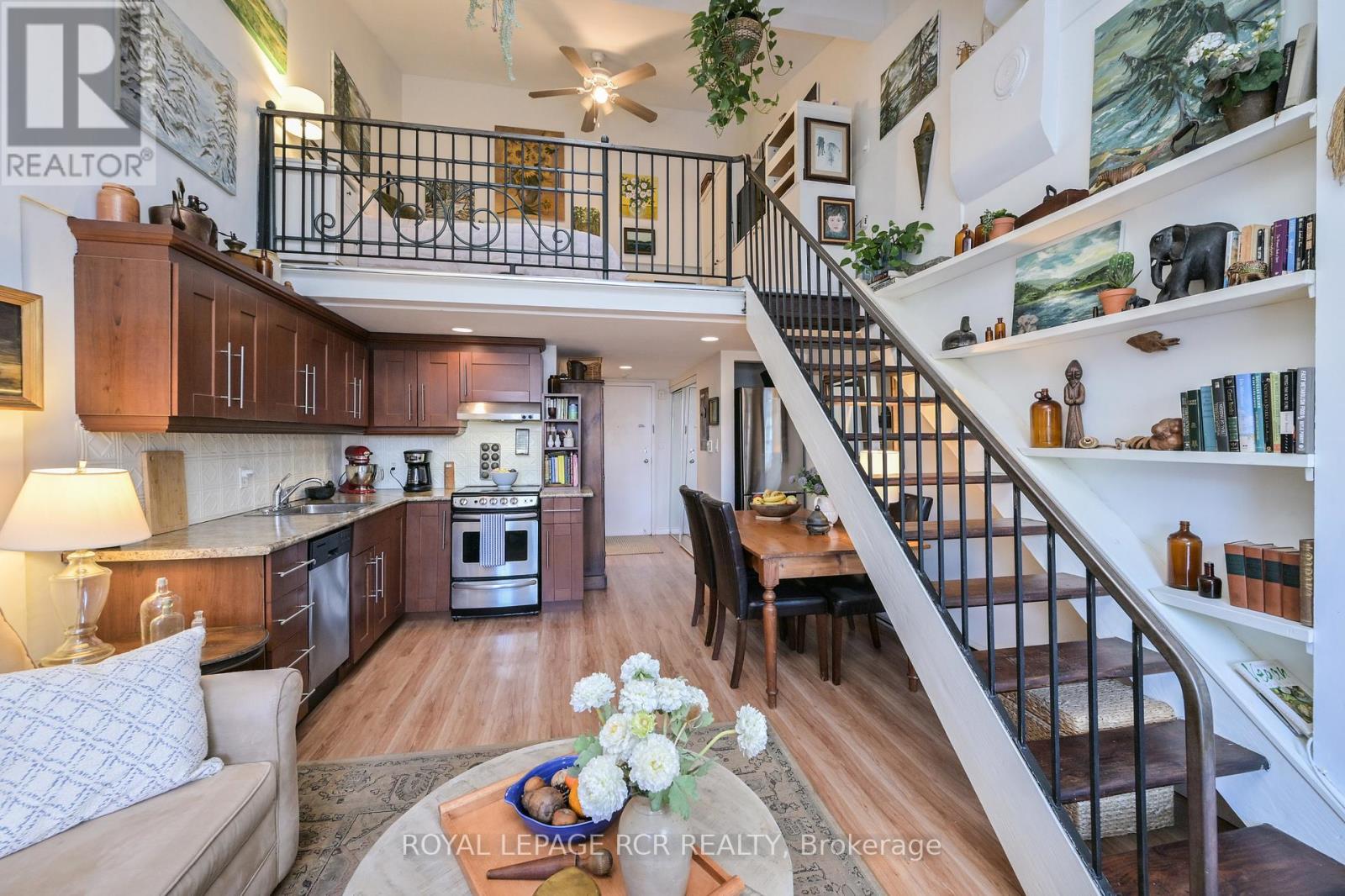 *See multimedia for Video! Tucked into the vibrant heart of downtown Orangeville, this beautifully styled one bedroom loft condo is proof that great things truly do come in thoughtfully designed packages. With its blend of modern updates, architectural character, and an unbeatable walkable location, this residence offers an inviting urban lifestyle that feels both exciting and comfortably intimate. Step outside and you're immediately immersed in the energy of downtown. Fine dining restaurants, cozy cafés, cocktail bars, boutique shopping, and local services are all just steps away. The historic theatre is nearby for evenings of live performances and film, while seasonal downtown festivals and the beloved farmers market bring the community together year-round. Whether you're meeting friends for brunch, enjoying a spontaneous night out, or strolling the streets on a sunny Saturday morning, everything you love about Orangeville is right at your doorstep. Inside, the condo welcomes you with a warm, loft-inspired atmosphere that feels stylish yet approachable. The open-concept layout maximizes every square foot, creating a seamless flow between the living, dining, and kitchen areas. Soaring ceilings and the lofted bedroom above give the space an airy, architectural feel, while carefully chosen finishes keep it cozy and livable. The condo includes a laundry hookup, offering the convenience of in-suite laundry potential and one of the most charming highlights of this condo is the private deck. This outdoor space offers an opportunity to enjoy fresh air and a moment of calm right in the downtown core. Whether you're sipping your morning coffee, enjoying a glass of wine in the evening, or adding a few plants to create your own urban oasis, the deck extends your living space and enhances the condo's cozy, welcoming feel. Back staircase accesses the private parking area (1 exclusive spot) and storage locker room. Things will be great when you're DOWNTOWN! (id:64974)