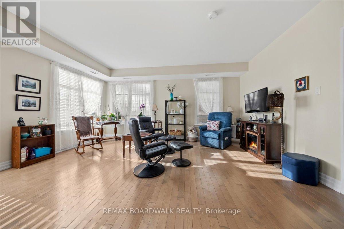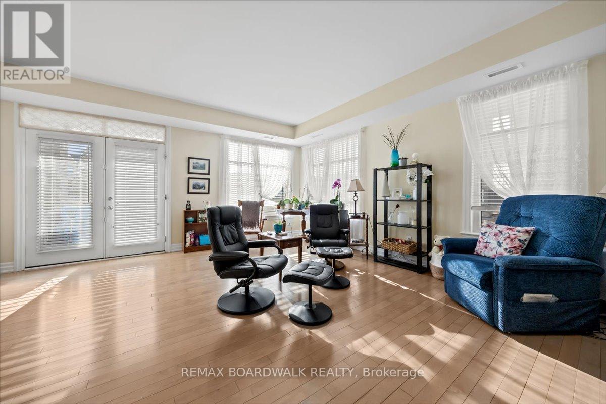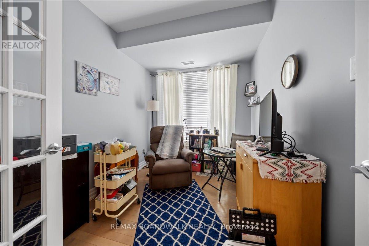 Experience effortless living in this beautifully maintained ground-level 2-bedroom + den condo with a walkout terrace, ideally located in the heart of Stittsville. With over 1,300 sq. ft. of single-level living, this bright home features an open-concept layout with abundant natural light and direct access to a private terrace. Quality finishes include maple hardwood flooring, quartz countertops, upgraded cabinetry, smooth ceilings, and a sleek glass en-suite shower. The kitchen offers an island, pantry storage, and stainless steel appliances. The primary bedroom includes a walk-in closet and ensuite, while the second bedroom is conveniently located near a full bathroom. The den is perfect for a home office or extra living space. Additional features include in-unit laundry, central air conditioning, underground parking, and a storage locker. Located in a quiet, well-managed building with ample visitor parking, this home offers a low-maintenance living without compromise. A true standout you won't want to miss! (id:64974)