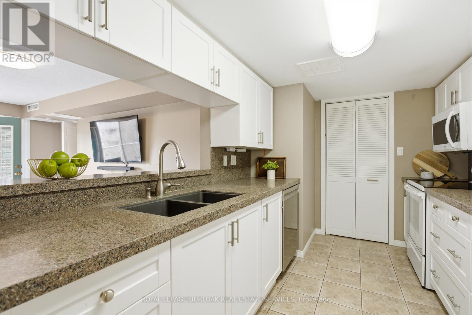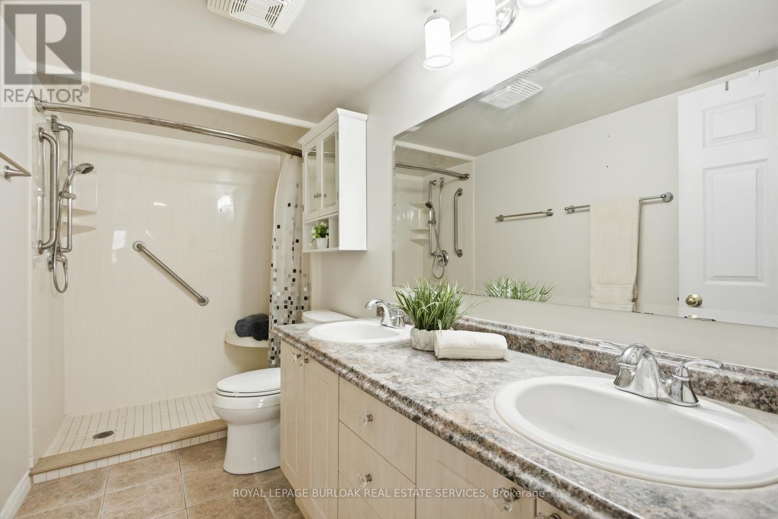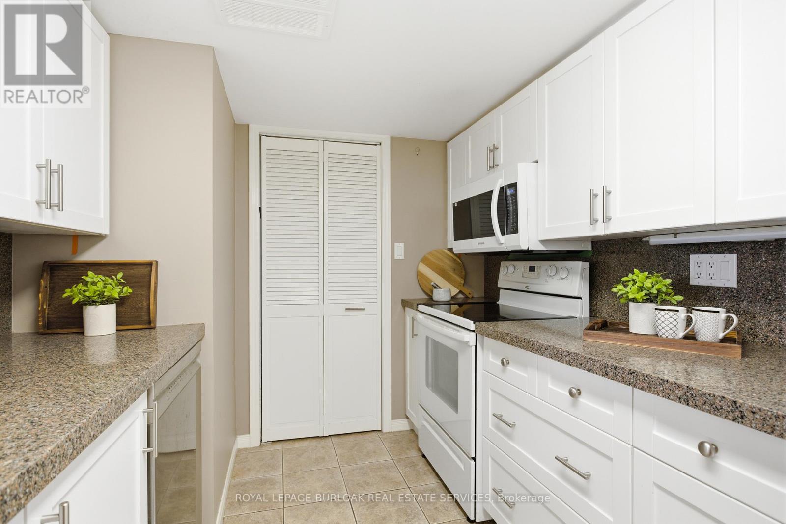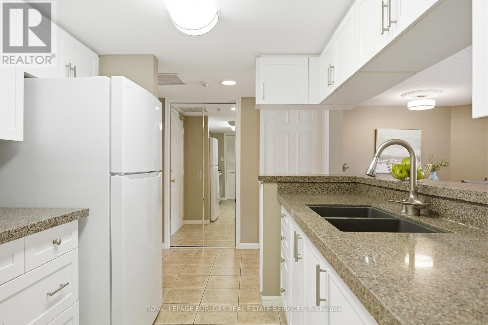 Lifestyle and Location! This beautifully updated 2 bed, 2 bath condo in Aldershot's sought after Oaklands Green community offers effortless living from the moment you arrive. Every space feels bright & inviting, The galley style kitchen stands out with its crisp white Shaker cabinetry, new fridge, dishwasher and microwave, ('25) abundant storage, backsplash, glass front uppers, and granite overlay counters with a sleek silgranite undermount sink. Just off the kitchen is a convenient in suite laundry/utility room. The generous open concept living and dining area, features west facing windows and double French doors with screens that open to the balcony and fill the room with fresh air and warm afternoon light. The spacious primary bedroom features large windows, a walk in closet, and a 4 piece ensuite complete with a double vanity and easy step in shower and grab bars. The entire unit is carpet free, finished with ceramic tile and rich mid tone engineered hardwood, and every window is fitted with California shutters for a clean, timeless look. This condo includes one underground parking space and two storage lockers. Residents also enjoy a dedicated Community Centre with library, meeting and party room. There's ample visitor parking. The location is ideal-minutes to the Aldershot GO Station, Royal Botanical Gardens, Lasalle Park, Golf, and quick highway access. A perfect blend of comfort, convenience, and community. Come see what your lifestyle could be in Aldershot! (id:64974)