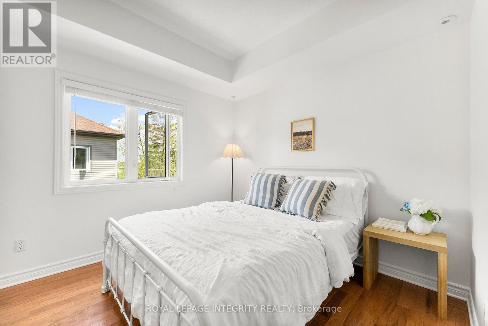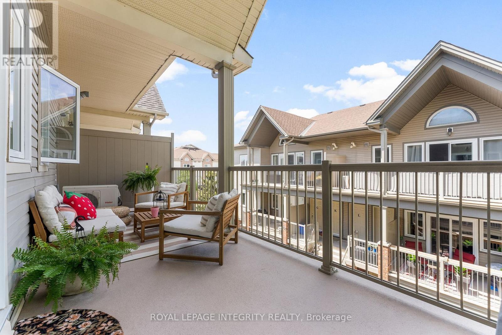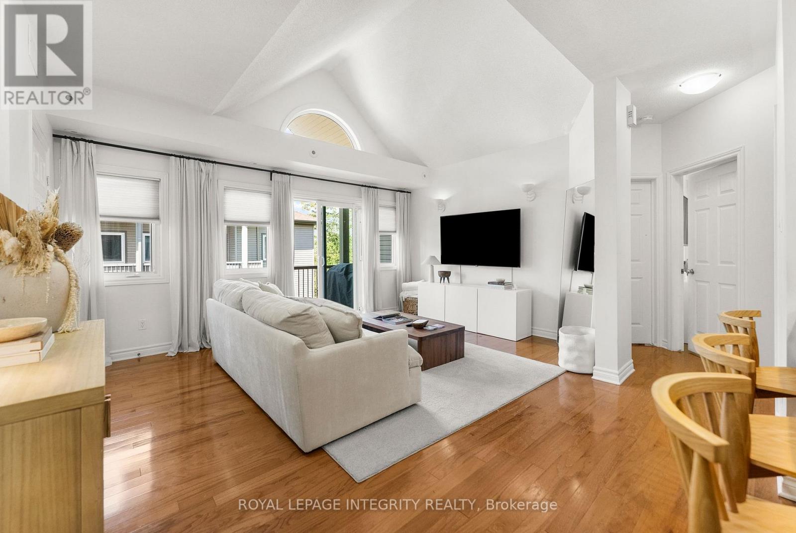 Welcome to carefree condo living in the highly sought-after community of Jackson Trails! This beautifully maintained upper unit is flooded with natural light thanks to its abundance of windows and soaring vaulted ceilings. With no rear neighbours and views of the trees, it offers a peaceful retreat just steps from all the amenities you need. The open-concept living and dining area features a full wall of windows, creating an airy, sun-filled space perfect for relaxing or entertaining. Rich hardwood flooring flows throughout the main living areas and both bedrooms, adding warmth and elegance. The kitchen is both stylish and functional, with stainless steel appliances, a sleek glass tile backsplash, a breakfast bar for casual dining, and convenient in-unit laundry access. The primary bedroom is a serene escape with a generous walk-in closet and a patio door that opens to tranquil treetop views, no rear neighbours to disturb your privacy. The second bedroom is also a great size, making it ideal for guests, a home office, or a cozy retreat. The large main bathroom offers both comfort and style, featuring a separate soaker tub and a walk-in shower. Off the living room, step out onto your private balcony, the perfect spot for morning coffee or evening unwinding. Located just minutes from shopping, restaurants, banking, schools, and transit, this home offers the best of both comfort and convenience. Whether you're a first-time buyer, downsizer, or investor, this bright and spacious unit checks all the boxes. Don't miss this opportunity to own in one of Stittsville's most popular neighbourhoods! (id:64974)