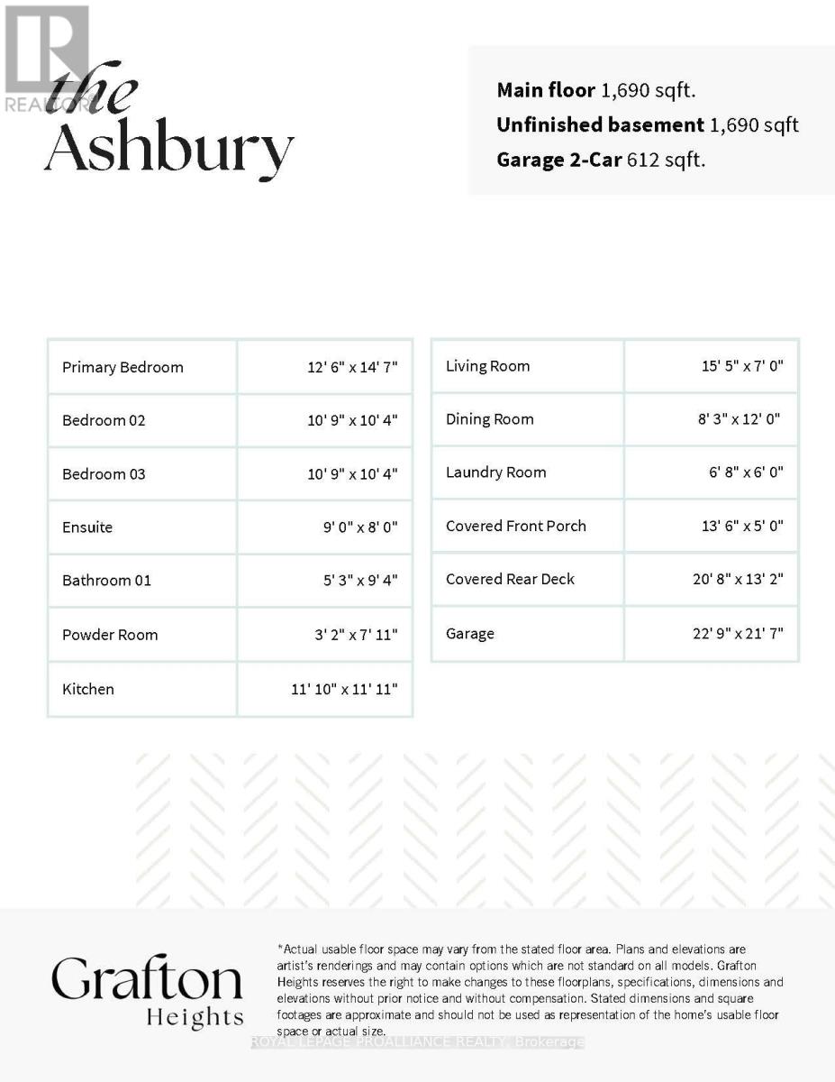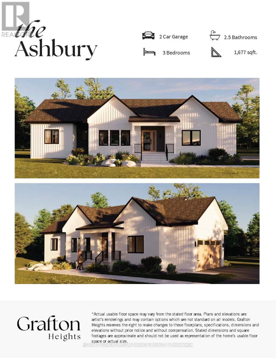 Introducing The Ashbury, a well designed bungalow offering approximately 1,677 sqft of thoughtfully planned main floor living, plus an unfinished 1,560 sqft basement ready for future use. With 3 bedrooms, 2.5 bathrooms and a 2 car garage, this home delivers comfort, function and flexibility in a streamlined layout. The open concept kitchen, dining and living area creates a natural gathering space for everyday living and entertaining, with the living room opening to a covered rear deck for seamless indoor outdoor flow. The privately positioned primary bedroom includes a walk in closet and ensuite, while two additional bedrooms are well sized and thoughtfully separated. Main floor laundry, a powder room, direct garage access and a covered front porch add everyday convenience. The unfinished basement offers excellent potential for additional living space as needs evolve. Located in Grafton Heights, a hillside community with scenic countryside and Lake Ontario views, homes are serviced by municipal water, natural gas, fibre optic internet and private septic systems on pool sized lots. Minutes to Cobourg and Highway 401, and within 45 minutes of the GTA, this location offers rural charm with easy urban access, close to Wicklow Beach, local schools and the trails of Northumberland Forest. Photos and renderings are for illustration only and may include upgrades. Specs, finishes and pricing subject to change. (id:64974)