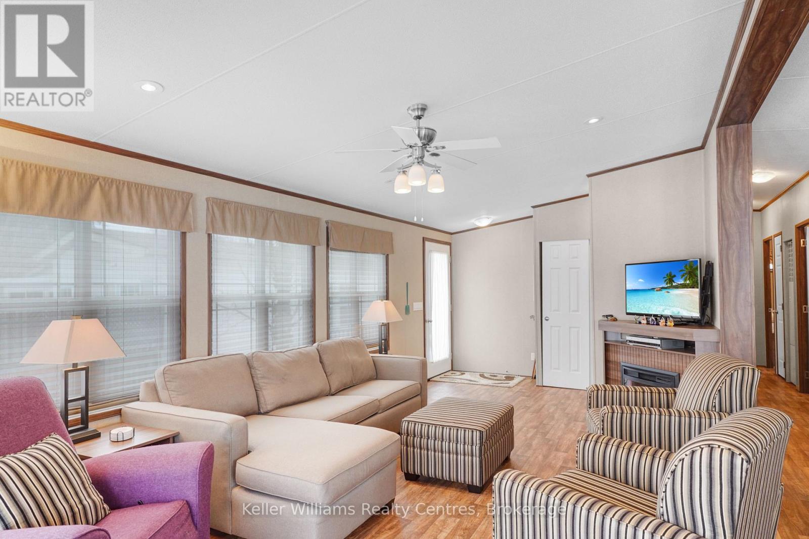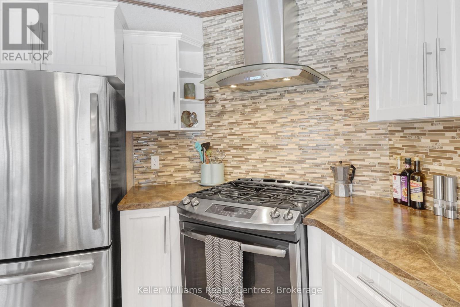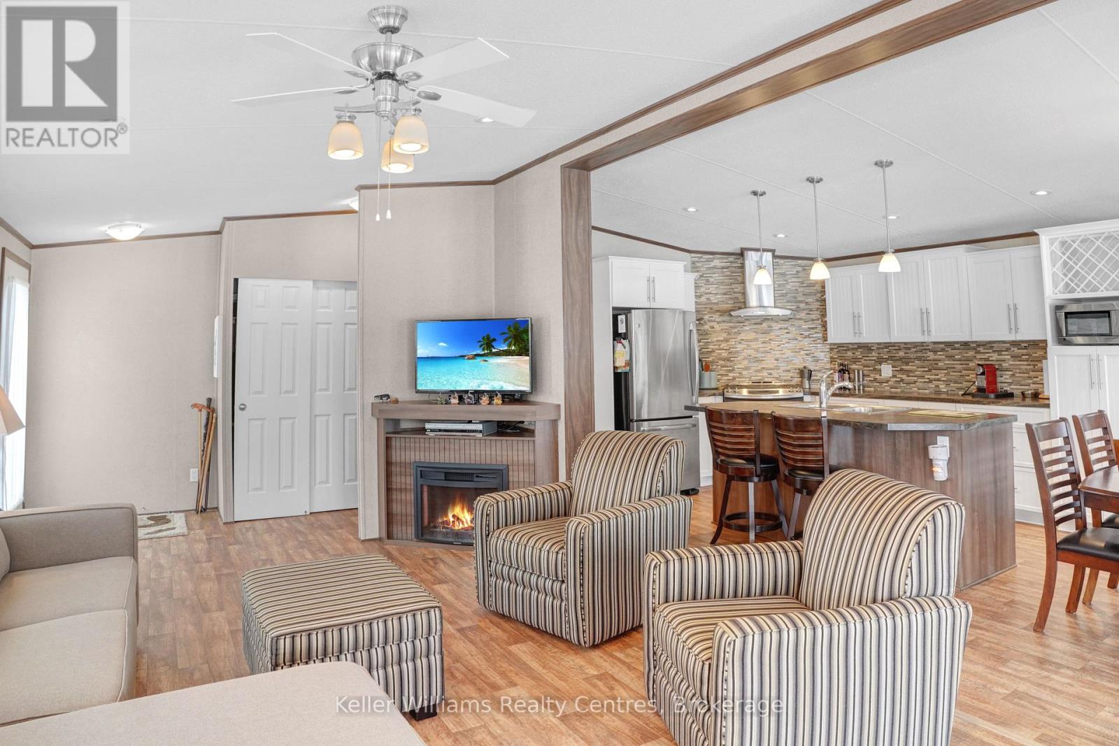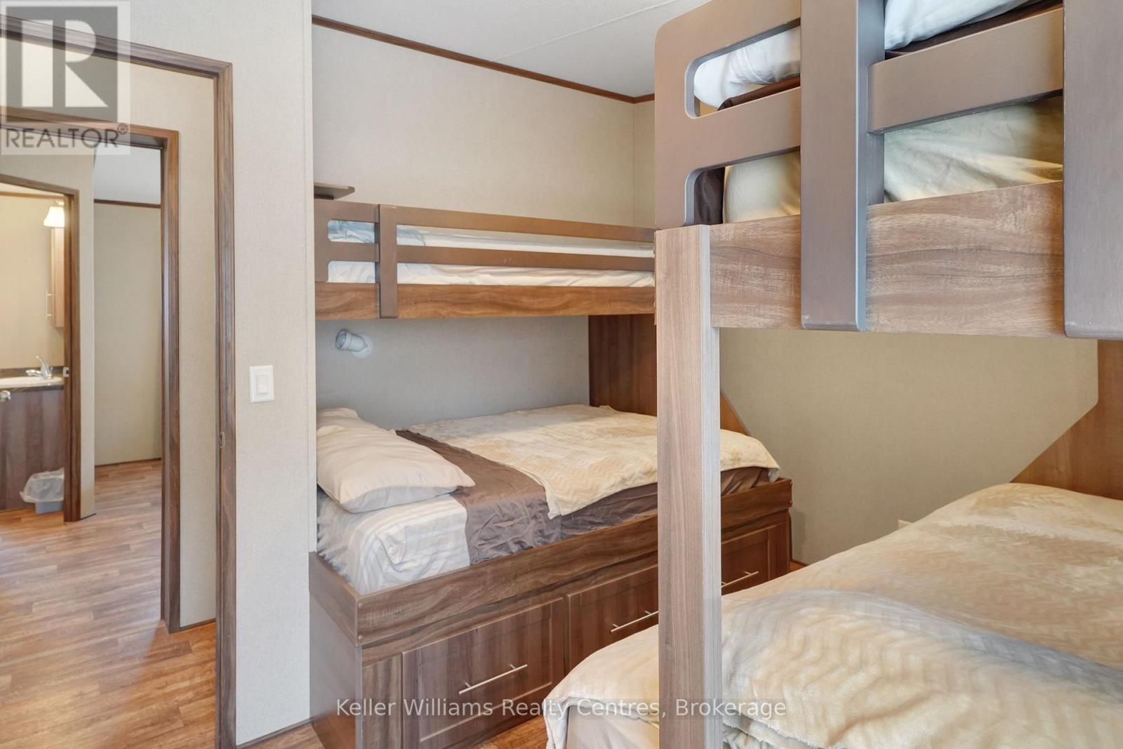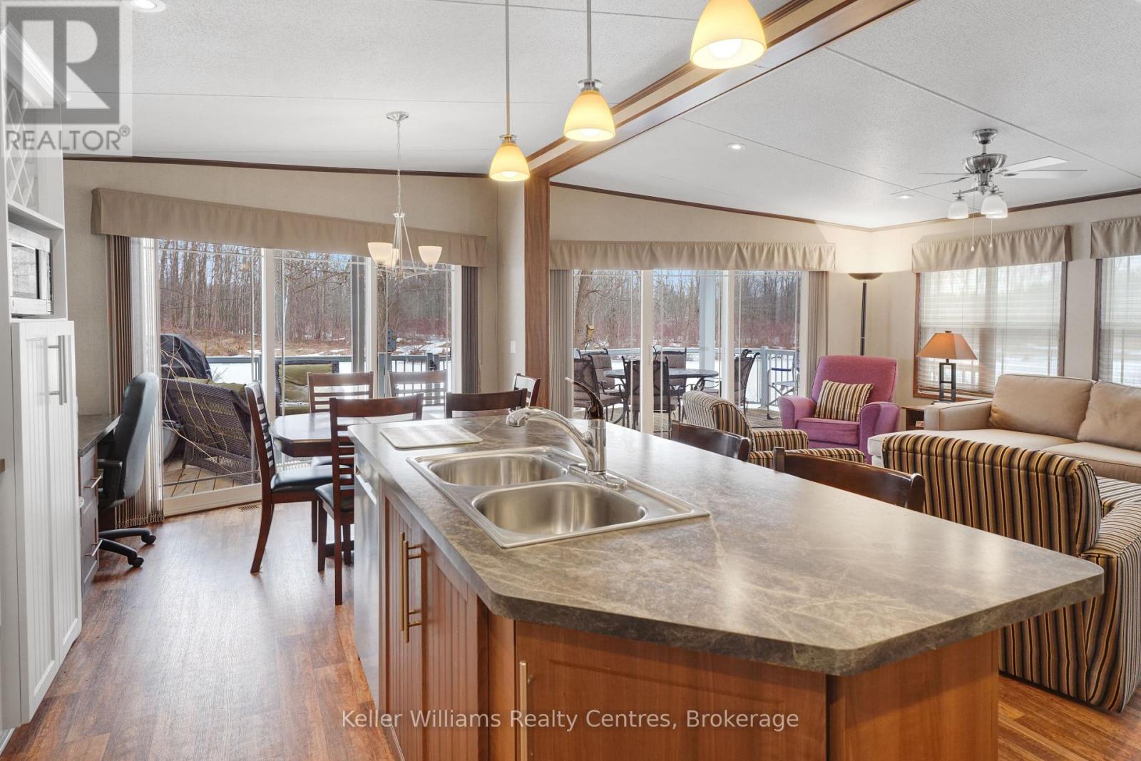 2026 park fees paid! This beautifully maintained 2016 Northlander Classic double wide park model offers exceptional direct waterfront living with a private dock in Fisherman's Cove, just minutes east of Kincardine. Situated on a private spring fed lake, it is only about 30 minutes from Port Elgin and the shores of Lake Huron.The spacious interior features two equal sized bedrooms, each with generous walk in closets. The master bedroom includes a private ensuite bathroom for added convenience. The open concept living and dining area is bright and inviting, highlighted by impressive full width (24') sliding glass doors that provide stunning panoramic water views and seamless access to a matching full width deck perfect for outdoor entertaining or simply relaxing by the water.The well equipped kitchen boasts modern stainless steel appliances, a large island with double sink, and ample counter space. Warm wood cabinetry and neutral tones create a welcoming cottage atmosphere throughout. Additional features include a second full bathroom and practical storage solutions.Ideal as a seasonal family retreat, this turnkey waterfront home combines comfort, style, and unbeatable lake access in a popular resort community with amenities including a beach, pools, and more. A rare opportunity- call today to schedule a private viewing! (id:64974)