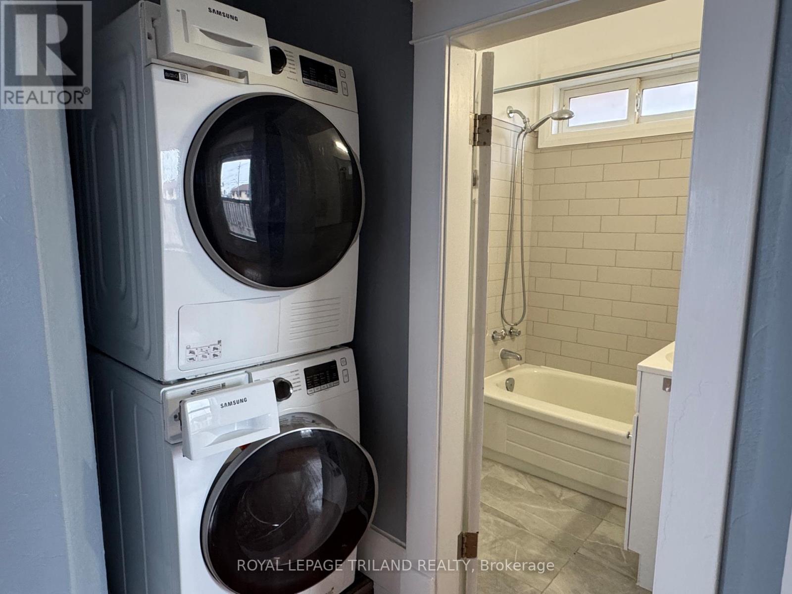 Welcome to 140 Arundell Street Main. This 2 bed 1 bath unit is perfect for a professional single person or couple. Enter the home off the large front porch into a foyer separating the living room by a beautiful antique glass door. The living room features loads of natural light and original hardwood flooring that flows into the dining room and the 2 bedrooms at the rear of the home. Off the dining room, you'll find a quaint kitchen with modern cabinets and plenty of storage. Tucked in beside the 4pc updated bath, you'll find the laundry with stacked washer and dryer. Parking is available but laneway is shared with the landlord. Rear yard is exclusive to the lower unit. Front lawn and front porch is exclusive to the main unit. Utilities are shared 60/40 upper/lower (id:64974)