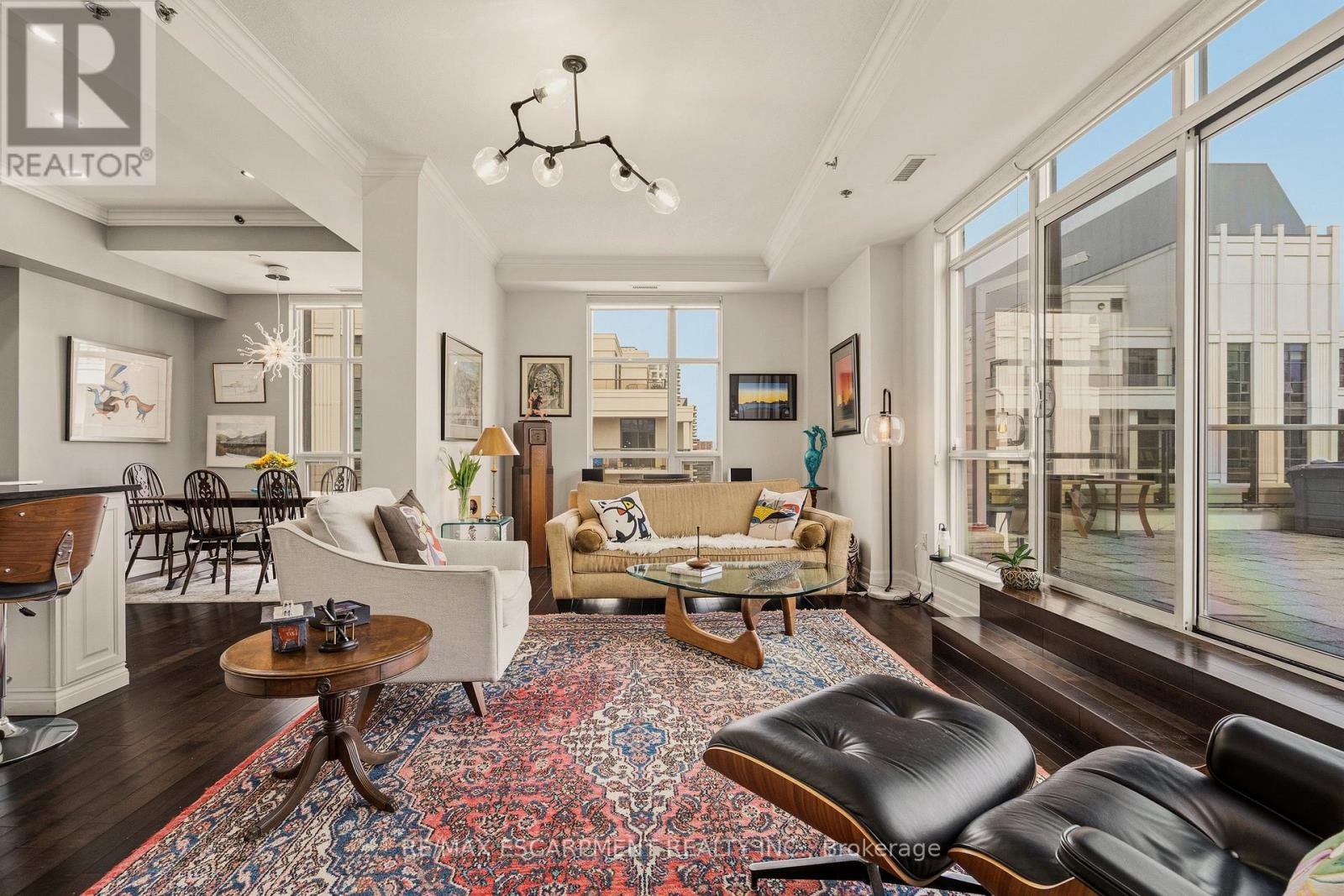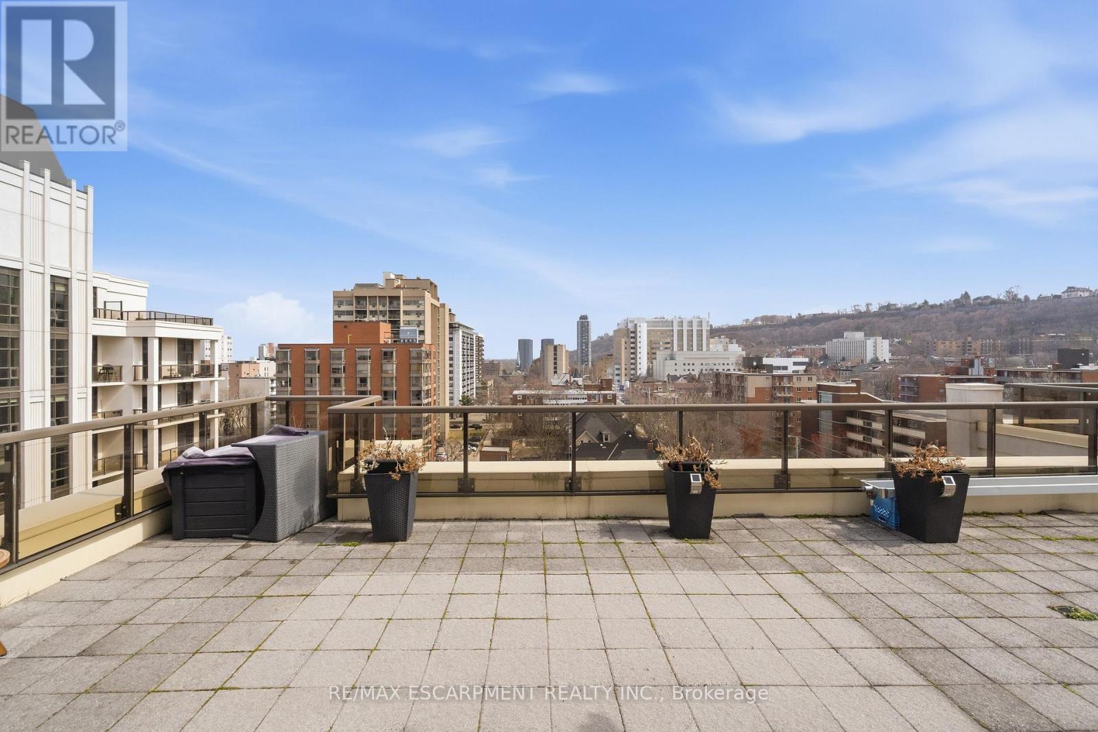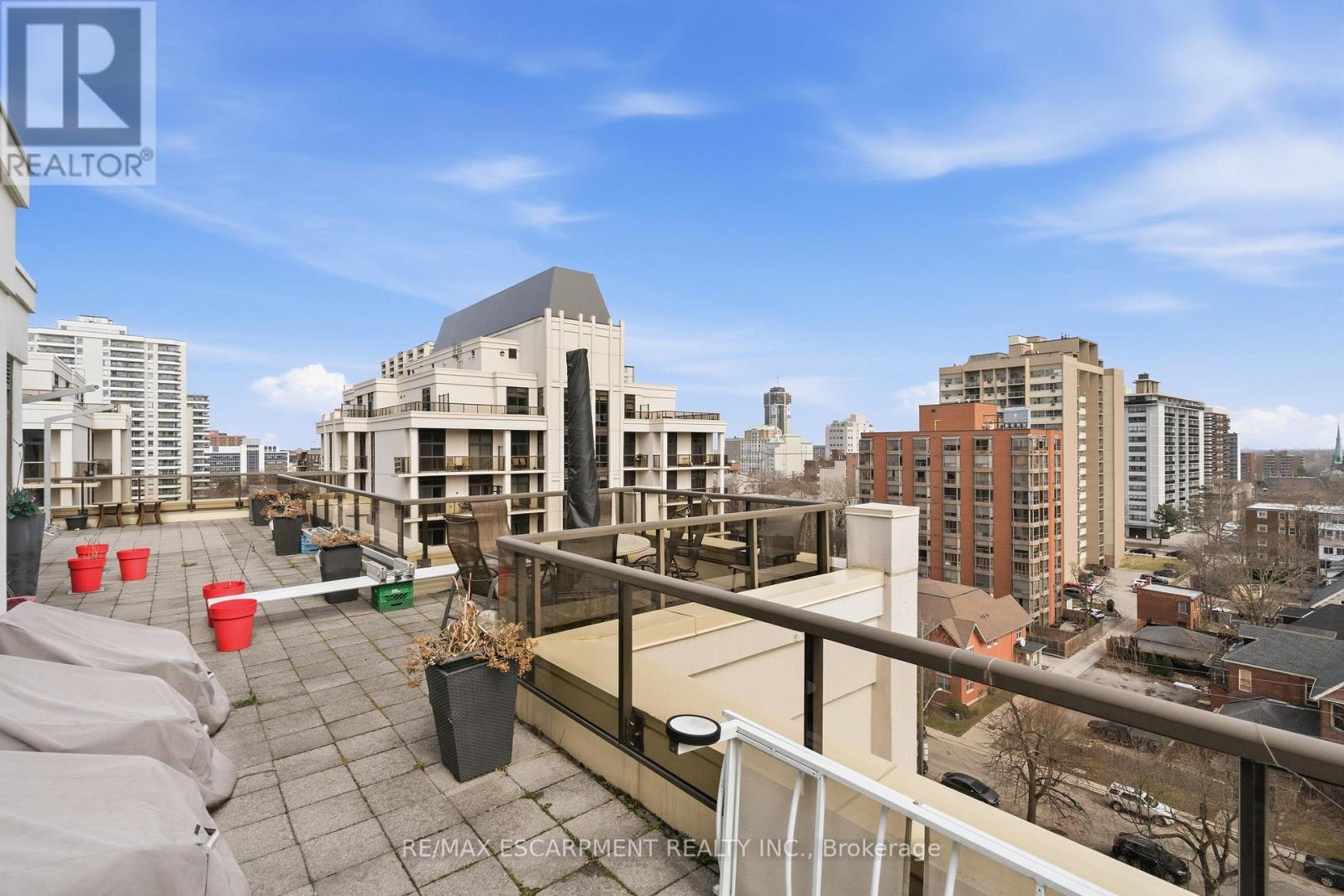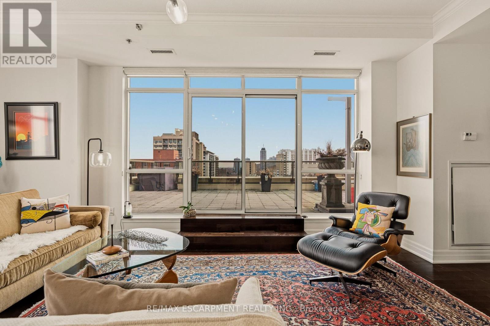 Perched above the vibrant core of downtown Hamilton, this extraordinary penthouse redefines condo living with an unmatched blend of space, style, and outdoor luxury. Spanning an impressive 1,740 sq ft, this rare corner suite is bathed in natural light and showcases sweeping south-eastern views of the city skyline and the stunning escarpment from virtually every angle. Step inside to a thoughtfully designed open-concept layout that offers both flow and distinction, with unique living spaces that cater to everyday comfort and effortless entertaining. The living room and kitchen are the heart of the home, beautifully appointed with high-end finishes, striking stone countertops, and a generous island with bar seating-perfect for gathering with friends or preparing meals in style. Floor-to-ceiling windows and a sliding glass walk-out seamlessly connect the indoors to an extraordinary outdoor experience. The crown jewel? An expansive private rooftop terrace of almost 1,400 sq ft-an entertainer's dream and a true urban oasis accessible from the living room, den, and primary bedroom. Whether you're hosting summer soirées, enjoying morning coffee, or unwinding under the stars, this space delivers a lifestyle rarely found in condo living. The bright and spacious primary suite features a 3-piece ensuite and a large walk-in closet. A well-proportioned second bedroom offers its own private balcony retreat, while the versatile den is ideal for a home office or guest space. A 4-piece bathroom, and convenient in-suite laundry complete this exceptional offering. Residents also enjoy a Party Room, Exercise Room and dedicated Bike Room. All of this in a prime downtown location, steps to Hamilton's best dining, shopping, schools, and transit-where city living meets elevated comfort in a truly one-of-a-kind penthouse residence. (id:64974)
