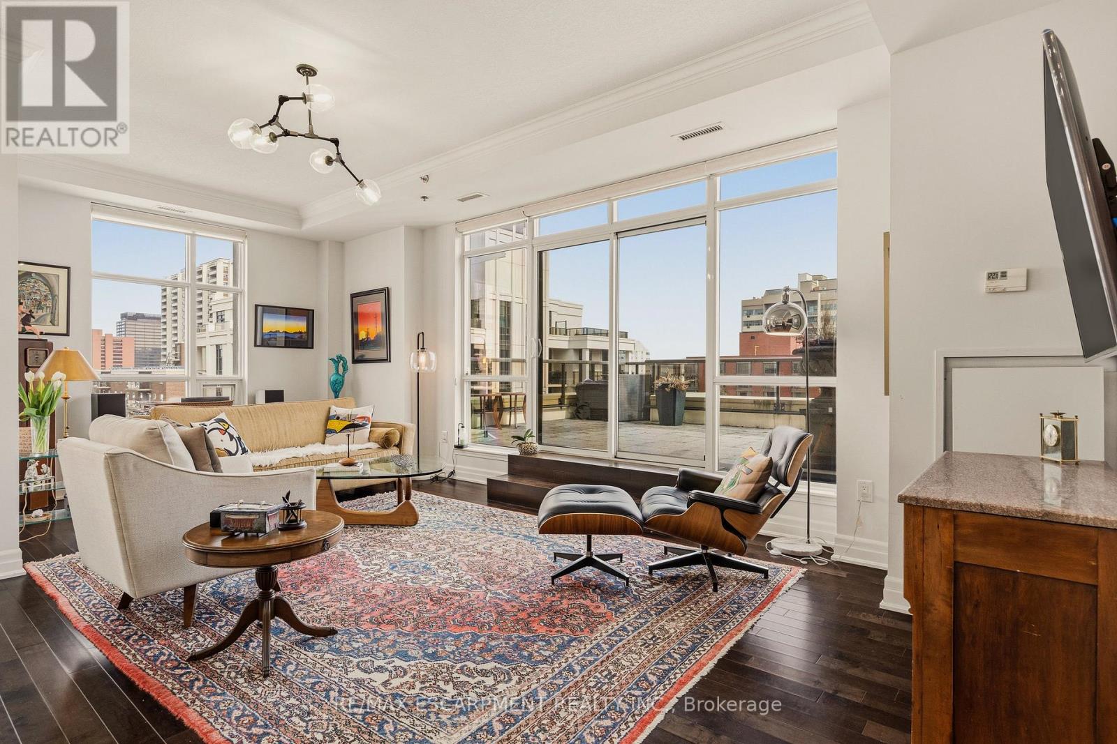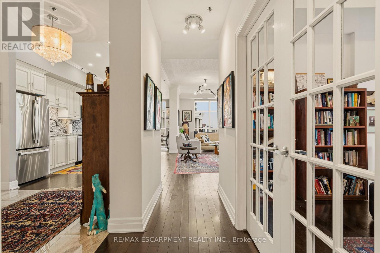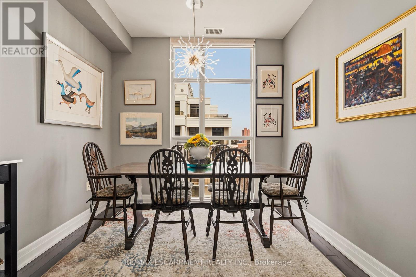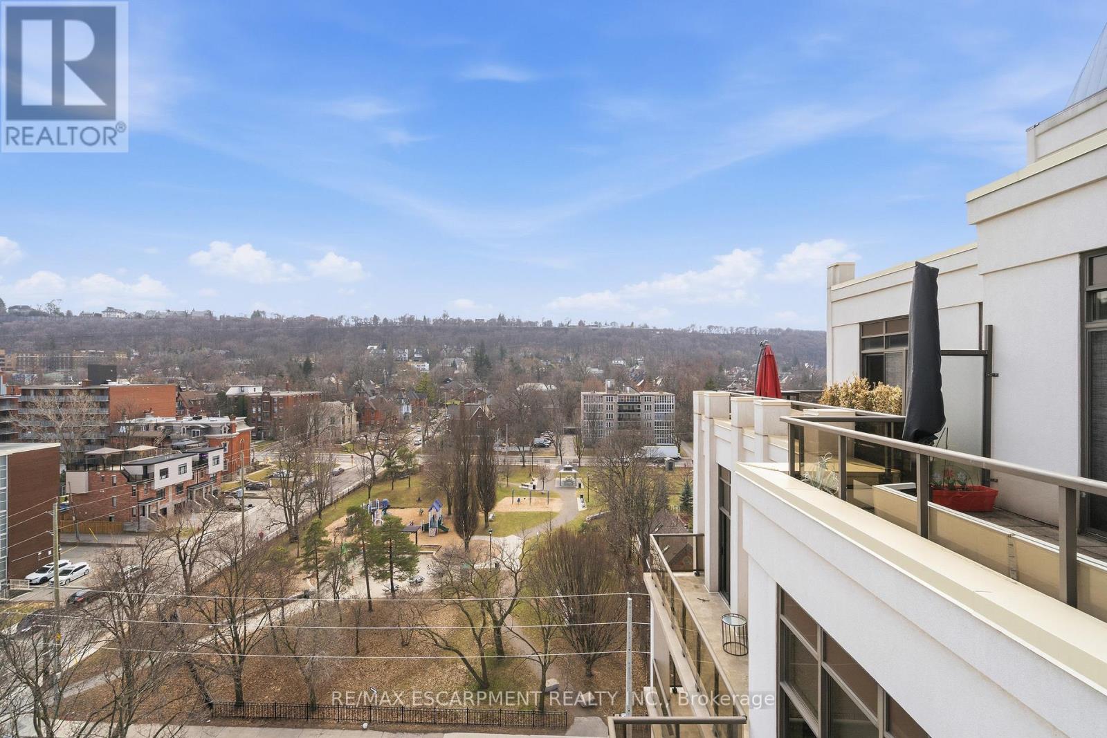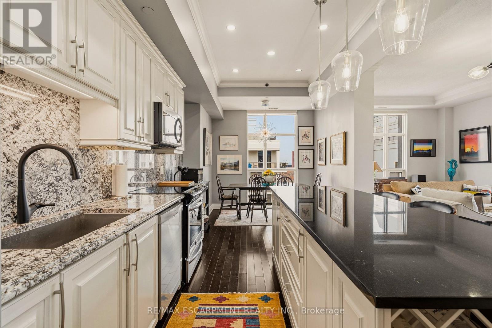 Perched above the vibrant core of downtown Hamilton, this extraordinary penthouse redefines condo living with an unmatched blend of space, style, and outdoor luxury. Spanning an impressive 1,740 sq ft, this rare corner suite is bathed in natural light and showcases sweeping south-eastern views of the city skyline and the stunning escarpment from virtually every angle. Step inside to a thoughtfully designed open-concept layout that offers both flow and distinction, with unique living spaces that cater to everyday comfort and effortless entertaining. The living room and kitchen are the heart of the home, beautifully appointed with high-end finishes, striking stone countertops, and a generous island with bar seating-perfect for gathering with friends or preparing meals in style. Floor-to-ceiling windows and a sliding glass walk-out seamlessly connect the indoors to an extraordinary outdoor experience. The crown jewel? An expansive private rooftop terrace of almost 1,400 sq ft-an entertainer's dream and a true urban oasis accessible from the living room, den, and primary bedroom. Whether you're hosting summer soirées, enjoying morning coffee, or unwinding under the stars, this space delivers a lifestyle rarely found in condo living. The bright and spacious primary suite features a 3-piece ensuite and a large walk-in closet. A well-proportioned second bedroom offers its own private balcony retreat, while the versatile den is ideal for a home office or guest space. A 4-piece bathroom, and convenient in-suite laundry complete this exceptional offering. Residents also enjoy a Party Room, Exercise Room and dedicated Bike Room. All of this in a prime downtown location, steps to Hamilton's best dining, shopping, schools, and transit-where city living meets elevated comfort in a truly one-of-a-kind penthouse residence. (id:64974)