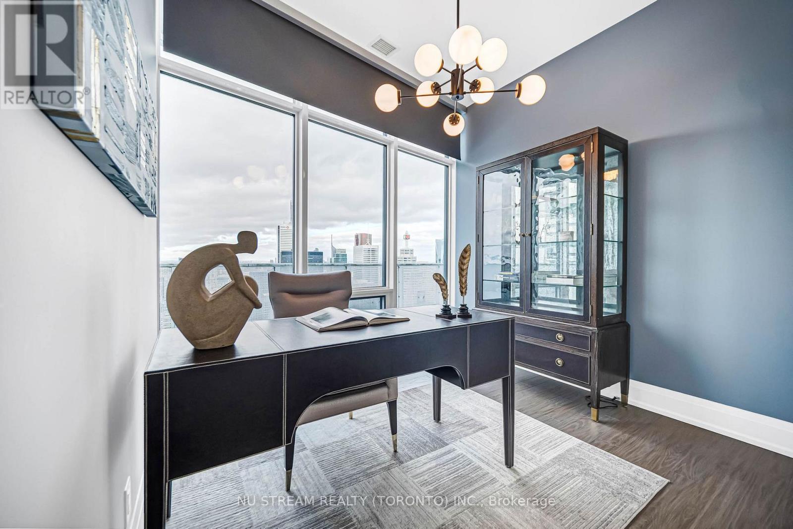 Experience unmatched lake and city views from this stunning penthouse in Toronto iconic 100 Harbour St. Boasting breathtaking views from wraparound floor-to-ceiling windows and an oversized corner balcony, An open-concept entertaining living space is complemented by a private library, while the split two-bedroom layout provides full ensuite baths and a spacious walk-in closet. The chefs kitchen features a central bar island, integrated Miele appliances, and sleek finishes, all set against engineered hardwood floors, soaring 10-foot ceilings. Remote-controlled window shades, elegant designer wallpaper complete the refined aesthetic. This penthouse offers the ultimate in Toronto downtown luxury living- truly a must-see!!! (id:64974)
