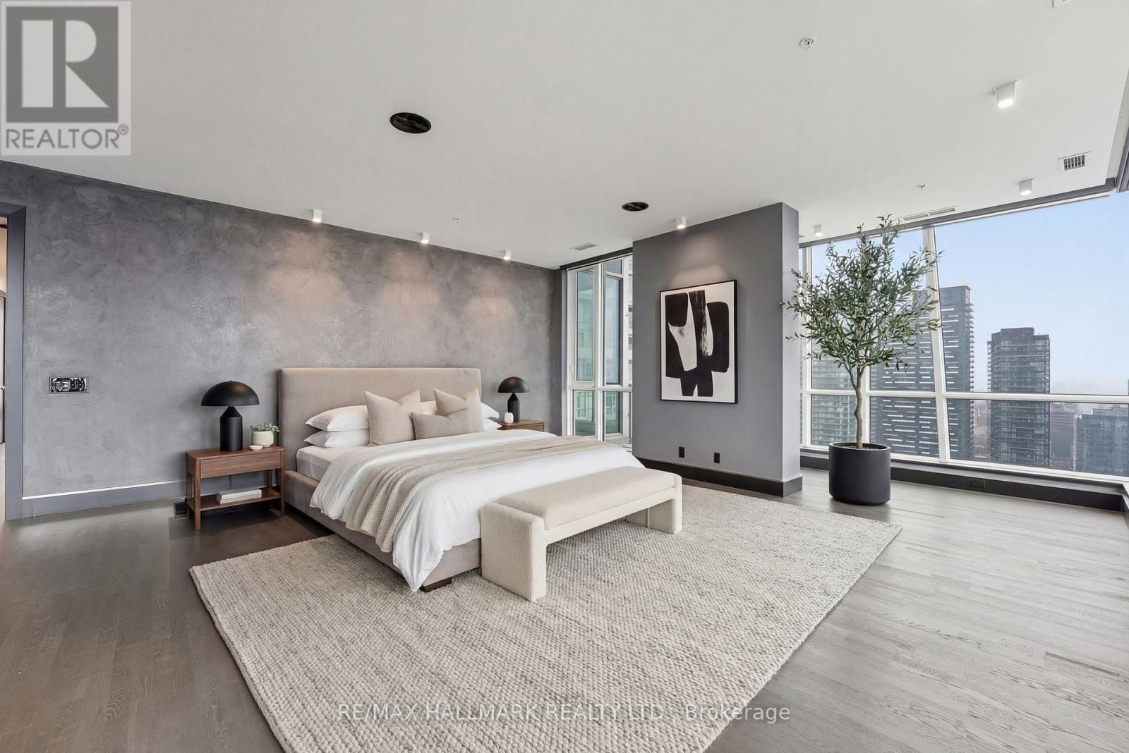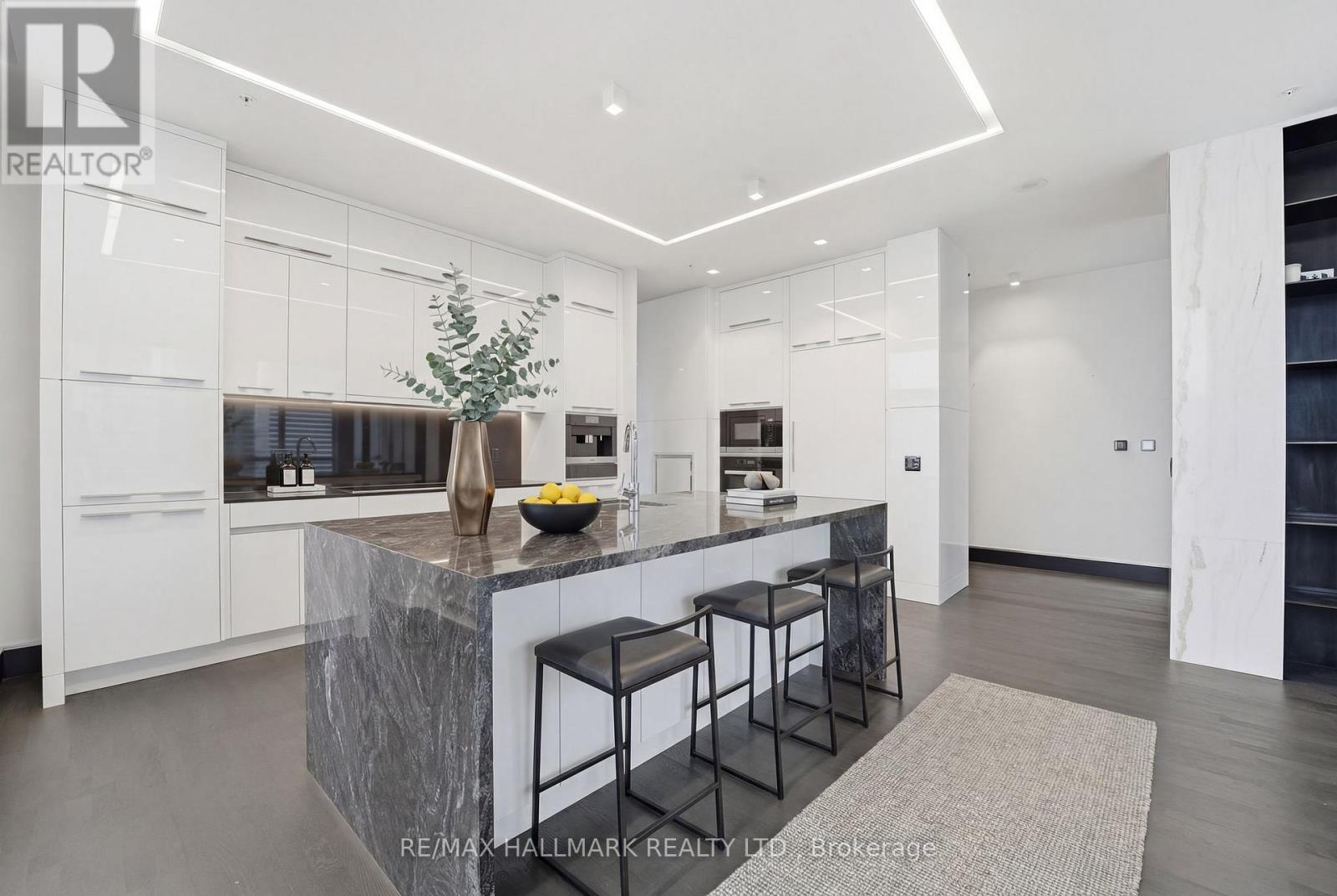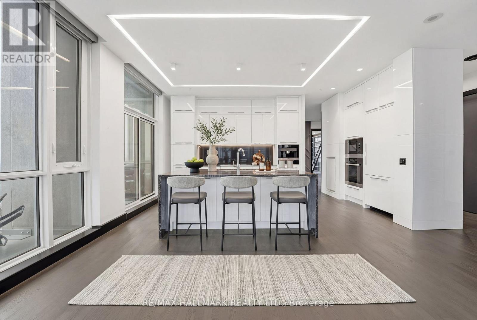 Penthouse 01 at 199 Richmond presents a rare opportunity to own one of only two penthouse residences in this exceptionally well-positioned building within the heart of the entertainment district. This three-bedroom, three-bathroom suite offers a refined layout with thoughtful upgrades throughout, combining clean contemporary design with elevated materials and finishes. The custom kitchen is designed for both function and presentation, featuring built-in Miele appliances, a waterfall island, and a combination of Caesarstone, granite, and quartz surfaces, all anchored within open-concept living and dining spaces that frame expansive city views. The primary suite is positioned as a private retreat, offering generous proportions, a walk-in closet, and a well-appointed spa-inspired bathroom, complemented by a built-in bookcase that adds both character and utility. South and west exposures provide sweeping views across the lake, the Rogers Centre, and Roy Thomson Hall, bringing natural light into the suite throughout the day. Finished with engineered hardwood flooring, marble detailing, and custom vanities, this residence presents a well-executed penthouse opportunity with direct access to the city's dining, cultural, and entertainment offerings just steps from the front door. (id:64974)