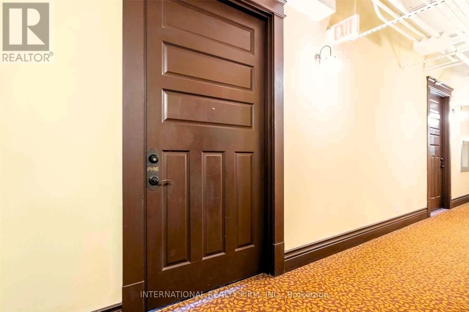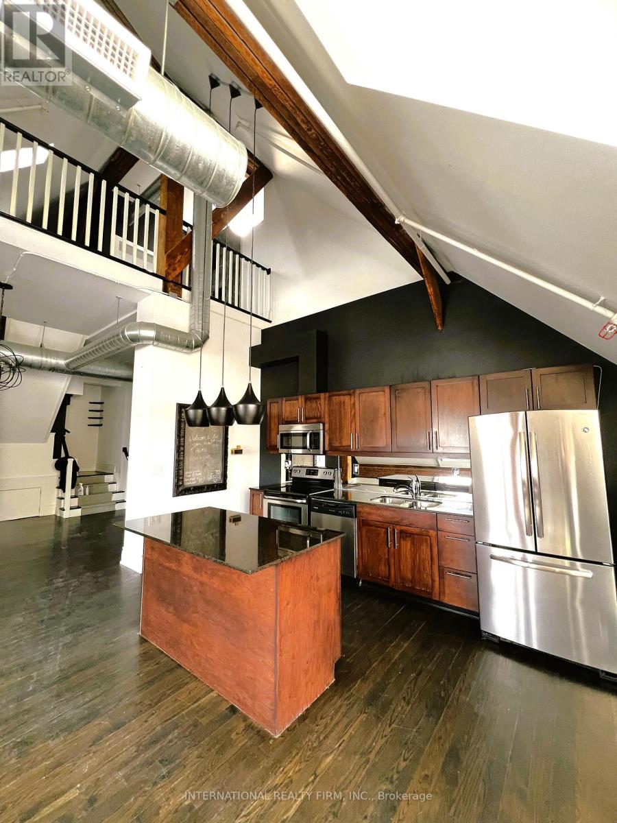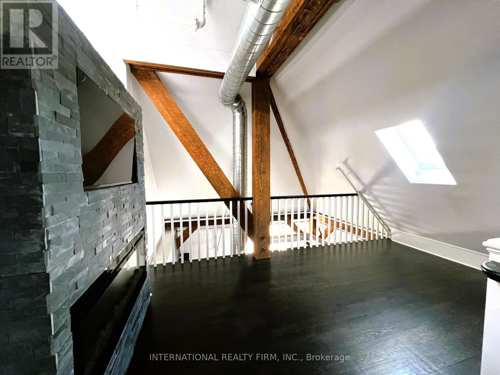 Experience the drama of true hard-loft living in PH16 at the iconic Stinson School. This isn't just a condo; it is 1,688 sq ft of architectural history. You are immediately greeted by soaring 20-foot ceilings, original exposed brick, and massive skylights that flood the space with natural light. The main floor is an entertainer's dream with rustic timber beams and warm hardwood floors. Upstairs, the layout separates "living" from "resting" with a dedicated executive den featuring a cozy fireplace-perfect for a home office. The primary retreat offers a massive walk-in closet and a spa-inspired 5pc ensuite. South-west facing, you get breathtaking sunset views over the Escarpment and city skyline. Walkable to the GO Centre and hospitals. This is a trophy property-don't miss it. (id:64974)