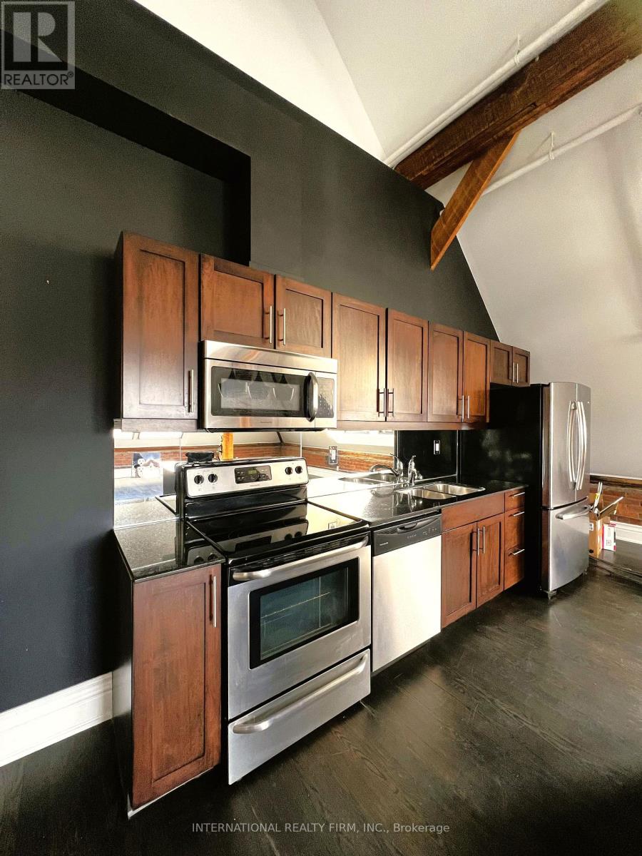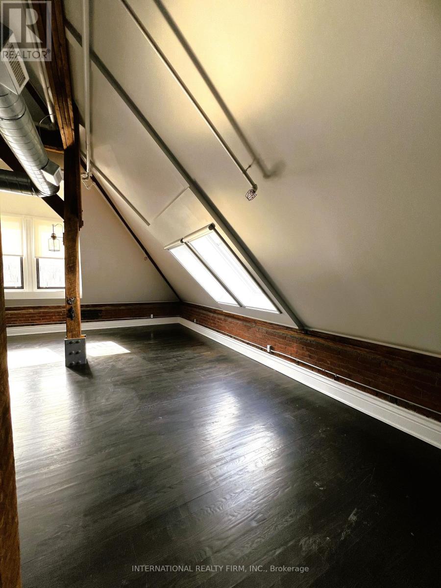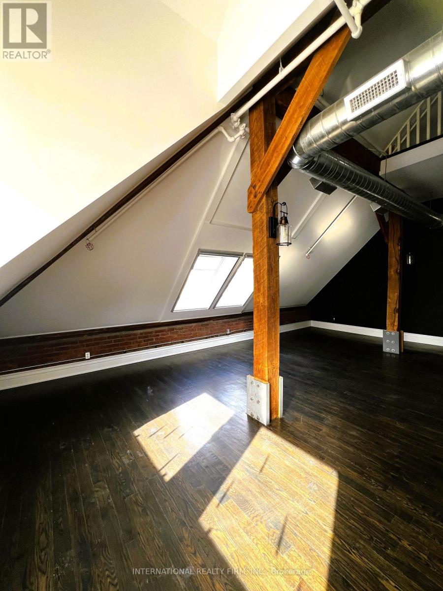 Experience the drama of true hard-loft living in PH16 at the iconic Stinson School. This isn't just a condo; it is 1,688 sq ft of architectural history. You are immediately greeted by soaring 20-foot ceilings, original exposed brick, and massive skylights that flood the space with natural light. The main floor is an entertainer's dream with rustic timber beams and warm hardwood floors. Upstairs, the layout separates "living" from "resting" with a dedicated executive den featuring a cozy fireplace-perfect for a home office. The primary retreat offers a massive walk-in closet and a spa-inspired 5pc ensuite. South-west facing, you get breathtaking sunset views over the Escarpment and city skyline. Walkable to the GO Centre and hospitals. This is a trophy property-don't miss it. (id:64974)