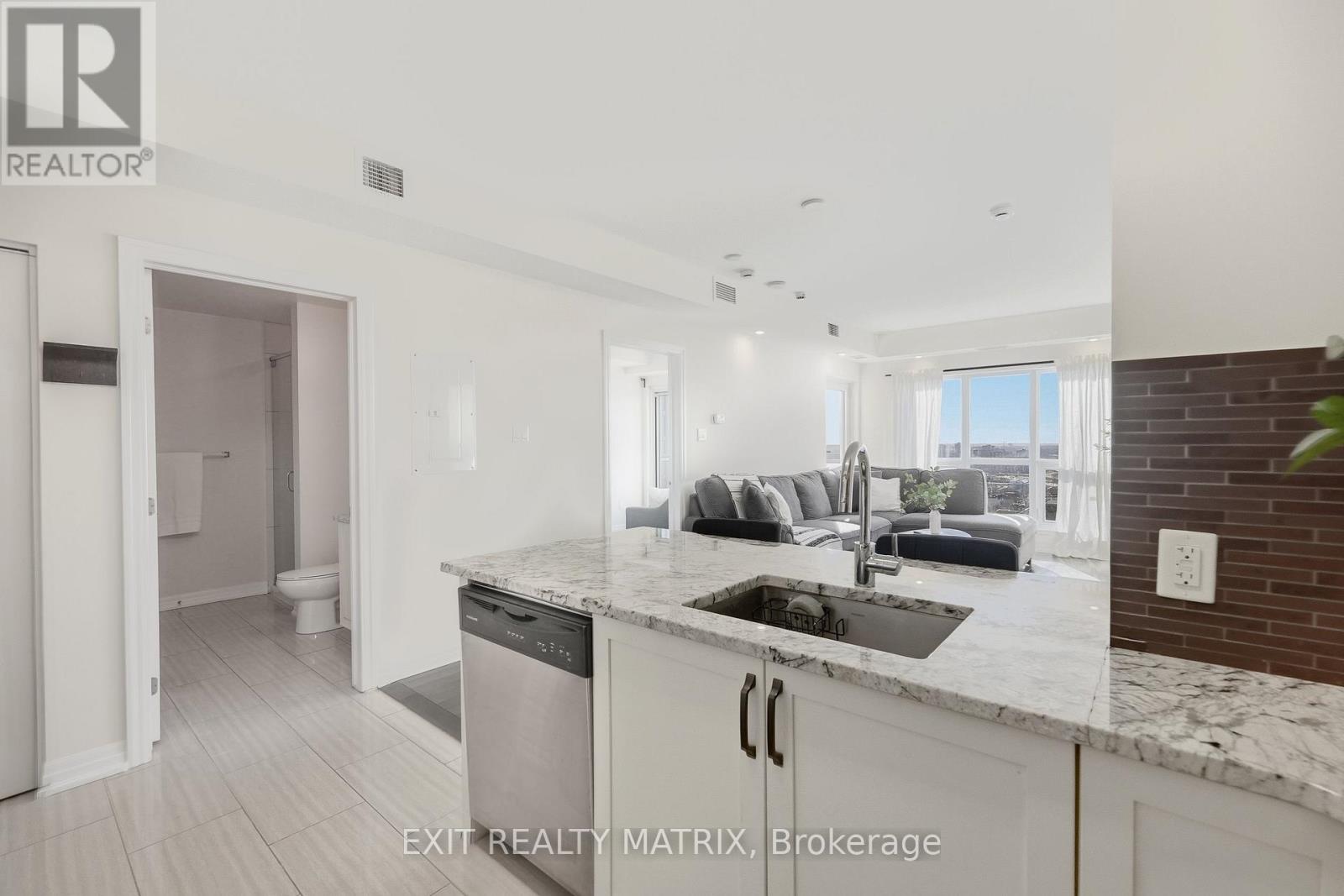 Top-floor penthouse living with beautiful city views and no neighbours above. Welcome to unit 2803 at 195 Besserer Street, a beautifully appointed 2-bedroom, 2-bathroom residence offering 960 sq. ft. of stylish living space in the heart of downtown. This bright, open-concept suite has just been freshly painted throughout and features hardwood flooring, tons of natural light, and a private balcony with a completely unobstructed view. The modern kitchen is equipped with granite countertops, a generous breakfast bar, and quality upgraded appliances, flowing seamlessly into the living and dining area. Offered fully furnished and move-in ready, the unit includes thoughtfully selected pieces such as a king bed and frame, sectional sofa, Samsung flat-screen TV, desk with office chair, and kitchen essentials etc. Furniture flexibility is available for buyers who may prefer select items removed. The primary bedroom features double closets and a private 4-piece ensuite, while the second bedroom offers versatility as a guest room, office, or additional living space. Additional highlights include in-suite laundry, a storage locker, and a premium underground parking space conveniently located near the elevators. Residents enjoy 24/7 concierge and security along with exceptional amenities, including an indoor pool, fitness centre, sauna, theatre room, party lounge, and a beautifully landscaped terrace with BBQs. Ideally located steps from the University of Ottawa, Rideau Centre, ByWard Market, transit, grocery stores, restaurants, and more, this penthouse offers an exceptional opportunity to experience elevated downtown living. (id:64974)