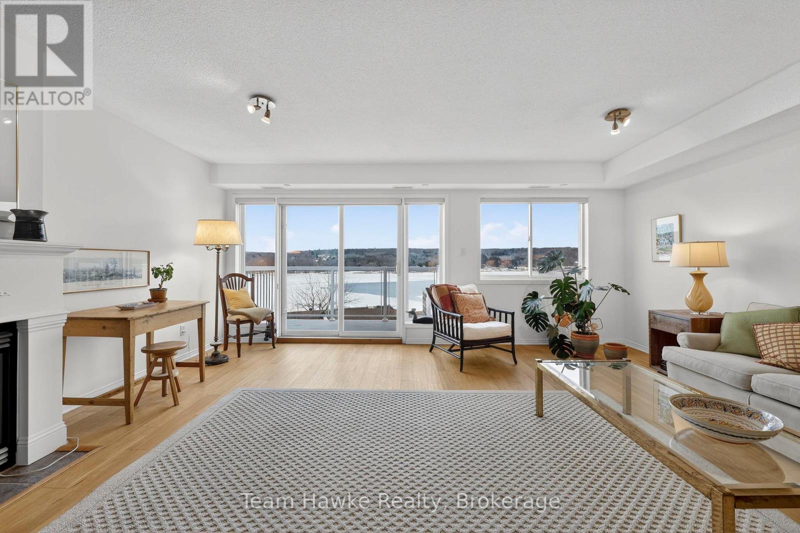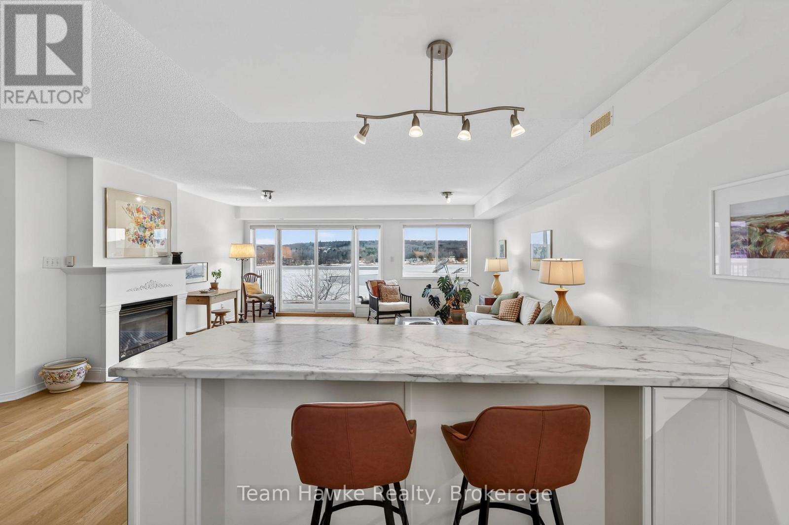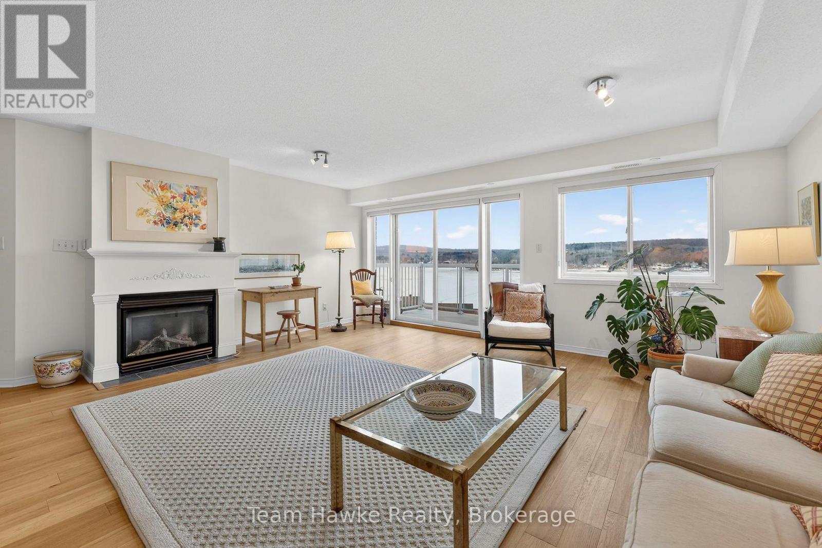 Looking for an effortless, lock-and-leave lifestyle? Look no further. This stunning 1,350 sq. ft. waterfront penthouse condo, offers, 2 spacious bedrooms and 2 bathrooms, with a bright open-concept layout designed for both entertaining and everyday comfort. Enjoy panoramic views of Georgian Bay from the principal living spaces, including the primary bedroom, which features a private ensuite and serene water views. Additional highlights include a breakfast bar, main-floor laundry, cozy gas fireplace, creating seamless flow throughtout. Step outside to your private deck-perfect for outdoor living, with direct access to a natural gas barbecue. Ideally located in the heart of Penetanguishene, you'll be within walking distance to downtown amenities, scenic waterfront trails, and the outdoor pavilion. This impeccably maintained building offers secure entry, a fitness room/library, two underground parking spaces, a storage locker, a private waterfront parkette and a spectacular rooftop terrace overlooking Georgian Bay. Experience luxury condo living that truly feels like home. (id:64974)