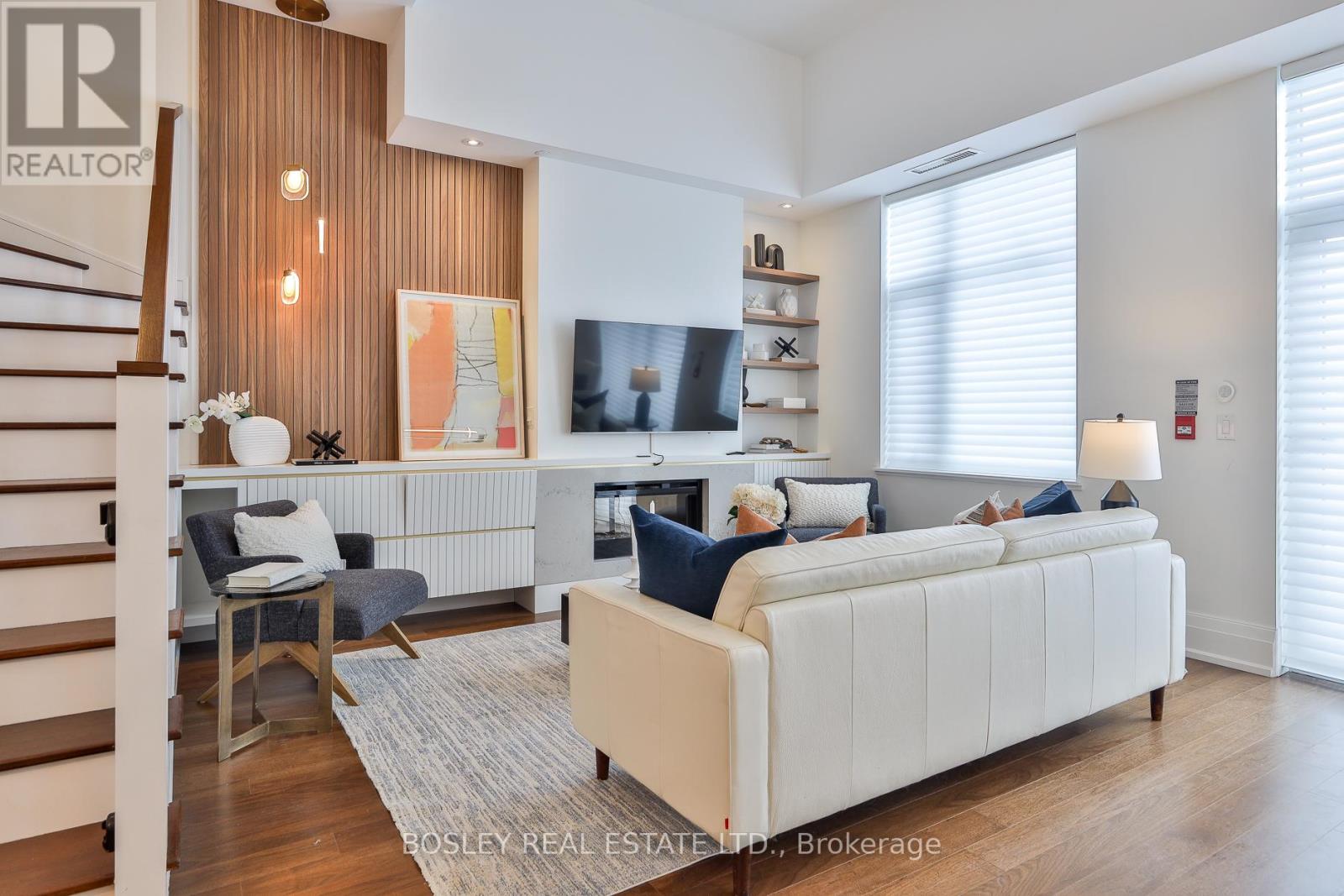 Welcome to The Upper House, a luxury townhouse boutique condo offering exquisite style & an space in family-friendly Leaside. This 2-storey home features 1462 SF of interior living plus a 275 SF terrace with BBQ gas line, for a total of 1737 SF. The open concept main floor impresses with soaring 12-ft smooth ceilings, custom Hunter Douglas remote controlled blinds and prefinished engineered hardwood flrs. A show-stopping, wall-to-wall custom entertainment unit anchors the living room, complete with bespoke cabinetry, pot lights, decorative wood panelling, contemporary fireplace with mantle & wall-mounted TV with statement light fixture. The dining area sits perfectly between the living room and terrace walk-out, making it ideal for dinners by the fireplace as well as enjoying abundant natural light while at breakfast. The modern chef's kitchen is outfitted with top-of-the-line appliances, including a panelled fridge, dishwasher, and pantry offering functionality symmetry. The main floor also includes a large den/office with a double-door closet, which can easily be converted to a third bedroom by adding a wall & glazed French door for privacy. Don't miss the main floor powder room. The upper level enjoys an oversized family room with a 2nd wall-mounted TV (all tvs included) for family movie nights. The principal bedroom features a walk-out to a second outdoor space, his & hers closets and a spa-like ensuite with a glassed-in shower, soaker tub, and double sinks. The 4 PC bath serves the 2 bdrm and family rm. This fabulous offering includes parking and locker. Note this is a pet-friendly building complete with a pet-spa and no size restrictions for your fur babies. A rare opportunity to own a refined townhouse with exceptional design and superior quality finishes (refer to attached Features & Upgrades) in the heart of Leaside! In the top-tier Rolph Rd ES, Bessborough Dr MS & Leaside High School district.property was staged but staging is no longer in place. (id:64974)