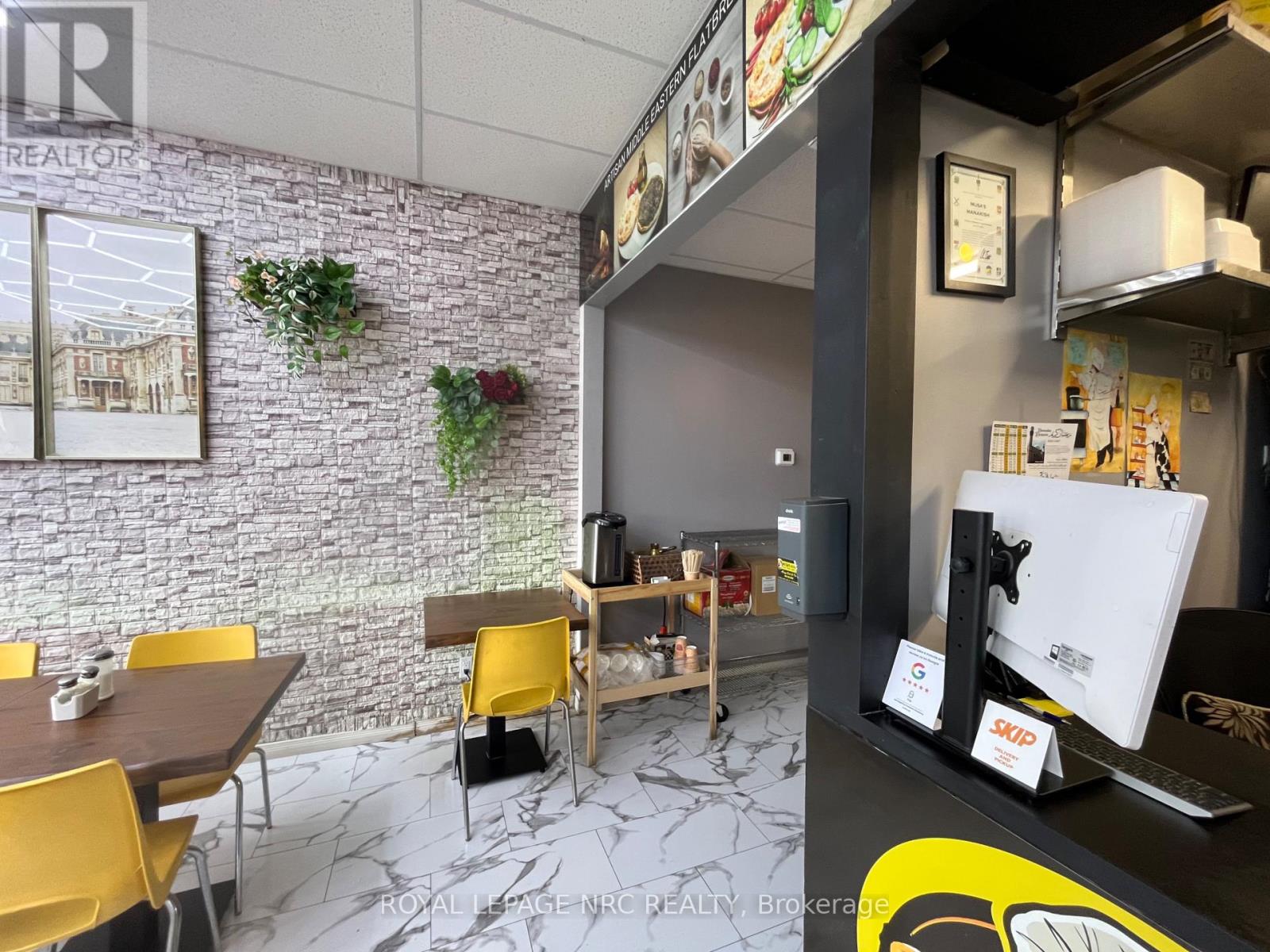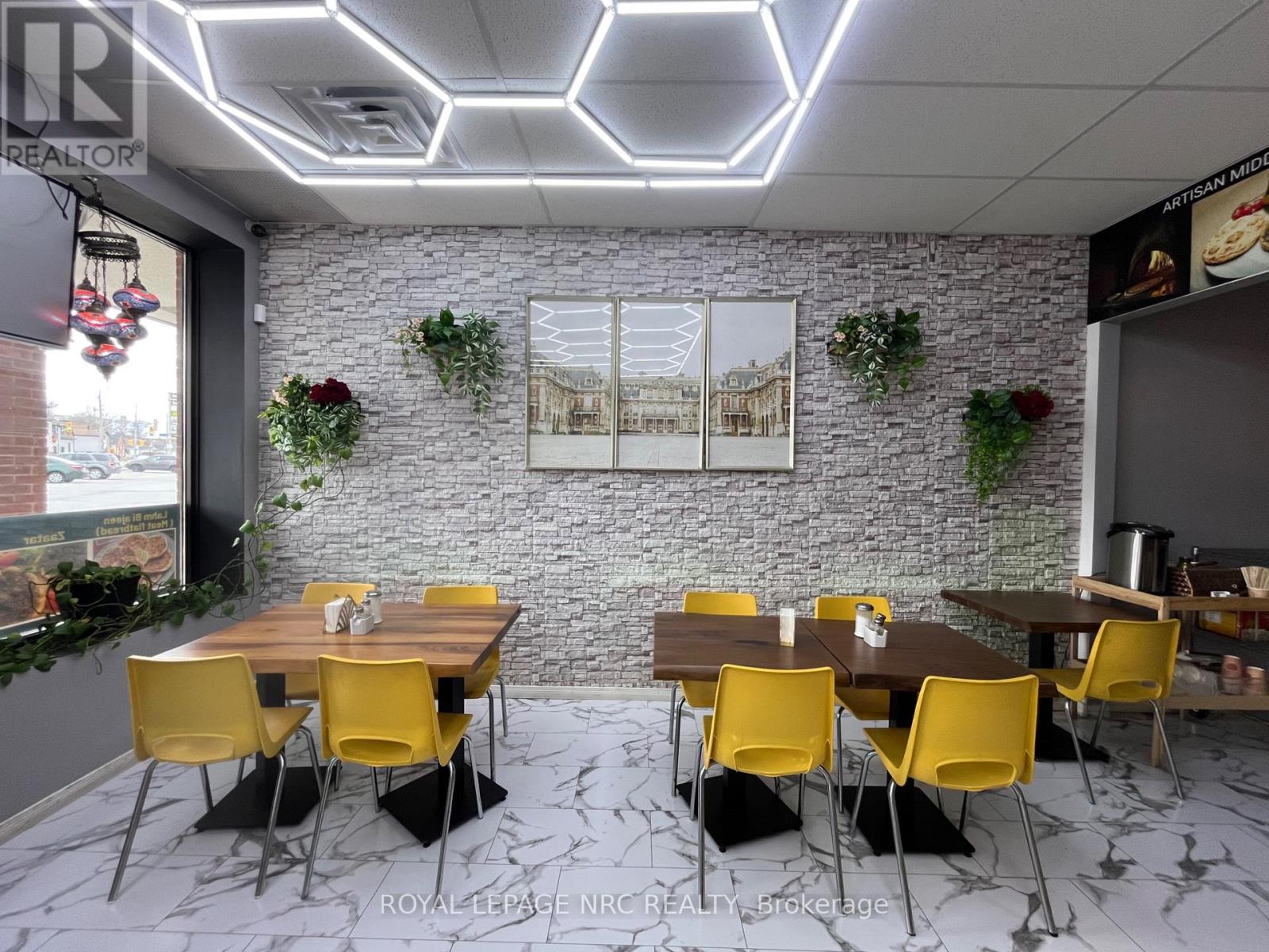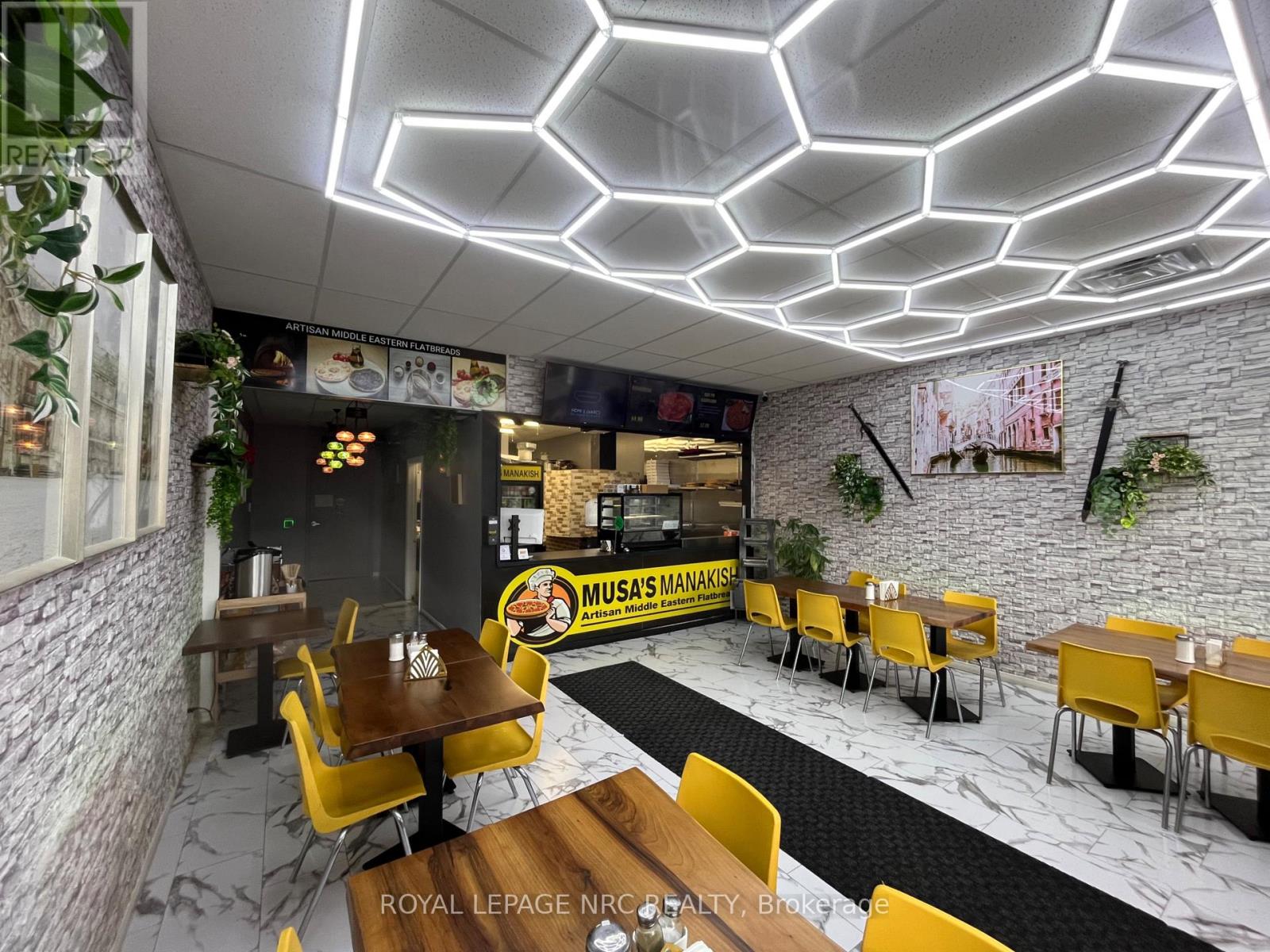 Excellent opportunity to acquire a well established Middle Eastern restaurant in a busy commercial plaza in St. Catharines. This turnkey operation specializes in authentic Middle Eastern cuisine including freshly baked manakish, flatbreads, and traditional Mediterranean dishes, attracting both dine in and takeout customers.The restaurant features a beautifully finished dining area with modern lighting, stylish seating, and a welcoming atmosphere, along with a fully equipped commercial kitchen highlighted by a stone Middle Eastern oven ideal for baking fresh manakish and flatbreads.Efficient layout with storefront exposure and ample plaza parking for customers. Excellent visibility and steady traffic make this an ideal opportunity for an owner operator or experienced restaurateur looking to continue or expand a successful concept. (id:64974)