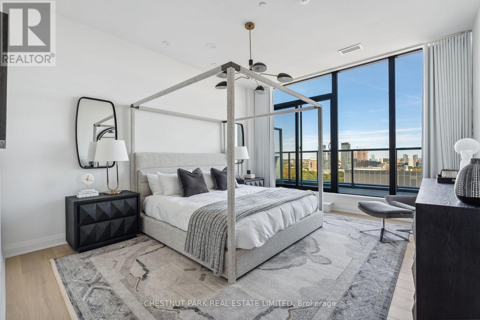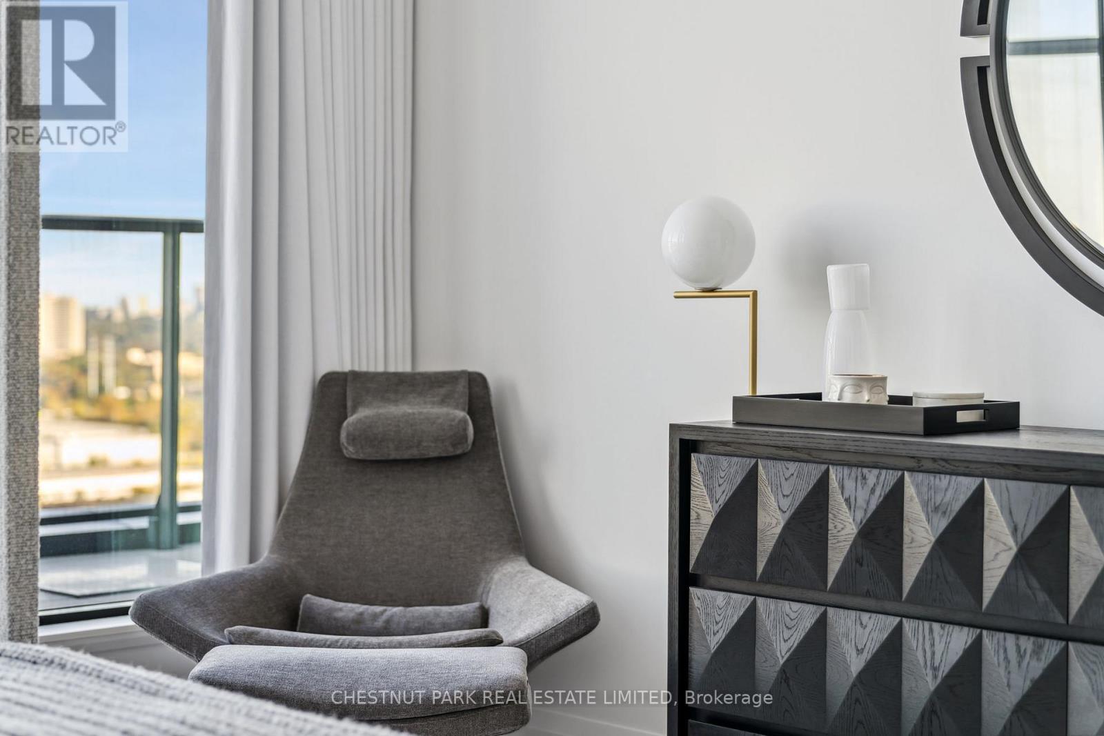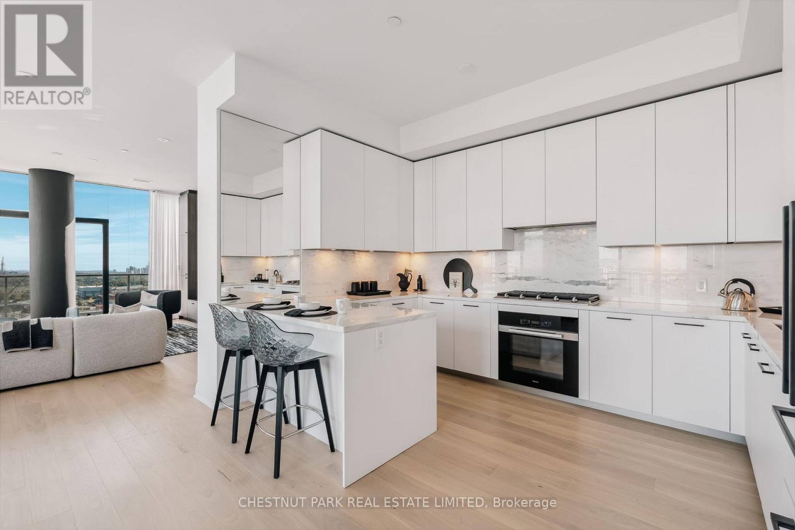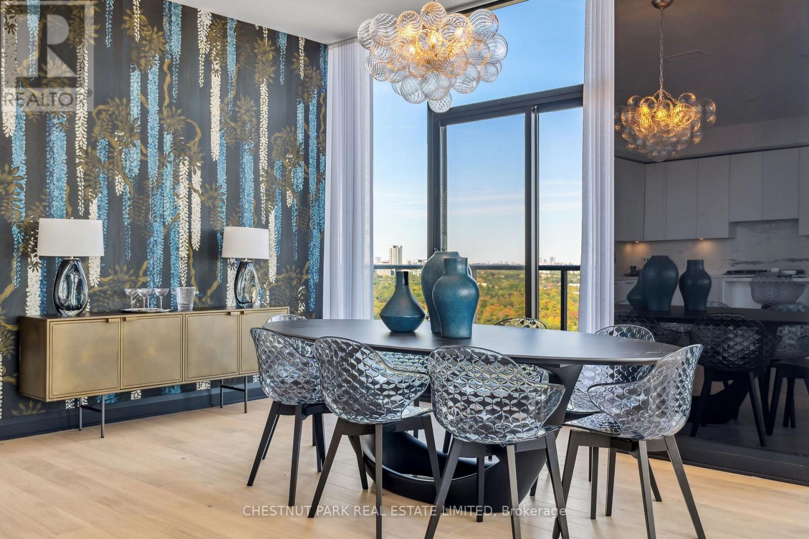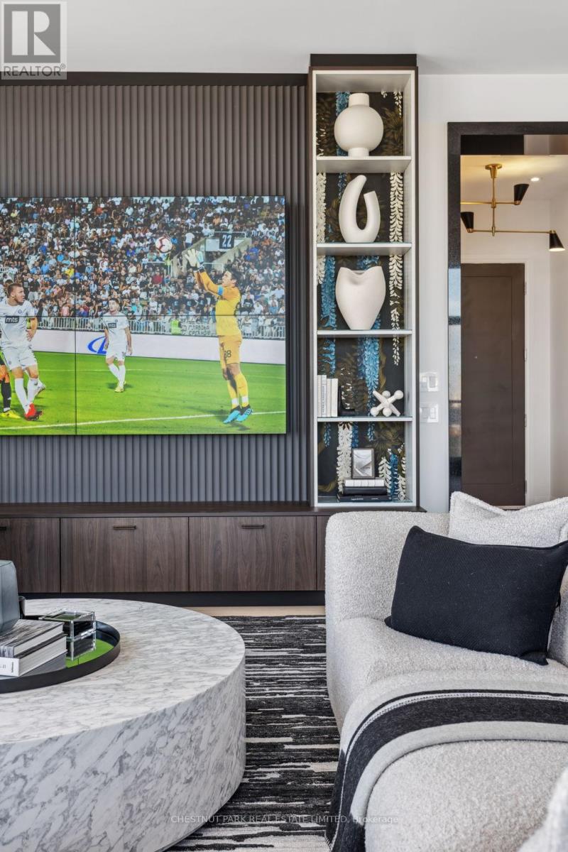 Welcome to this stunning southeast corner upper penthouse in the heart of Leaside, boasting sweeping city views, 10-ft ceilings, and floor-to-ceiling windows. Enter through diamond-patterned tile and a custom granite archway into the expansive great room, featuring custom fluted millwork, open shelving with Christian Lacroix wallpaper, and four seamlessly integrated frameless TVs. The south-facing balcony is perfect for entertaining, while the dining room offers a separate balcony and another Lacroix feature wall. The custom Trevisana kitchen dazzles with Calacatta marble counters, Miele appliances, a 5-burner gas cooktop, and breakfast bar seating. The primary suite includes a private balcony, walk-in closet, and spa-like 6-pc ensuite. A guest bedroom offers its own walk-in closet and 3-pc ensuite. With black granite archways, glass walls, Calacatta finishes, and elegant hardware throughout, this home is a true slice of heaven in the sky. (id:64974)