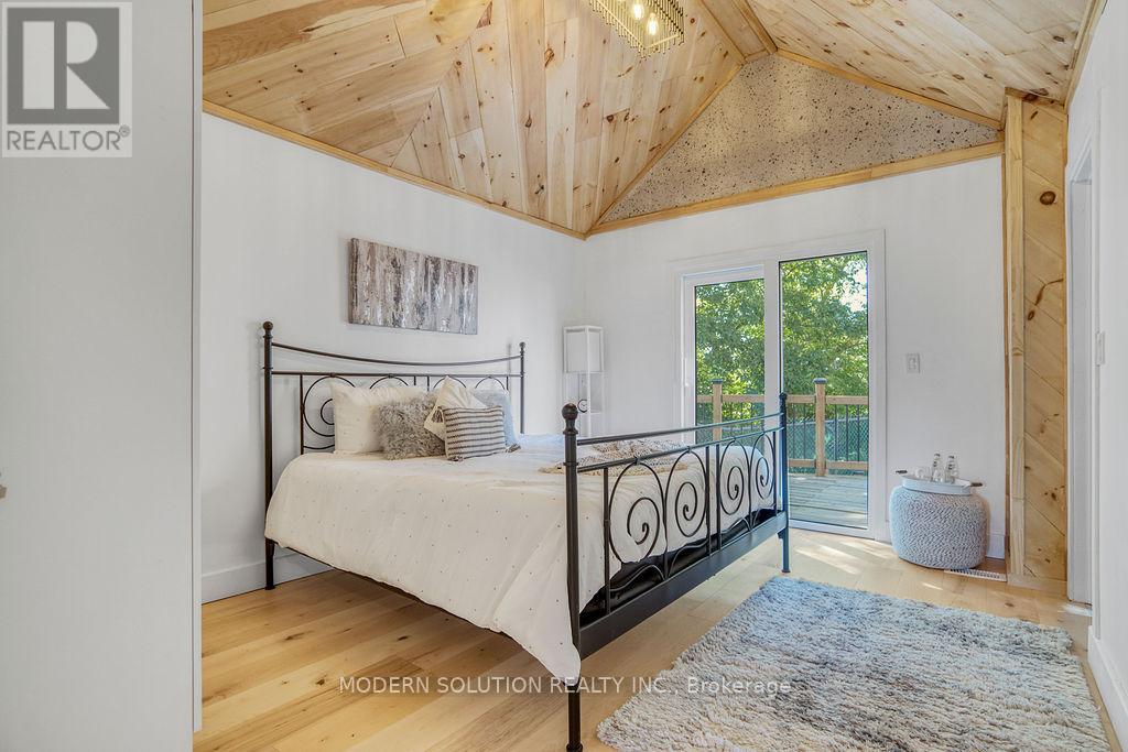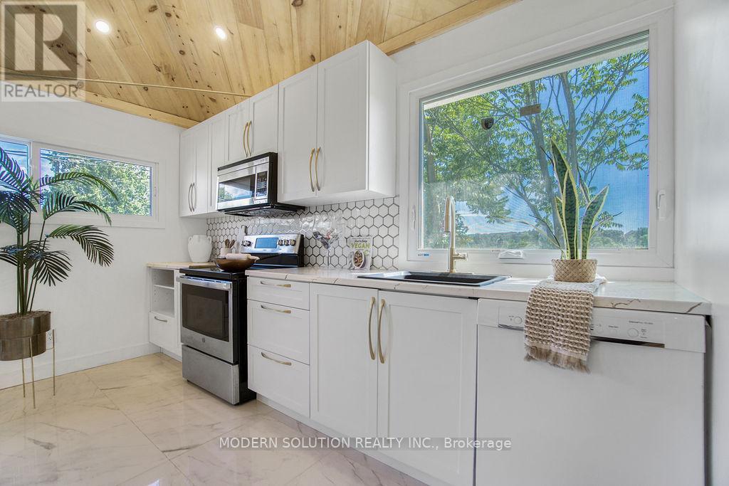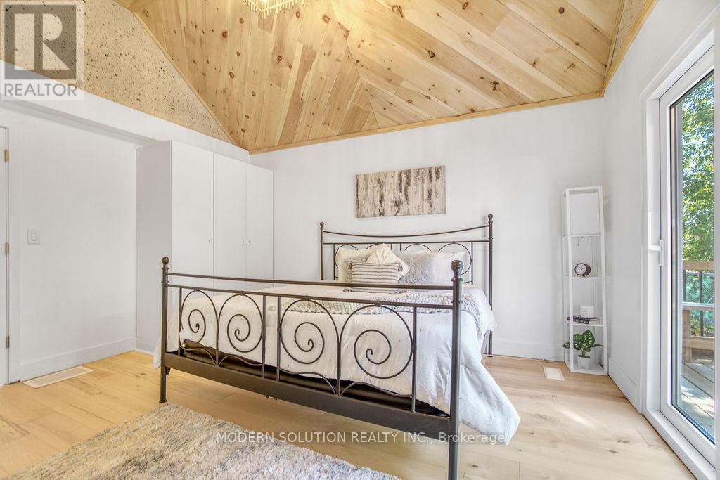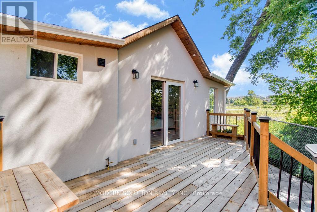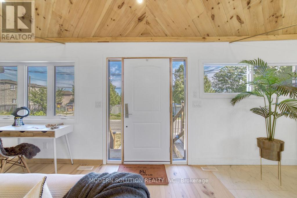 Welcome to 43 Harmony Ave. The main level features kitchen, living room, 2 bedrooms, 2 bathrooms, and a laundry room. The smaller bedroom can be used as a flex place office, or den otherwise. The interior boasts a stunning Open Concept design, complete with a Customized Reinforced Pine Wood Cathedral Ceiling adorned with Chandeliers, Hardwood Flooring, Porcelain Tiles, a spacious Primary Bedroom with a 4-piece Ensuite and walkout to the deck. The entire home has undergone professional renovations in 2023/2024, including updates to the A/C, Tankless Water Heater, Electrical system, Roof, Eavestroughs, Windows, Outdoor Pot & LED lights, parging all around, reinforced back & front decks, and completed Landscaping. Basement is separate. Additionally, the large main living space features ample room for work stations and desks if need be. Utilities flat 150$/month. (id:64974)